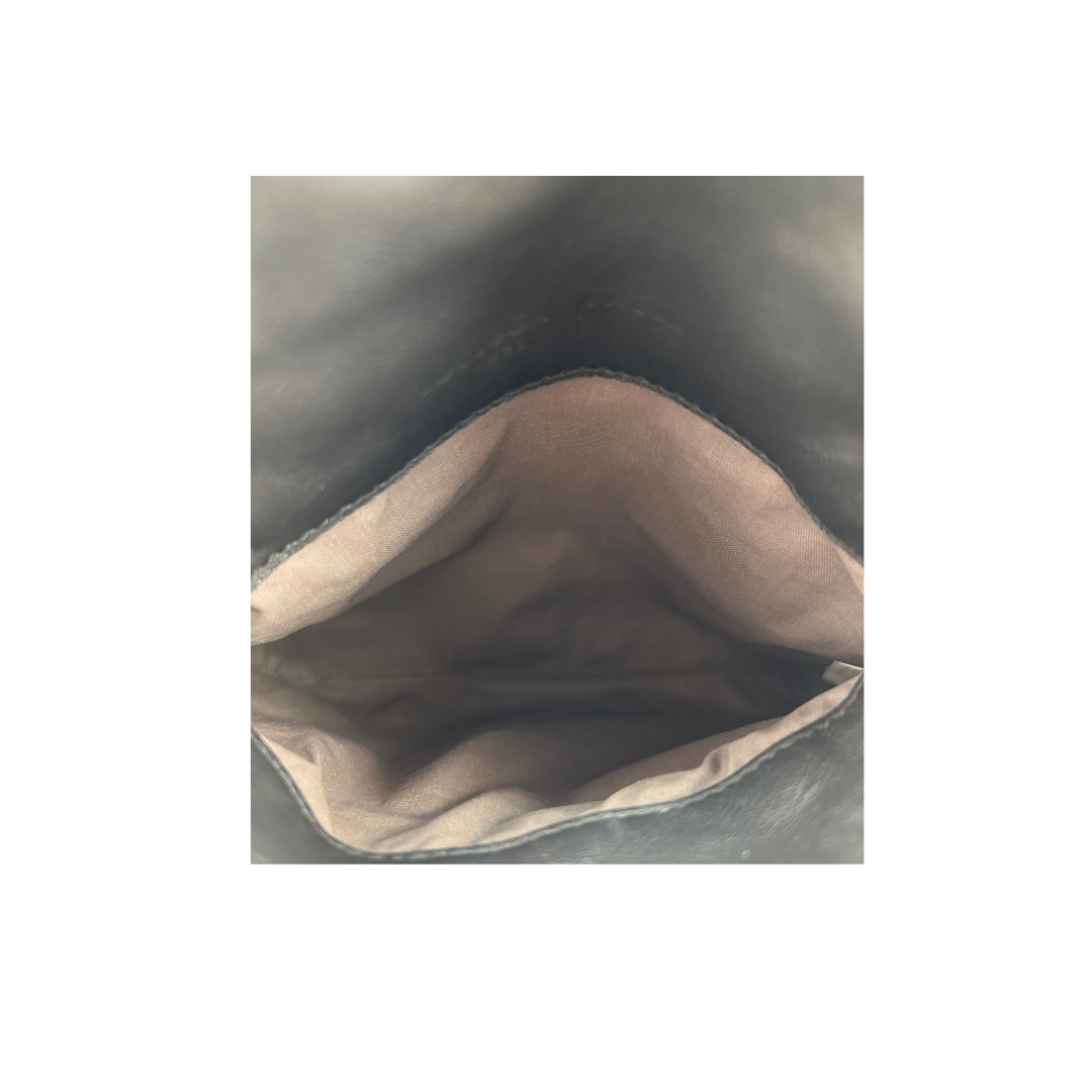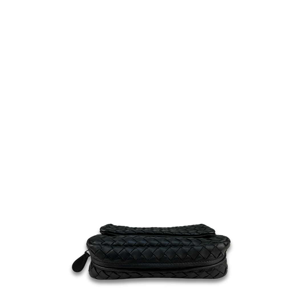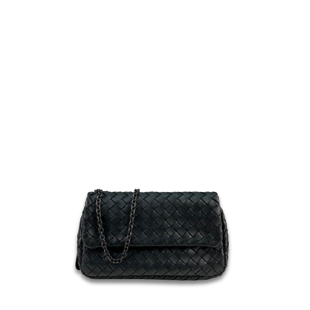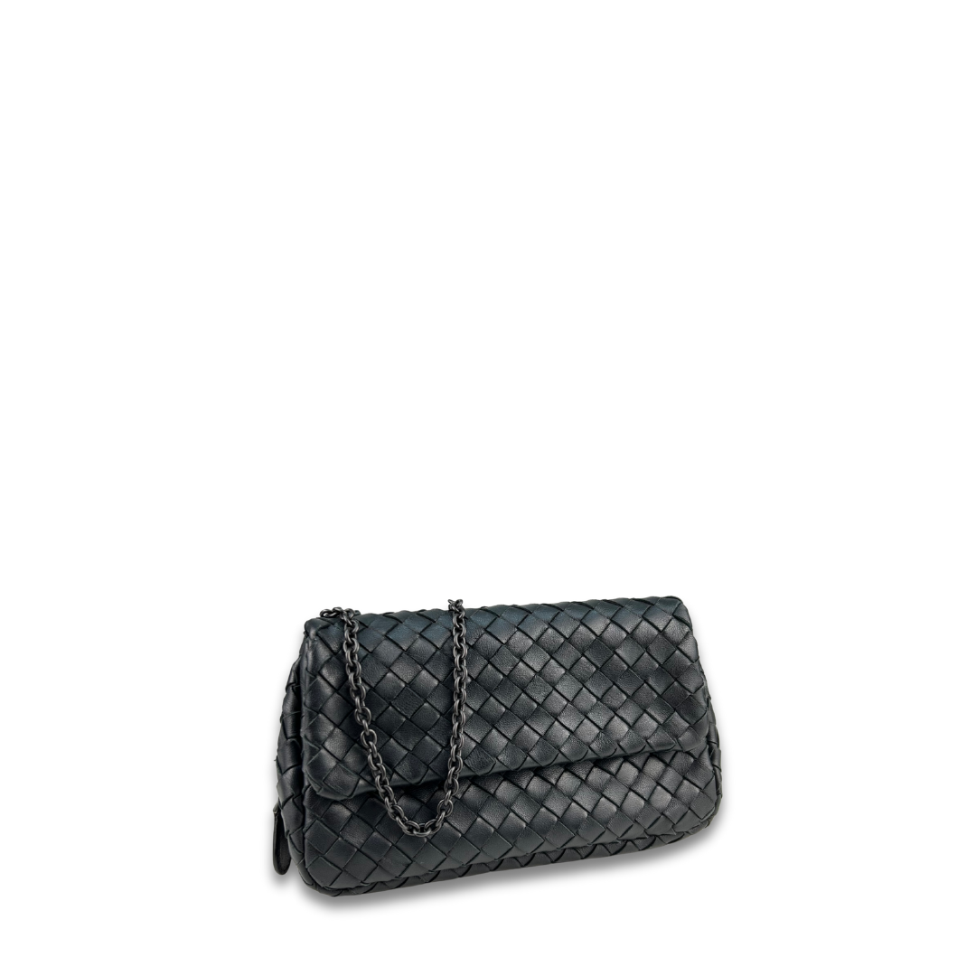 Black intrecciato woven nappa leather exterior, brown suede interior and matte black metal hardware. Features detachable chain strap, flap closure, interior side wall pocket, zipper compartment at base, and interior 3 card slots. Includes certificate of authenticity.