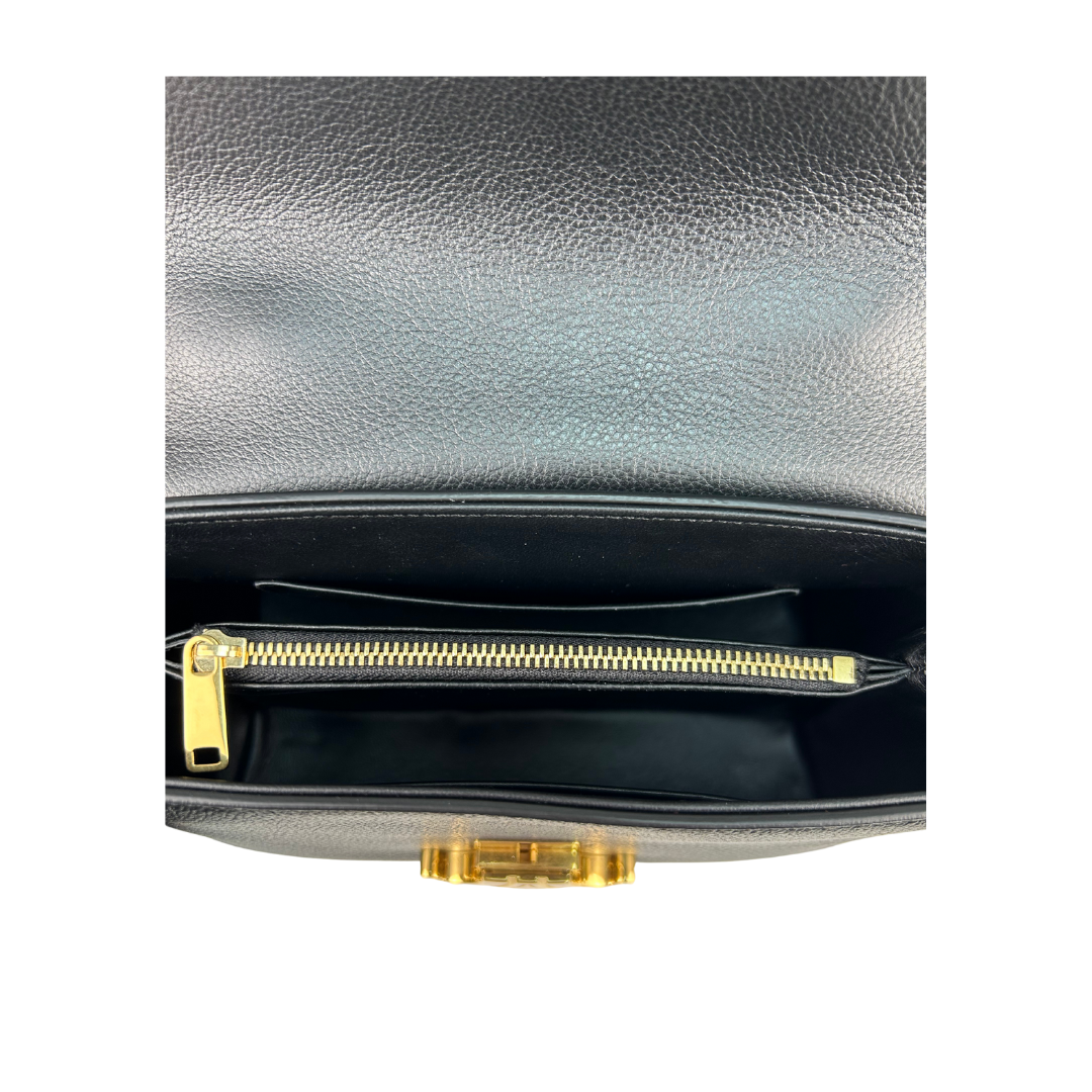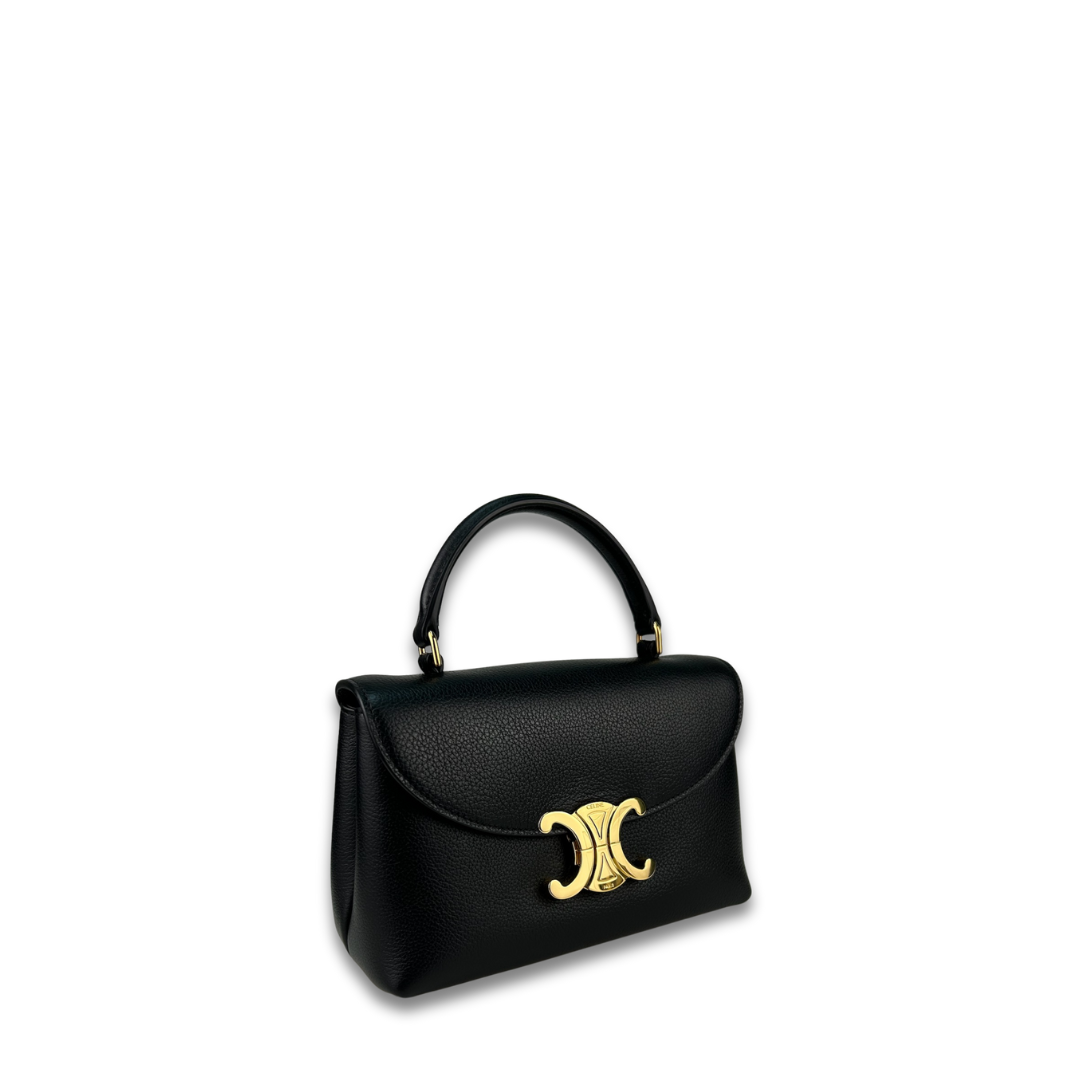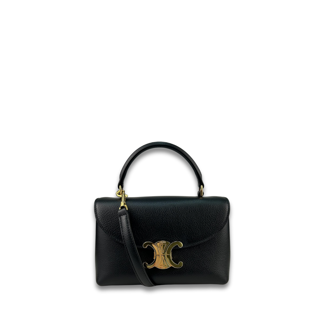 Black calfskin exterior with tonal lambskin interior and gold-tone hardware. Features Triomphe push-clasp closure, top handle, detachable and adjustable shoulder strap, divided interior with central zipper pocket, and 2 interior patch pockets. Includes certificate of authenticity and original dust bag.