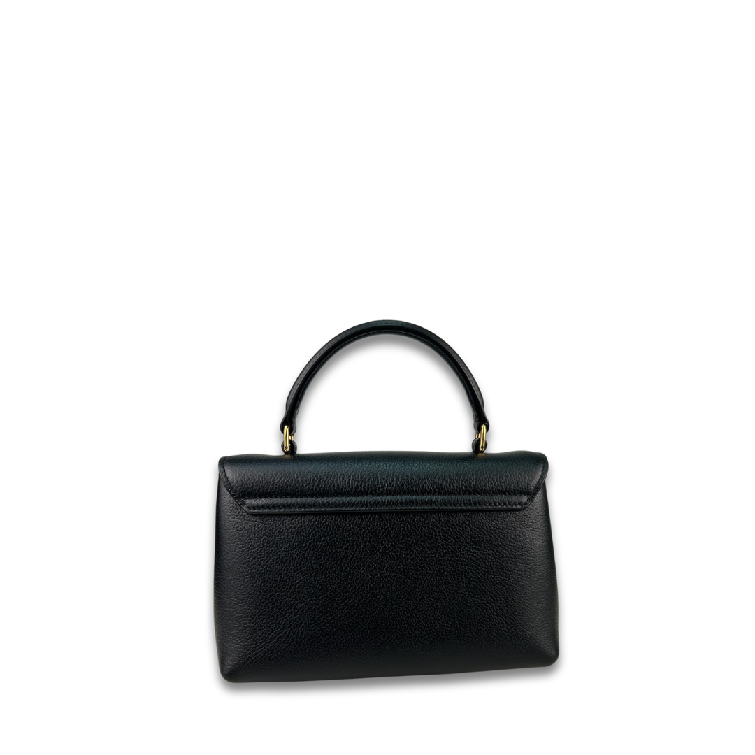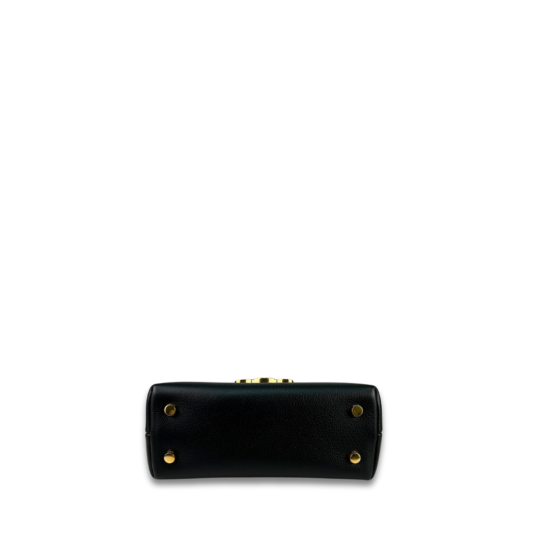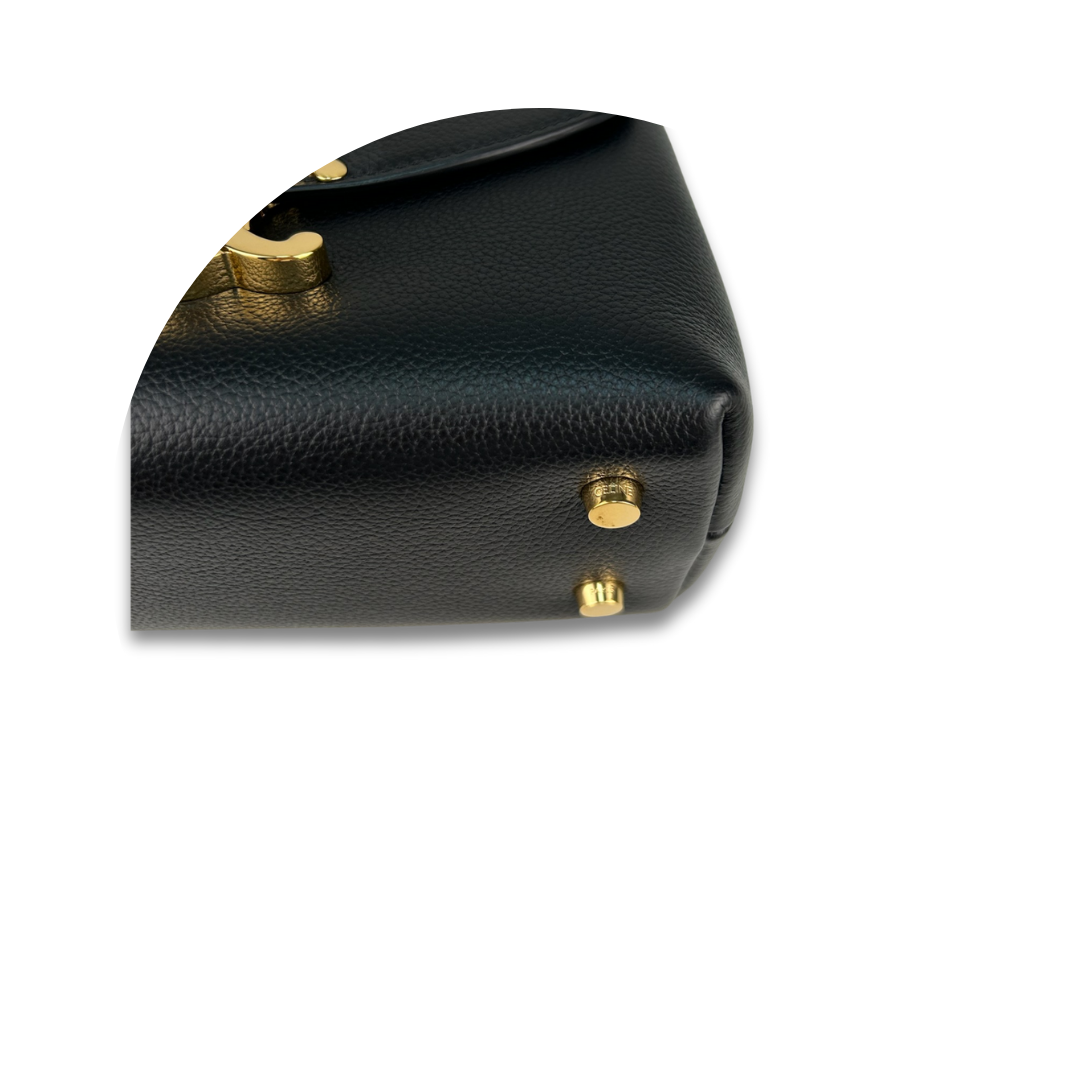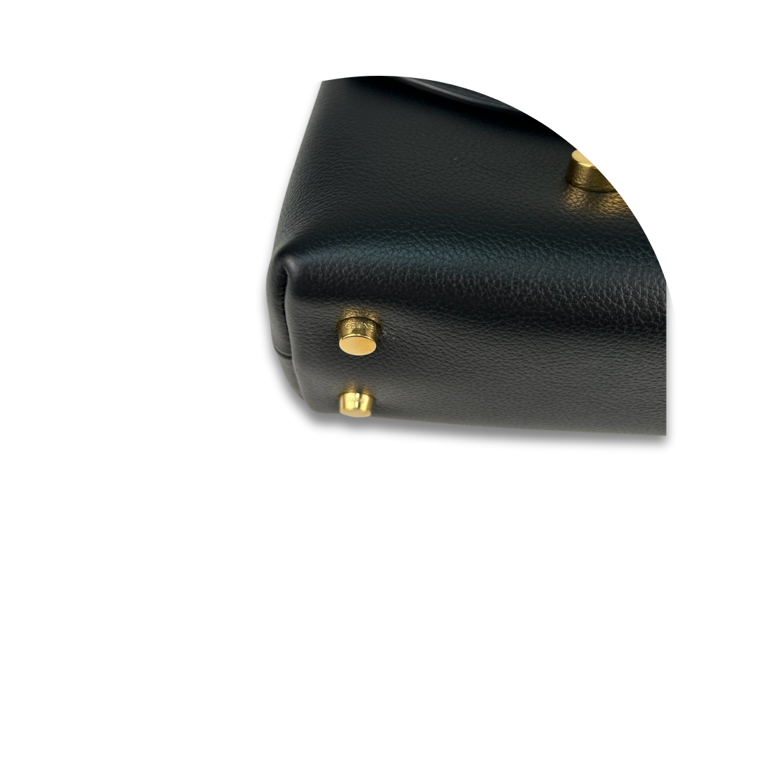 Black calfskin exterior with tonal lambskin interior and gold-tone hardware. Features Triomphe push-clasp closure, top handle, detachable and adjustable shoulder strap, divided interior with central zipper pocket, and 2 interior patch pockets. Includes certificate of authenticity and original dust bag.