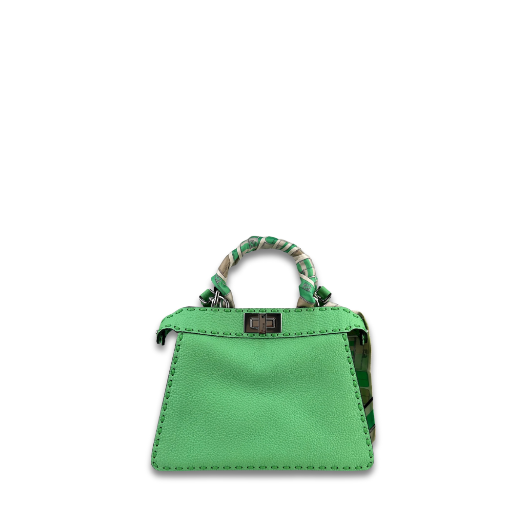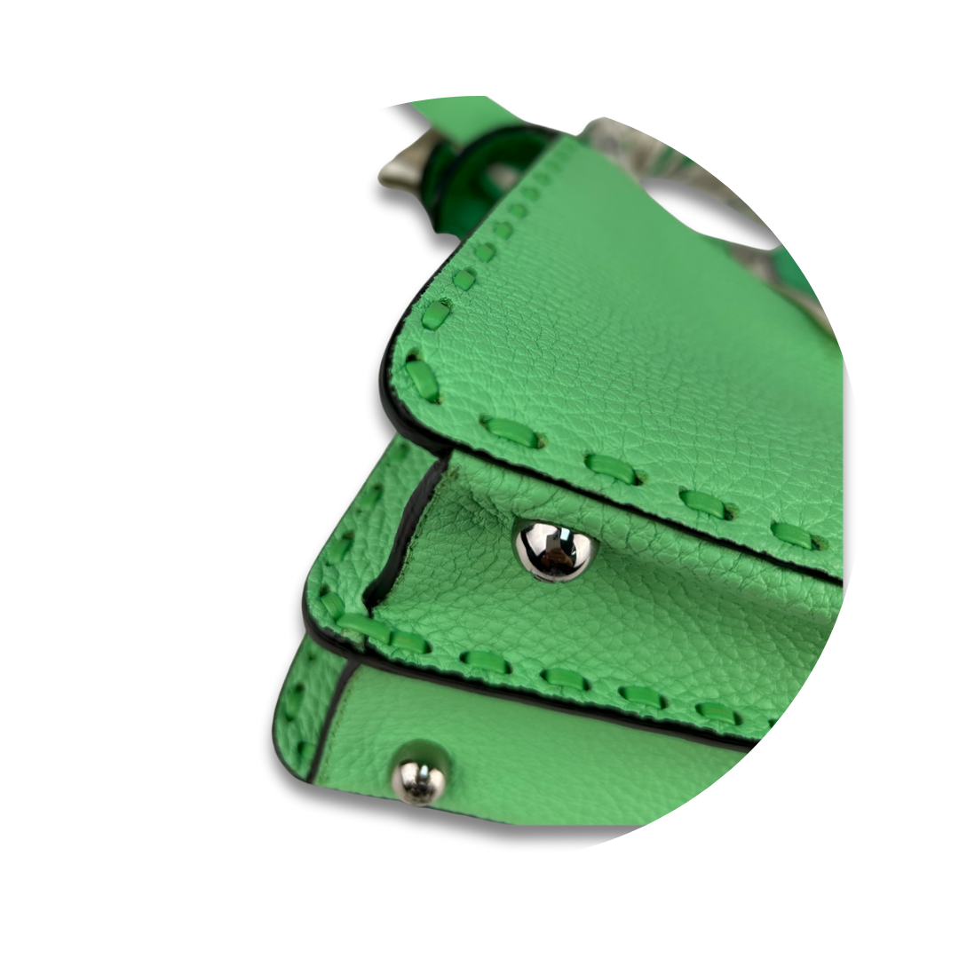 Green Nappa leather exterior with tonal leather interior and silver-tone hardware. Features leather top handle, detachable and adjustable crossbody strap, dual side twist lock closure, two compartments separated by central partition, and interior flat pocket. Includes certificate of authenticity and original dust bag.