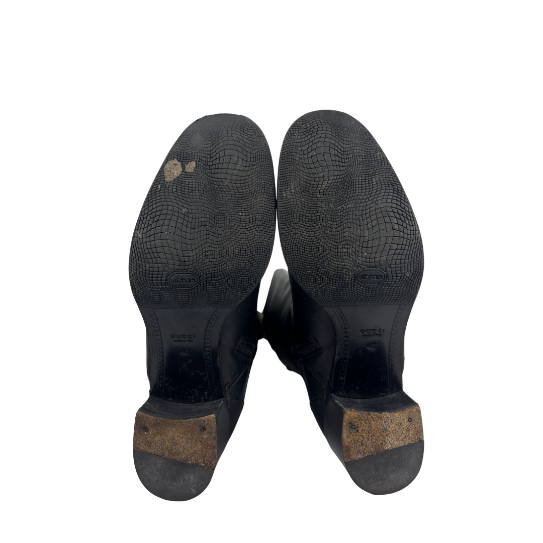 Black leather upper with leather footbed and aftermarket rubber sole. Features full side zip closure, gold-tone horsebit detail, and 2" block heel. Includes certificate of authenticity.