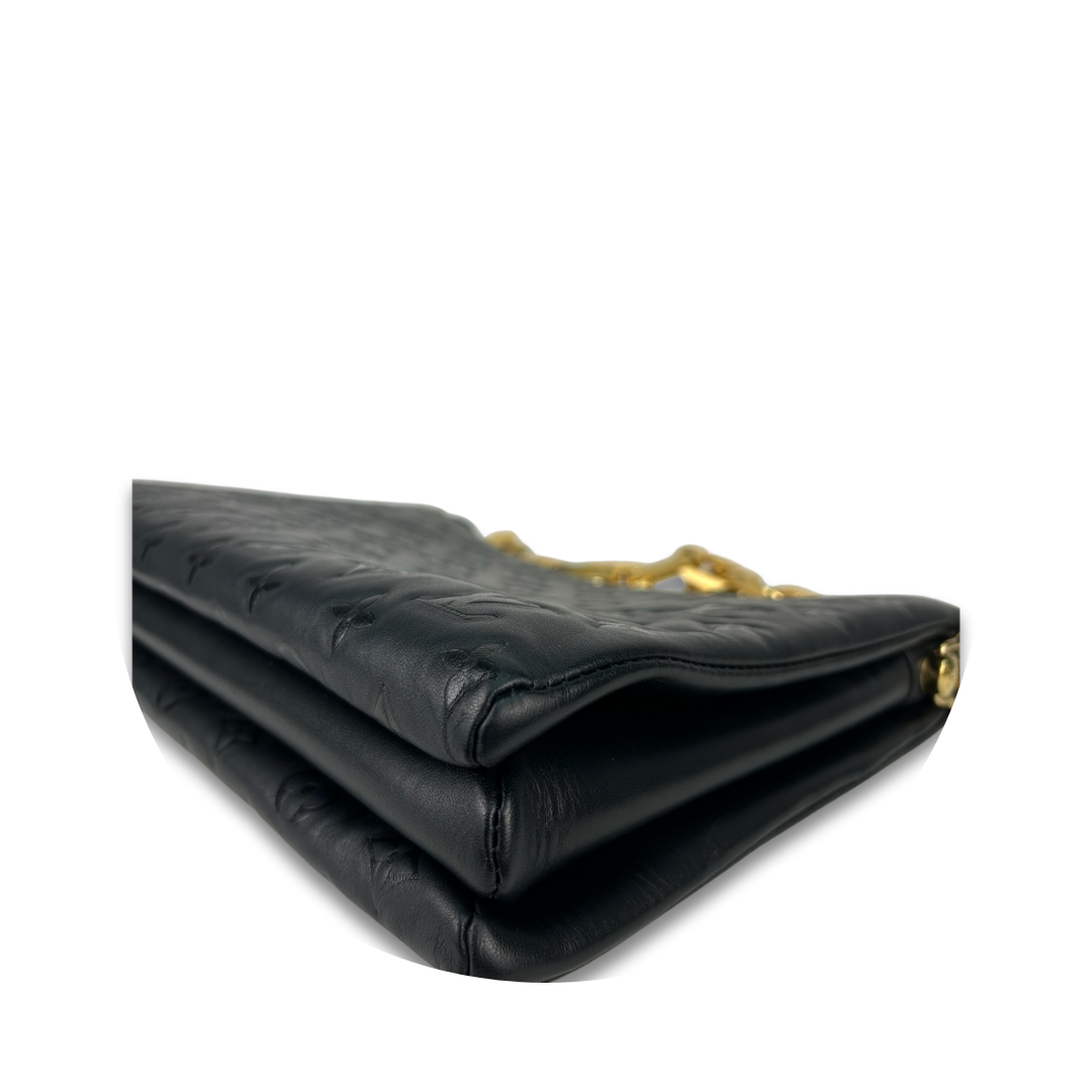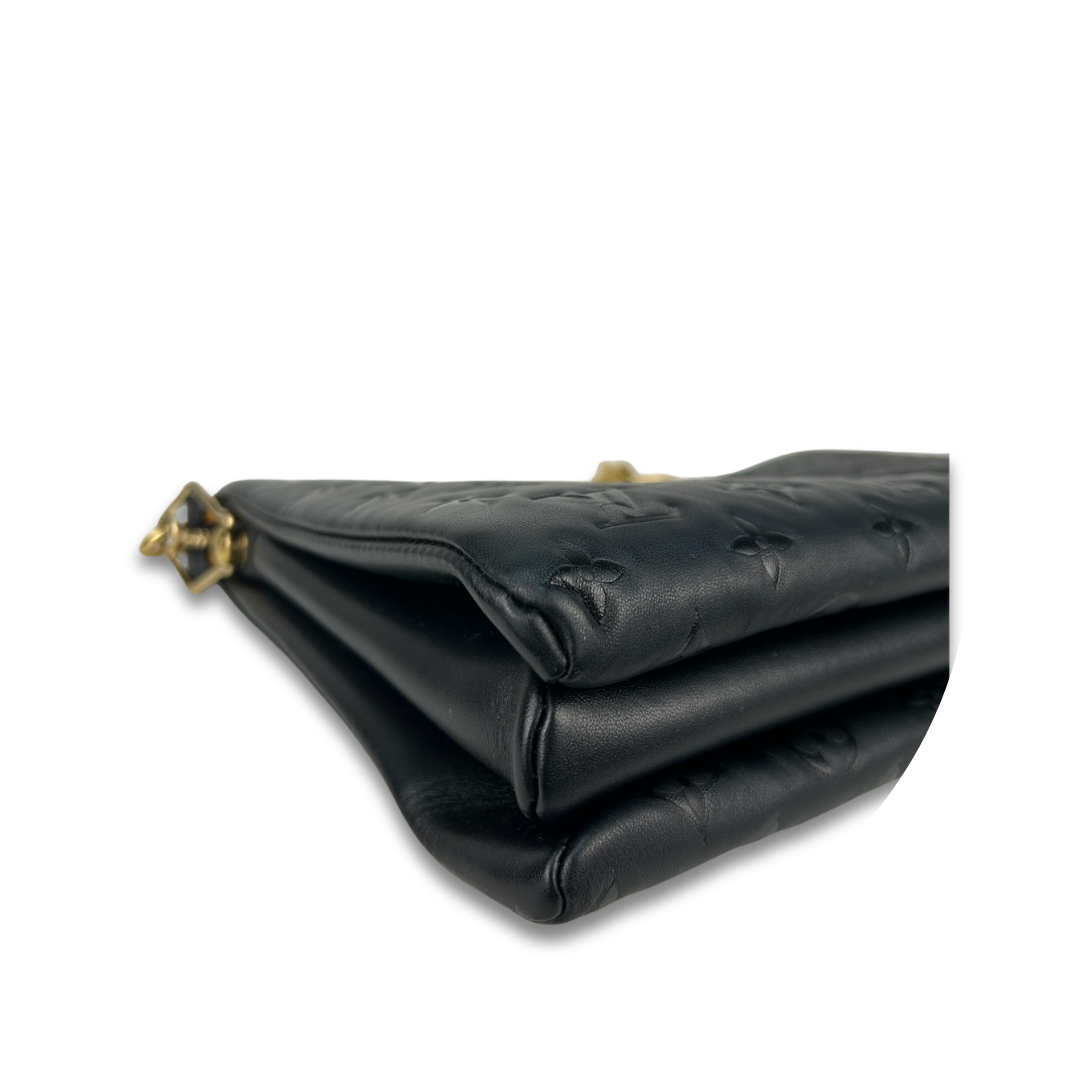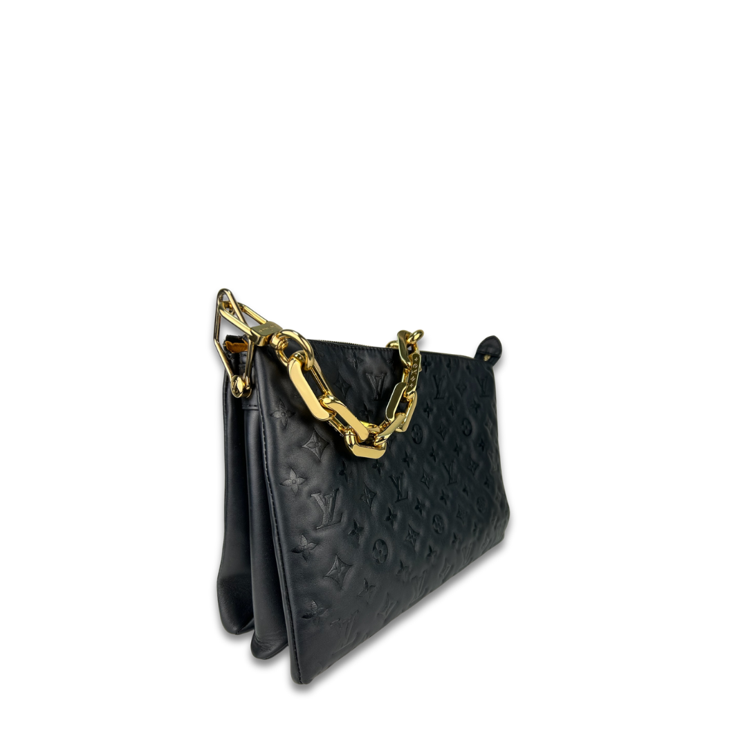 Black lambskin exterior embossed with LV Monogram pattern, gold microfiber interior, and gold-tone hardware. Features zip-top closure, 2 interior compartments separated by central zipper pocket, detachable canvas strap, and detachable gold-tone chain-link strap. Includes certificate of authenticity.