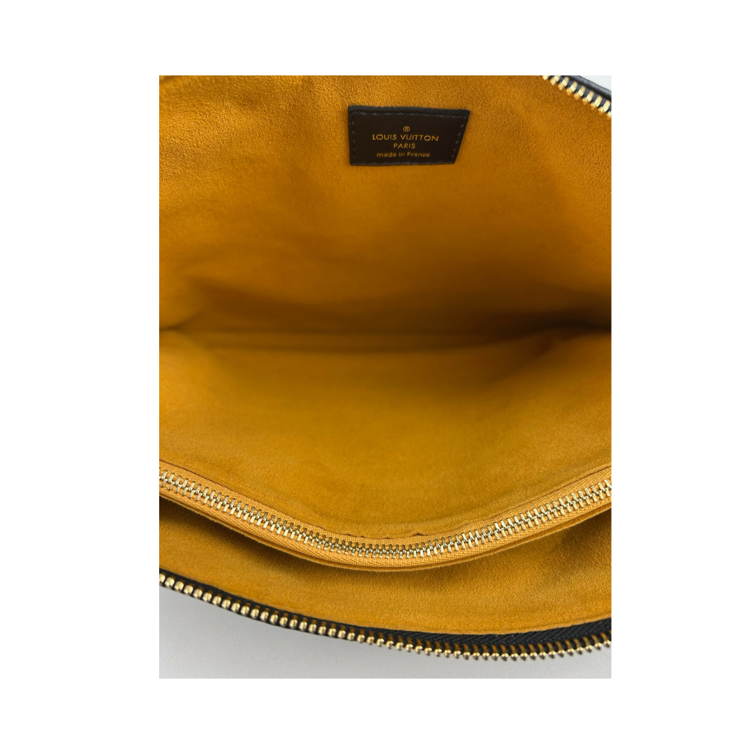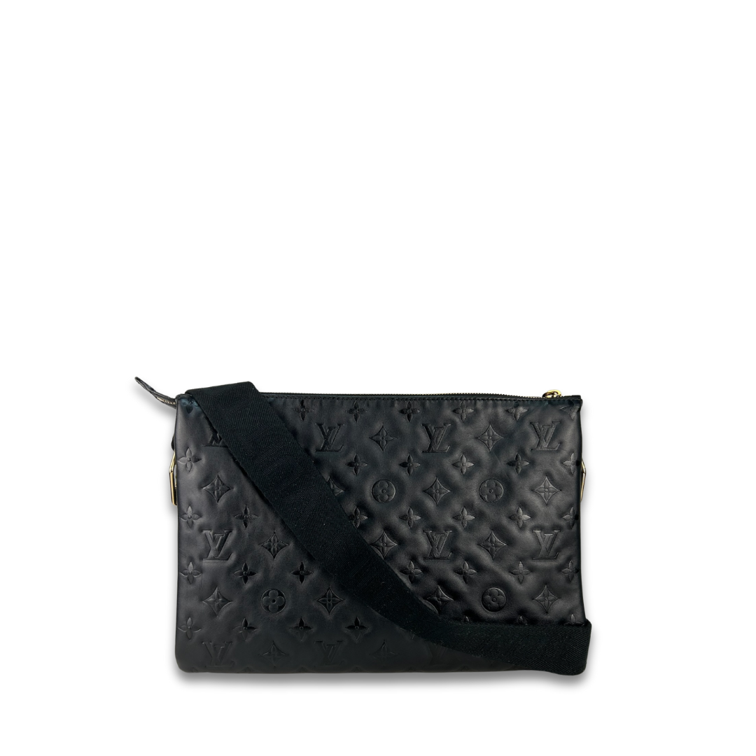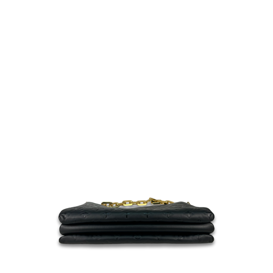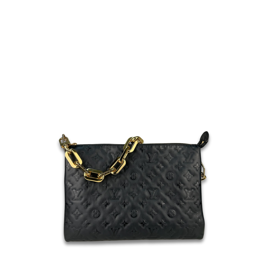 Black lambskin exterior embossed with LV Monogram pattern, gold microfiber interior, and gold-tone hardware. Features zip-top closure, 2 interior compartments separated by central zipper pocket, detachable canvas strap, and detachable gold-tone chain-link strap. Includes certificate of authenticity.