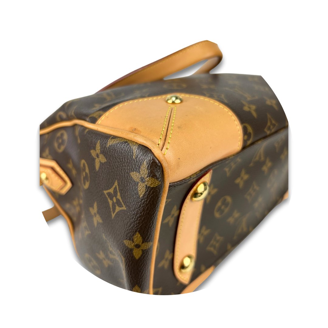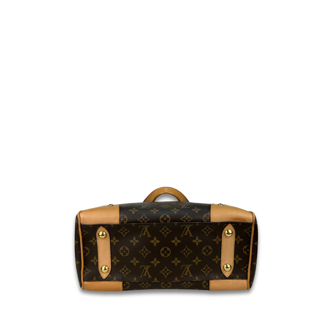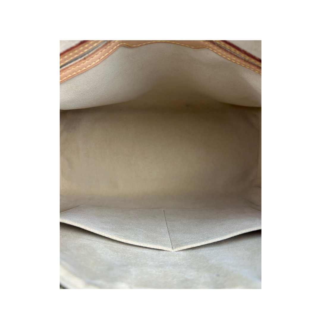 Classic LV Monogram coated canvas exterior with vachetta leather trim, tan microfiber interior, and gold-tone hardware. Features dual rolled leather top handles, detachable and adjustable leather strap, zipper closure, and interior pockets. Includes certificate of authenticity.