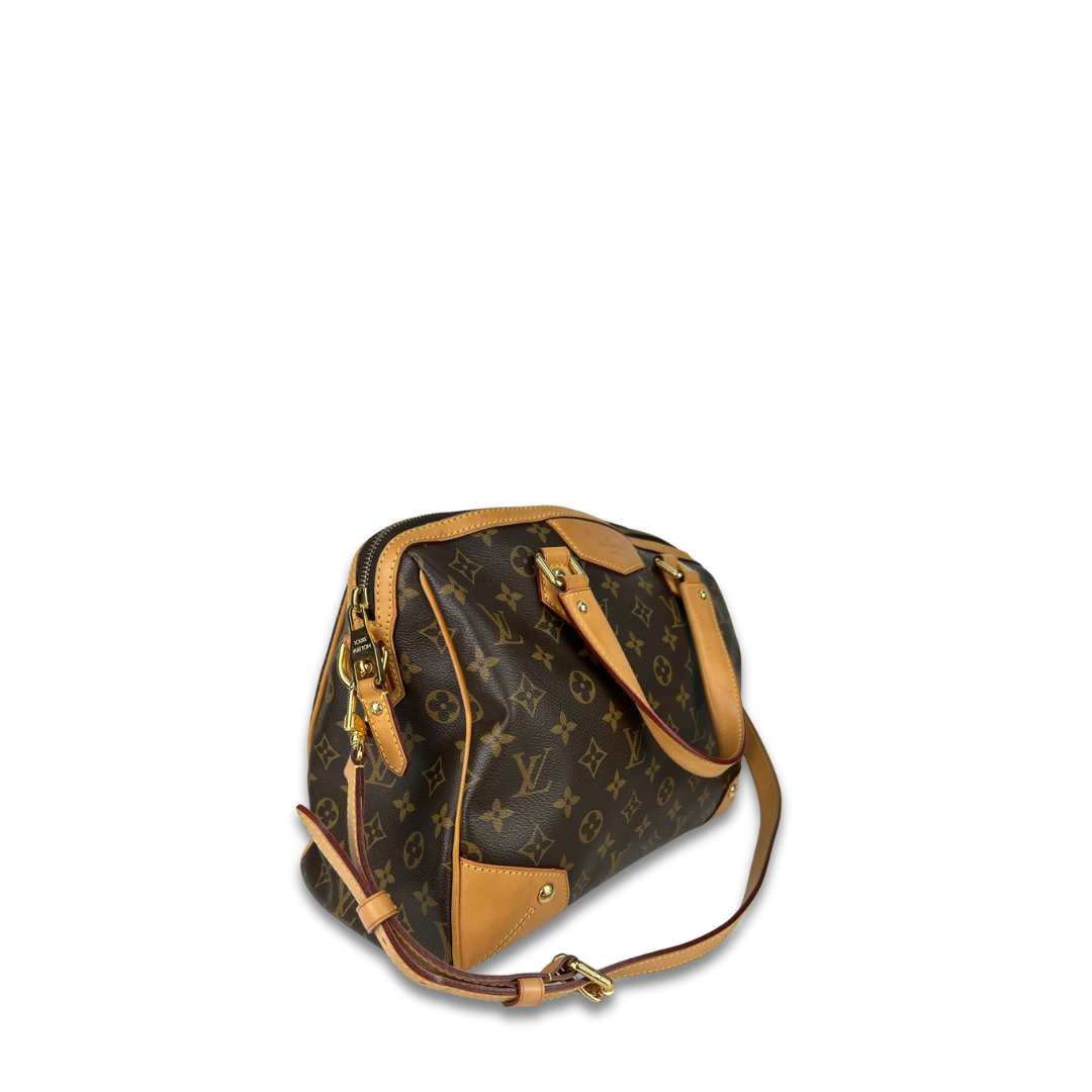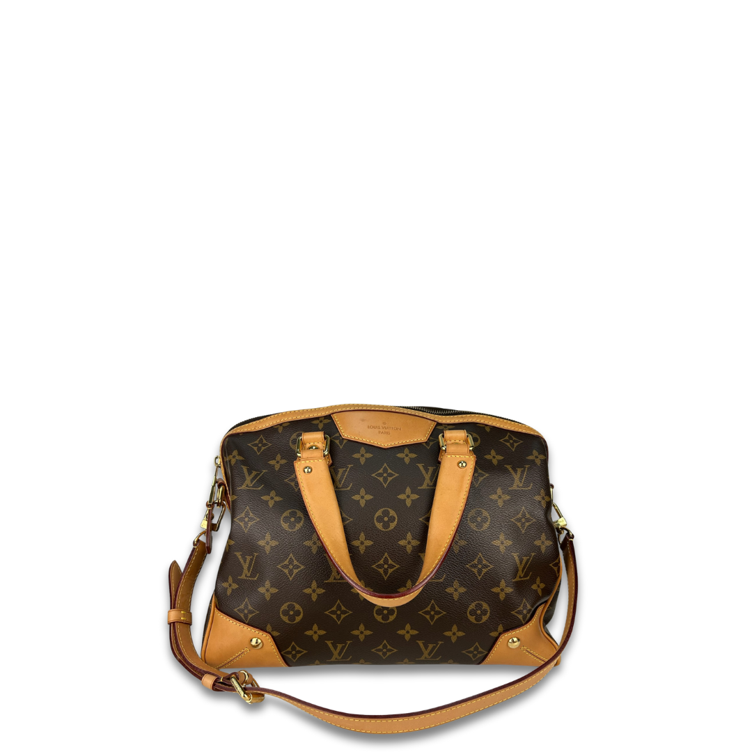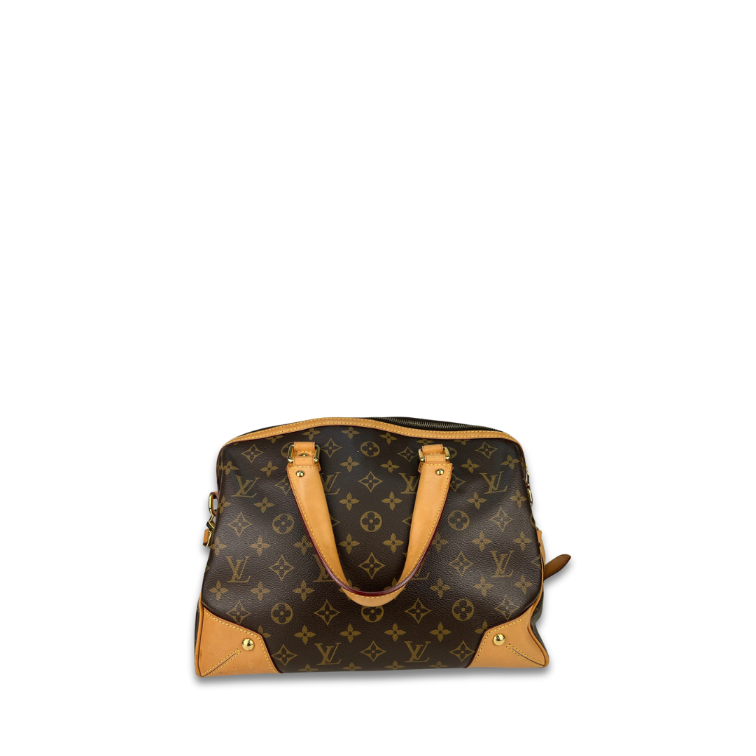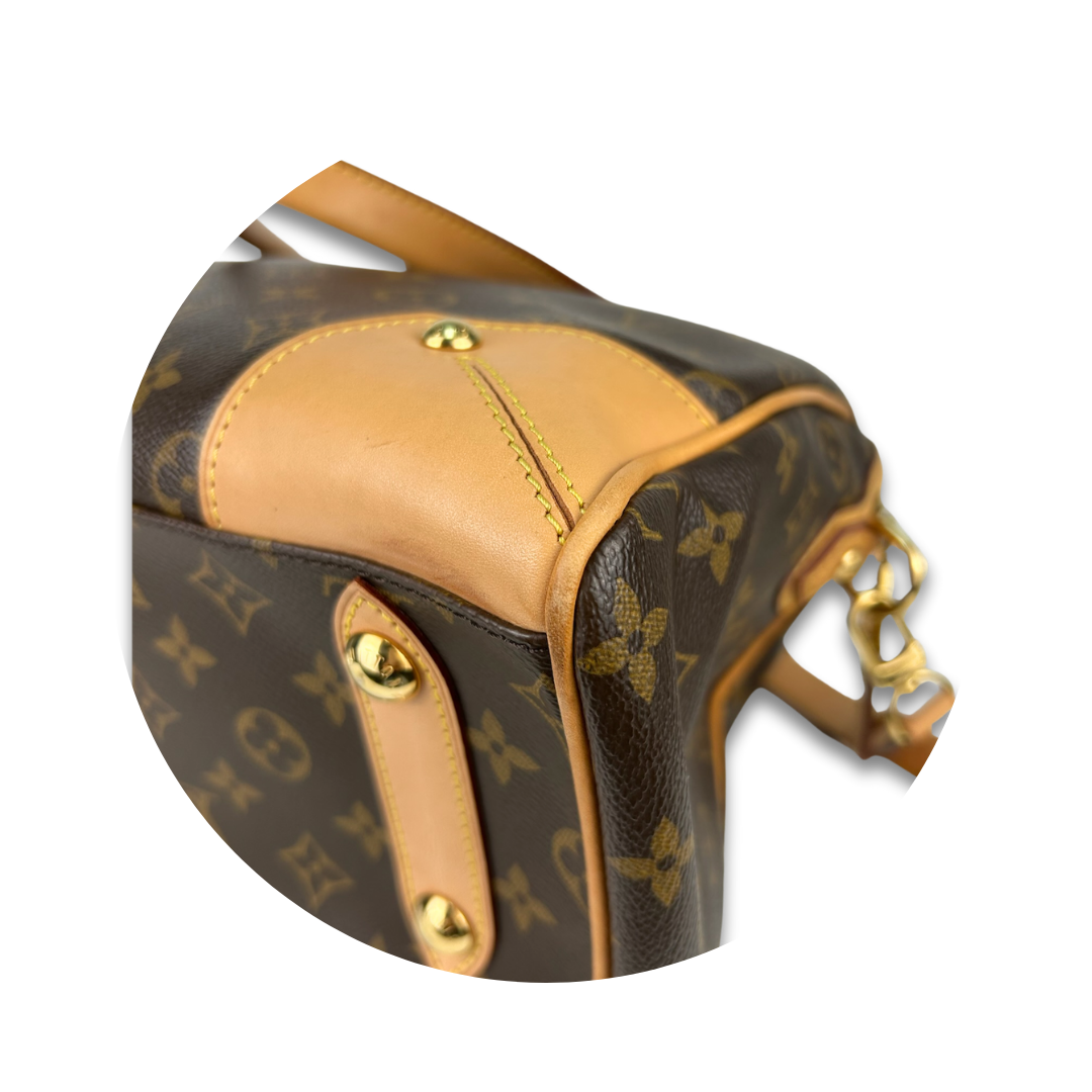 Classic LV Monogram coated canvas exterior with vachetta leather trim, tan microfiber interior, and gold-tone hardware. Features dual rolled leather top handles, detachable and adjustable leather strap, zipper closure, and interior pockets. Includes certificate of authenticity.