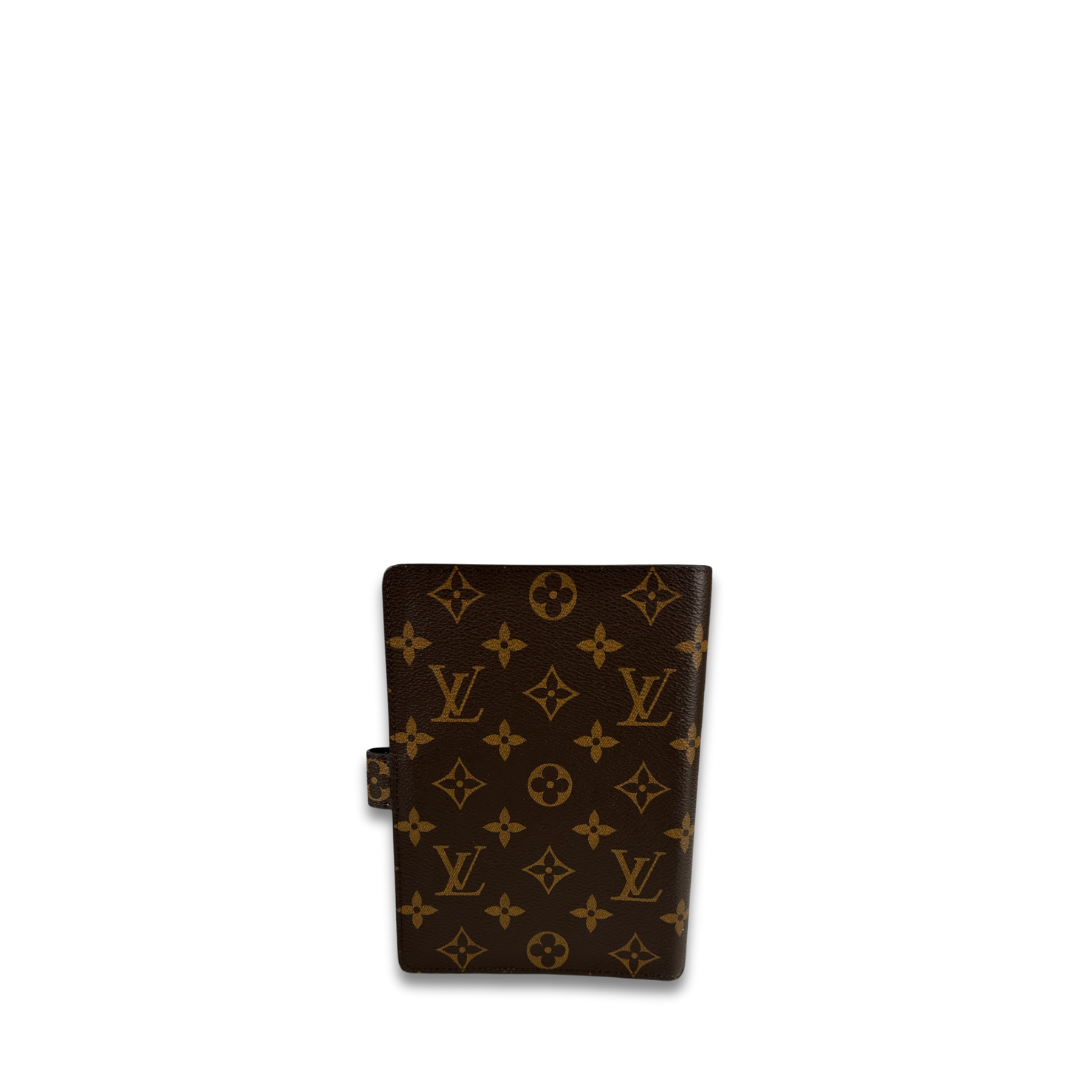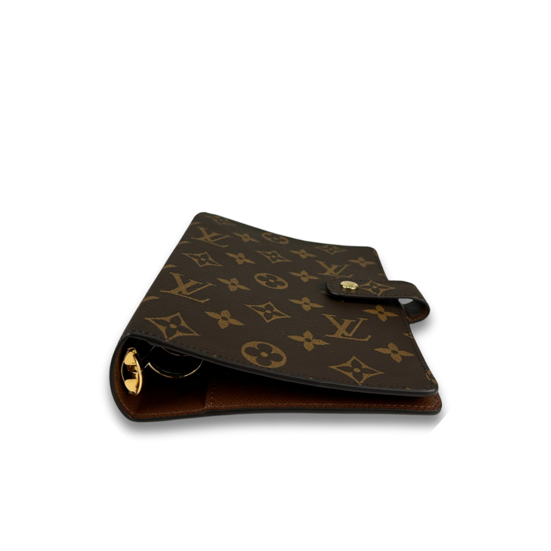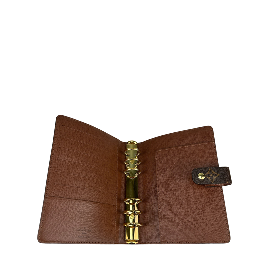 Classic LV Monogram coated canvas exterior with a brown crossgrain leather interior and polished gold-tone hardware. Features snap closure, interior pockets, 6 card slots, and 6 binder rings. Includes certificate of authenticity.