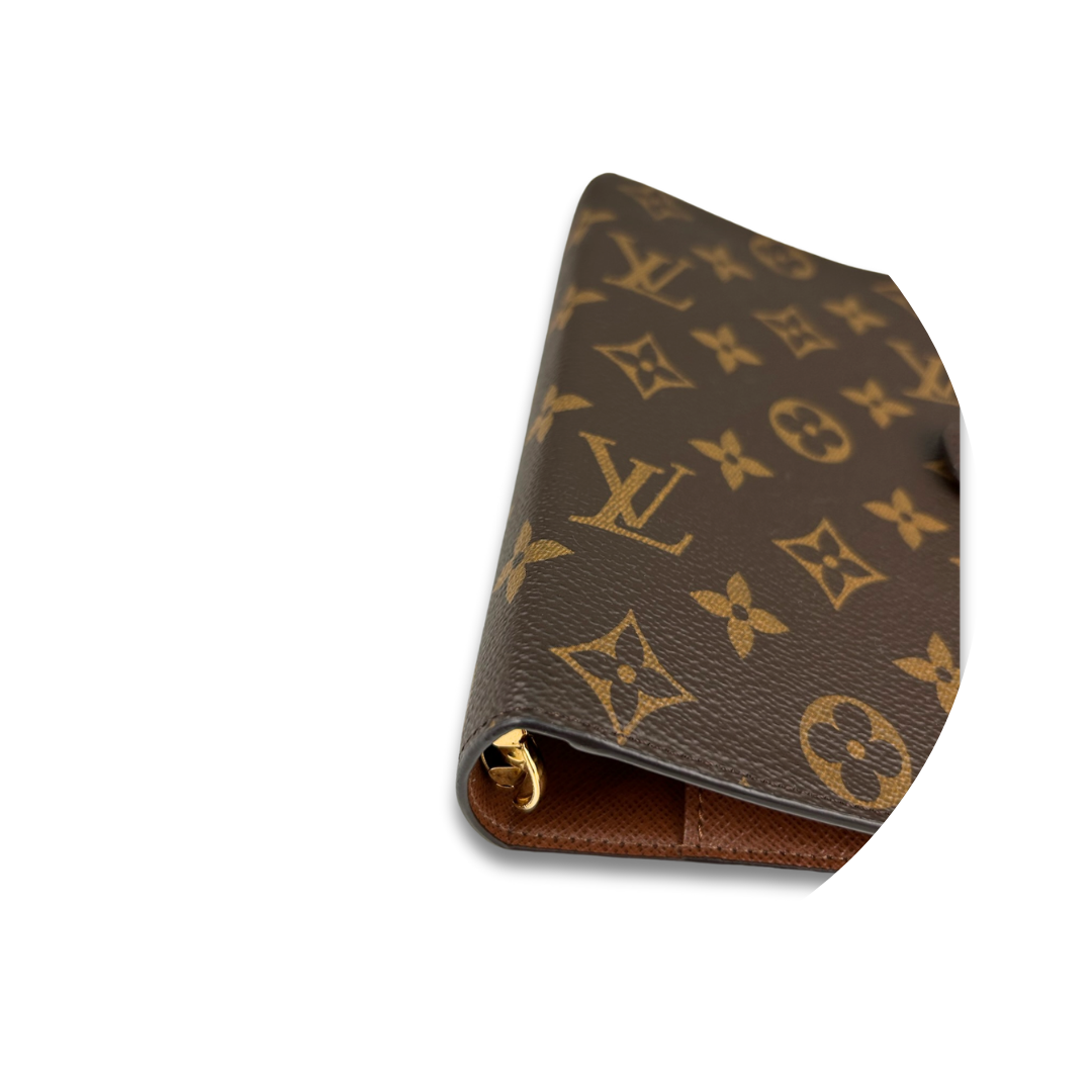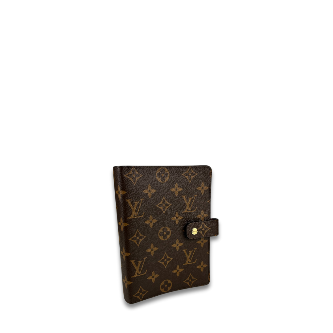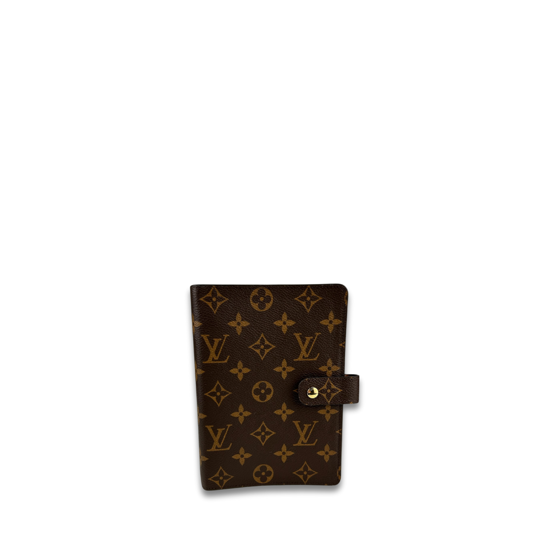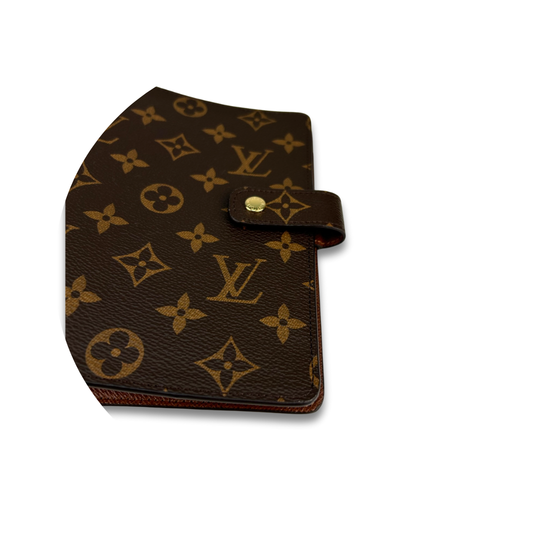 Classic LV Monogram coated canvas exterior with a brown crossgrain leather interior and polished gold-tone hardware. Features snap closure, interior pockets, 6 card slots, and 6 binder rings. Includes certificate of authenticity.