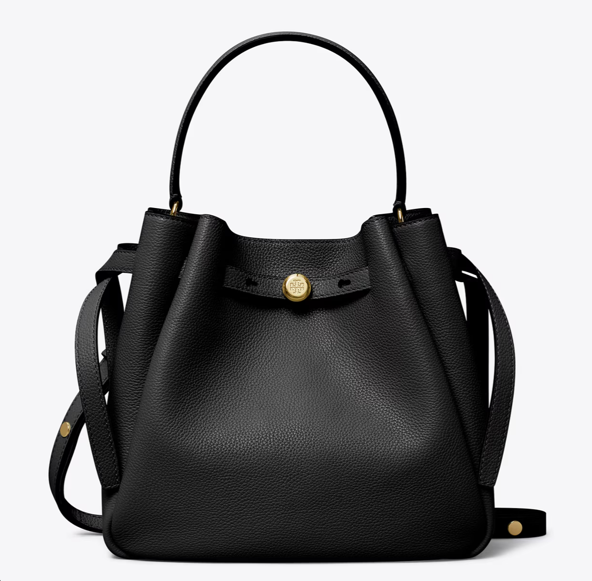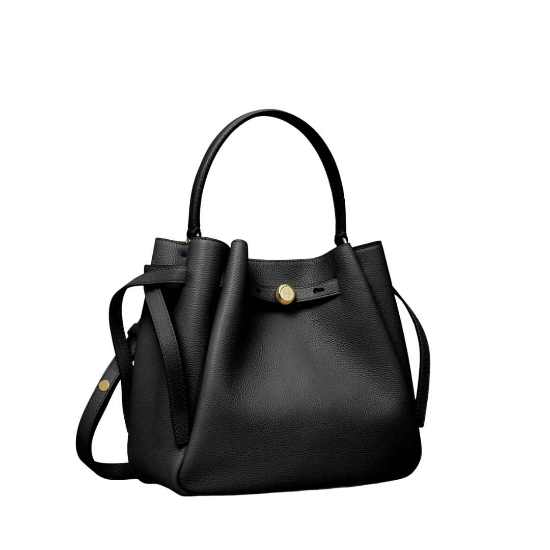 The Romy Bucket Bag is crafted in soft pebbled leather with a gently gathered silhouette. The ultimate everyday handbag, it is lightweight with a spacious interior organized with a pocket. Detailed with a slim belt and our new button logo. Carry it top-handle style or crossbody.