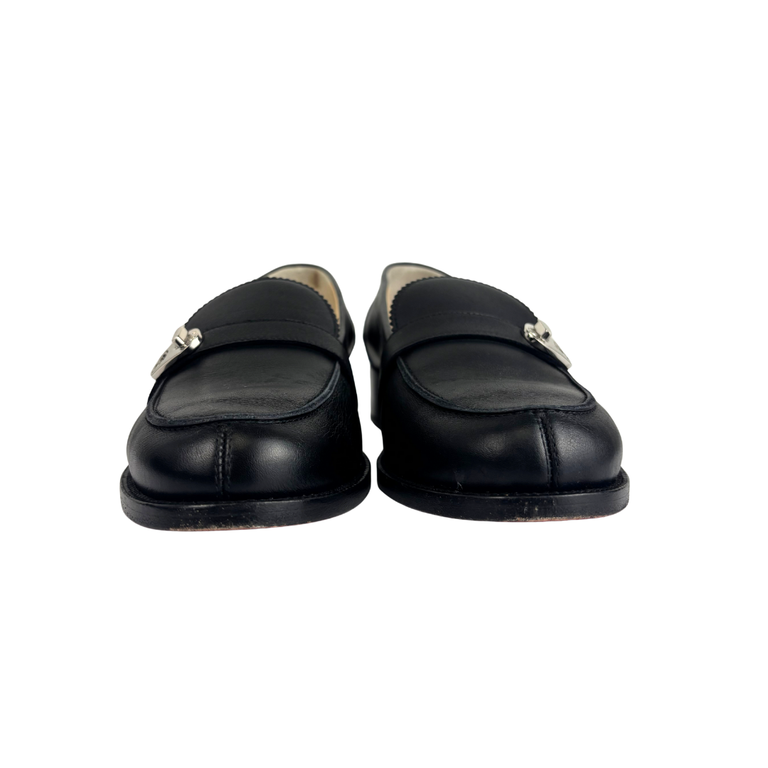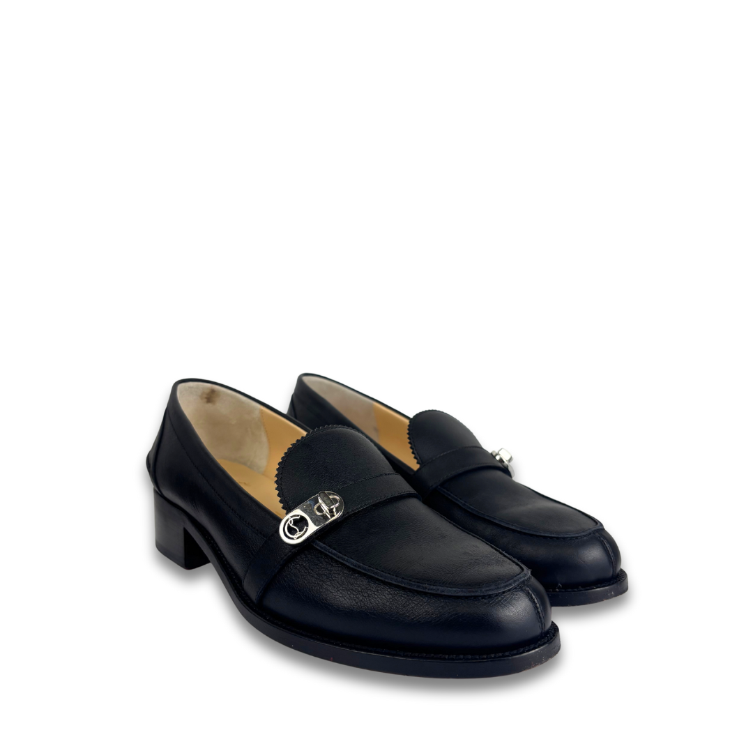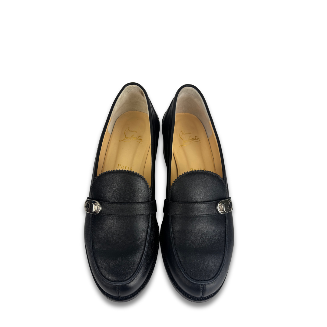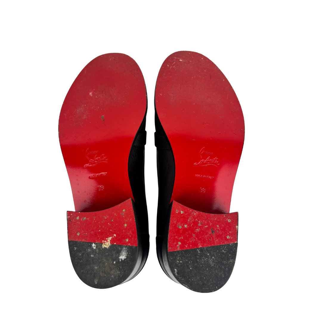 Black leather upper with leather footbed and signature red leather sole. Features silver-tone turlock decal. Includes certificate of authenticity, original dust bag, and original box.