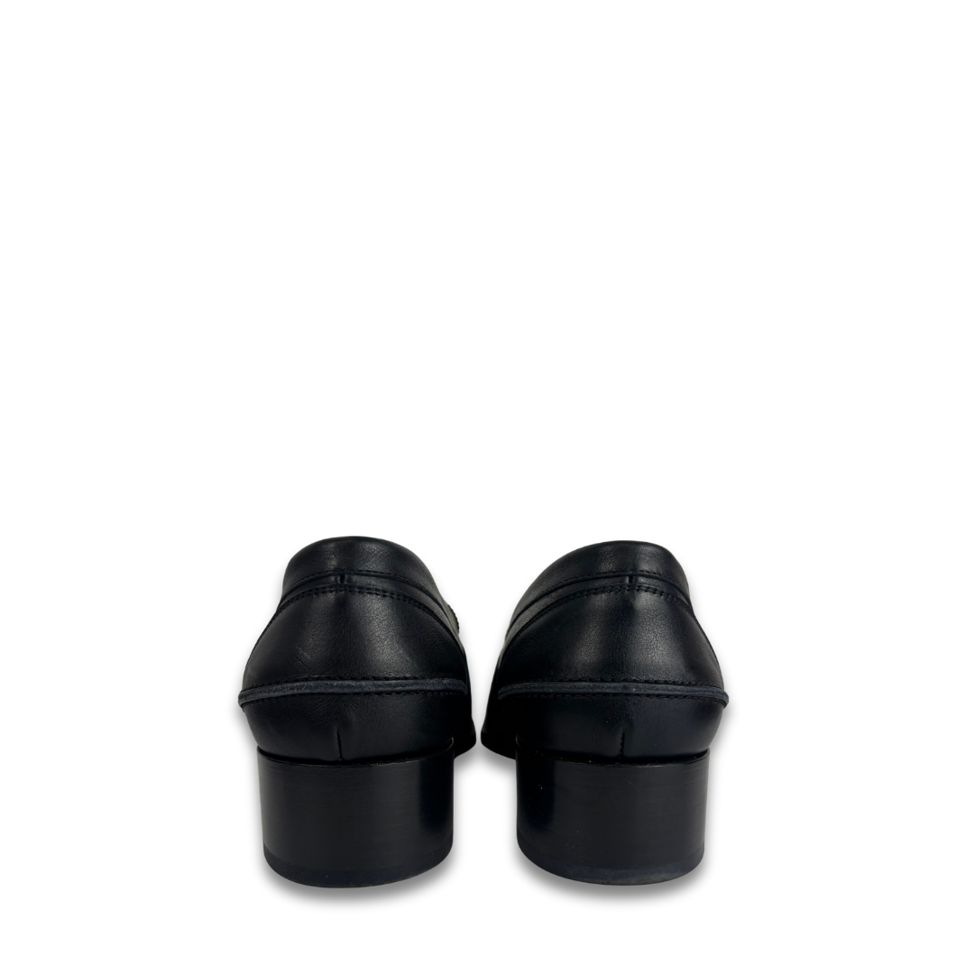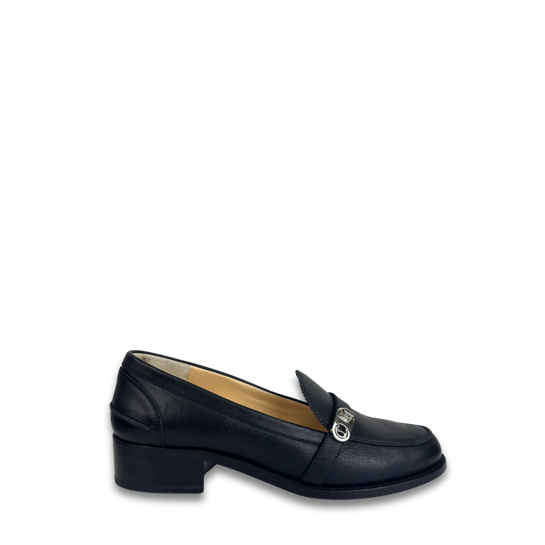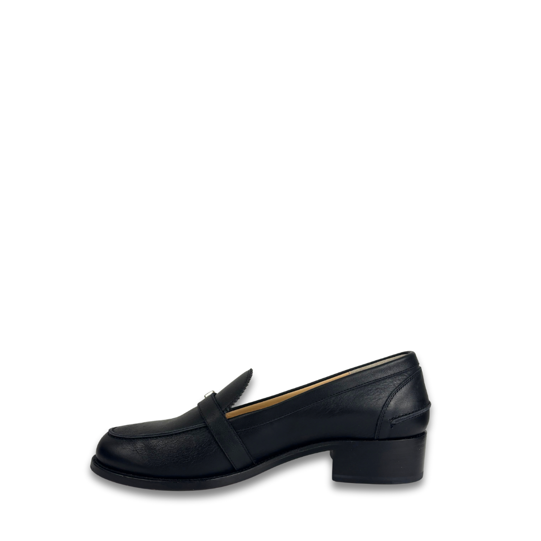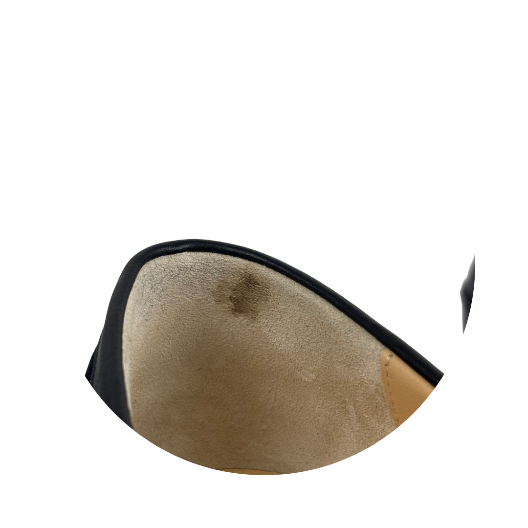 Black leather upper with leather footbed and signature red leather sole. Features silver-tone turlock decal. Includes certificate of authenticity, original dust bag, and original box.