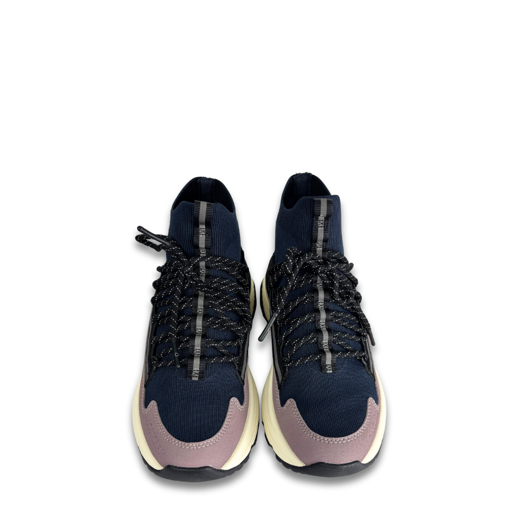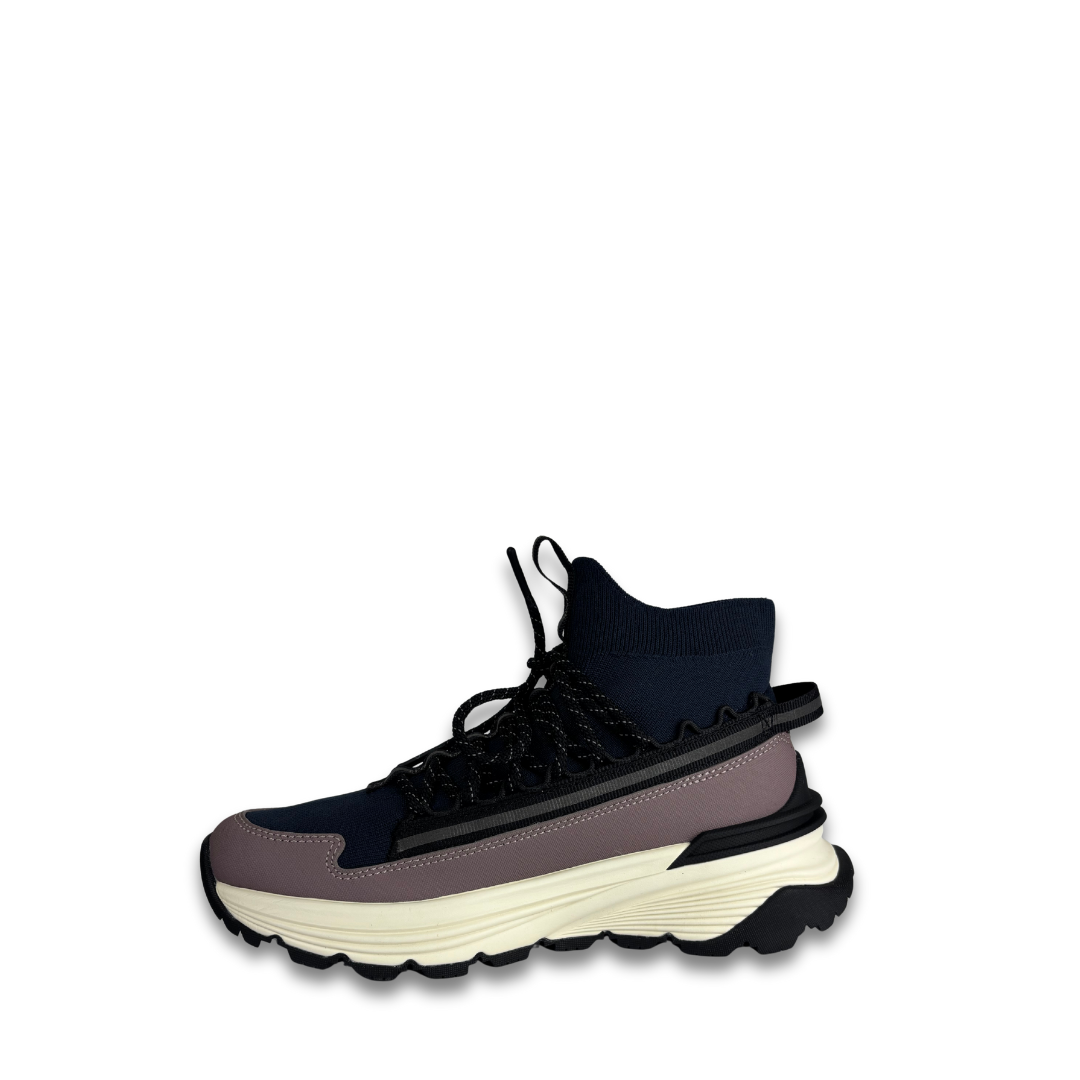 Purple and navy upper knit upper with footbed and rubber sole. Features hightop ankle sock and laces. Includes certificate of authenticity and original dust bag.