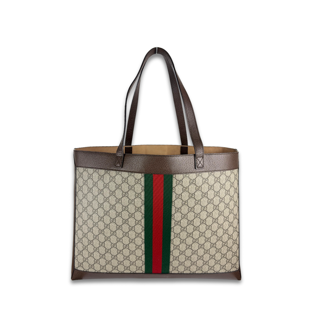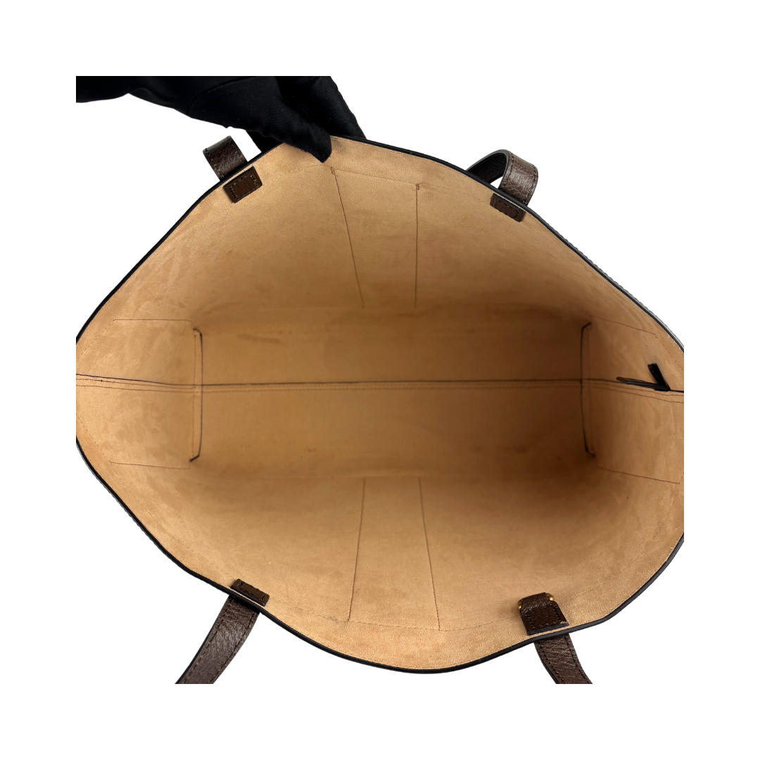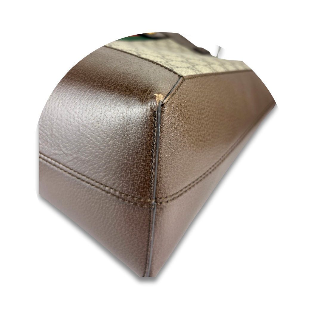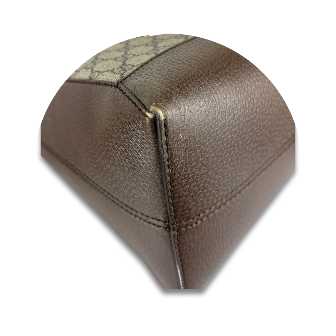 Brown and beige GG supreme coated canvas exterior with brown leather trim, beige microfiber interior and gold-tone hardware. Features dual leather shoulder straps, open top and interior zipper pouch. Please note, significant corner wear and marks throughout. Includes a certificate of authenticity.