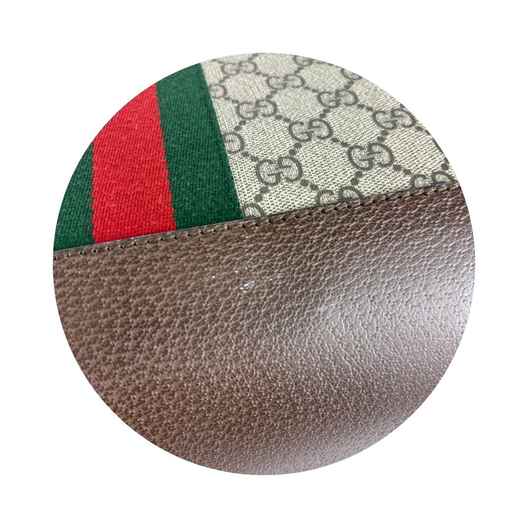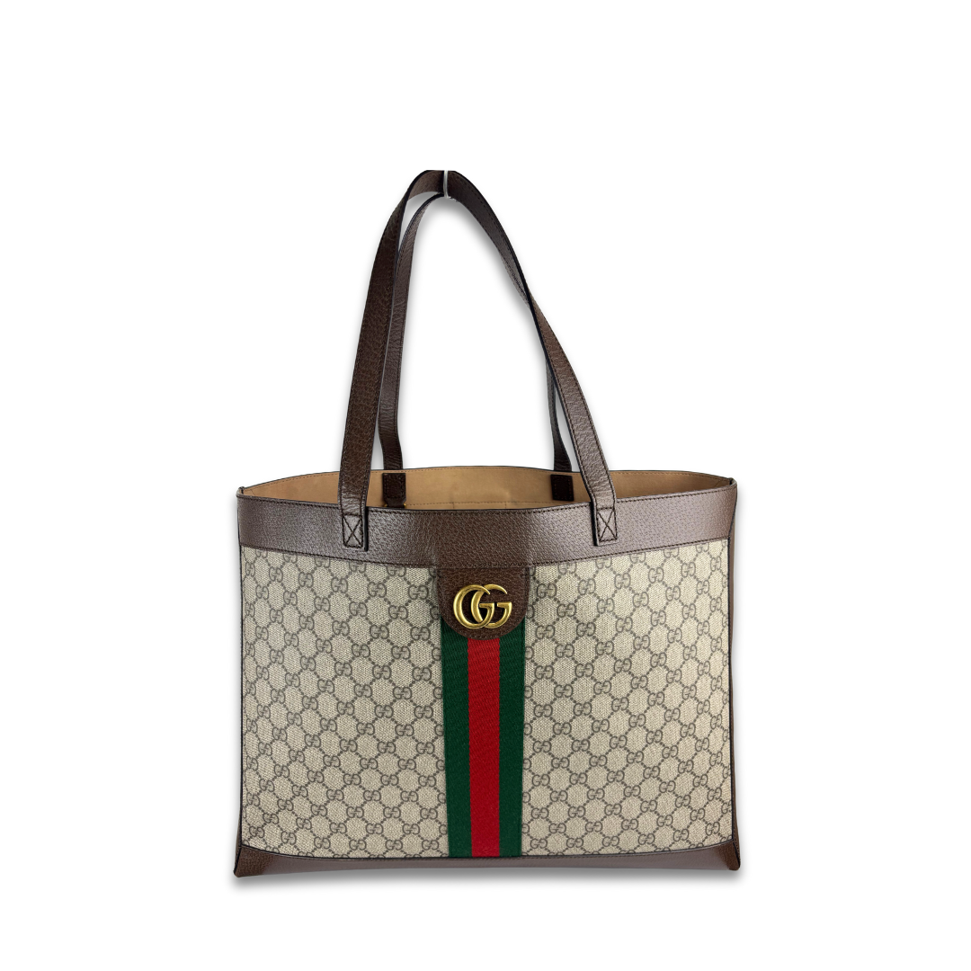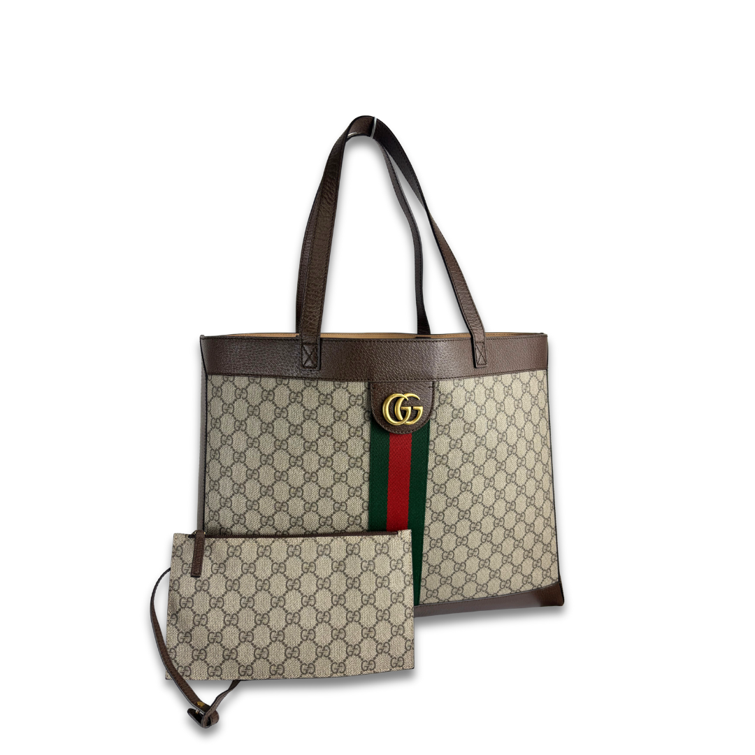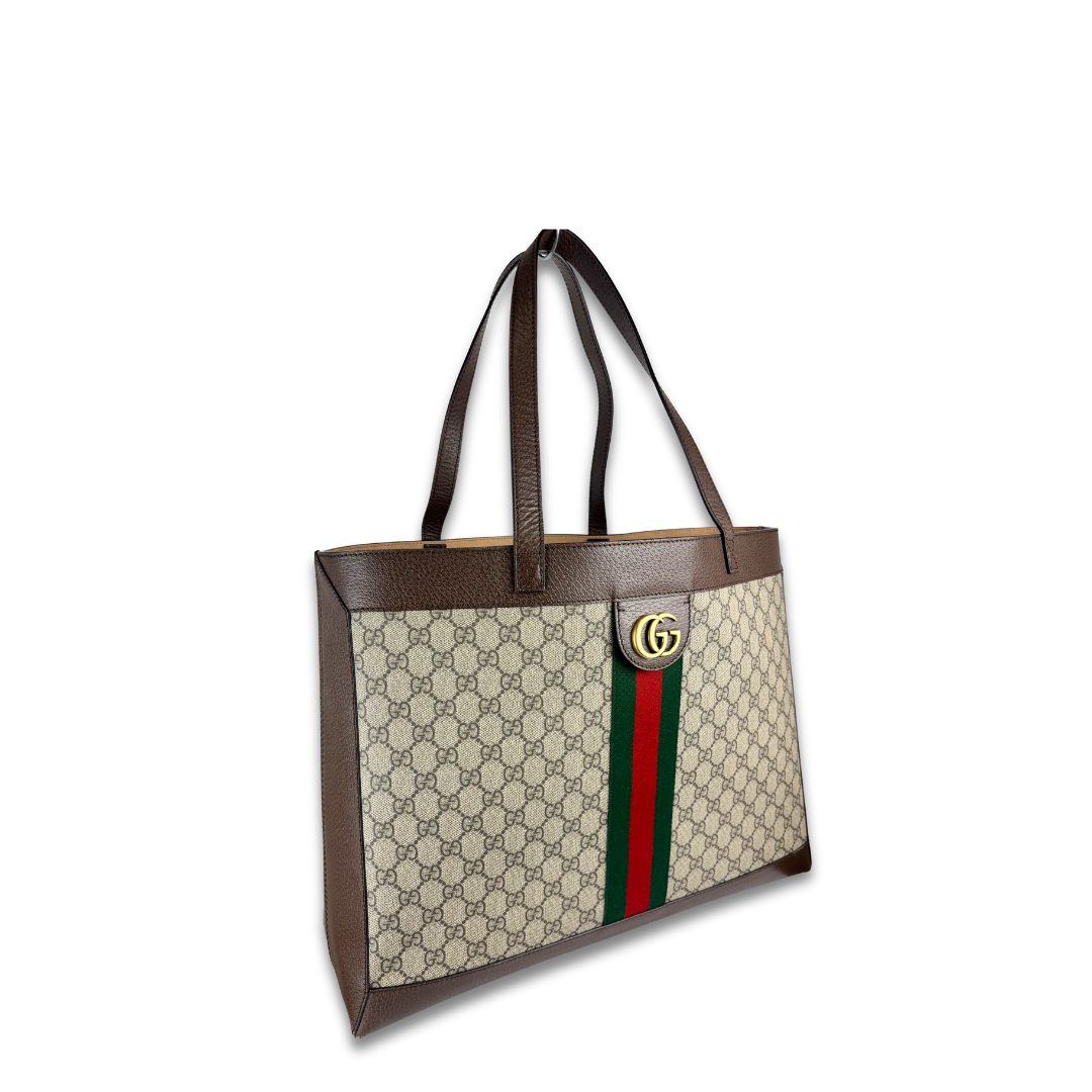 Brown and beige GG supreme coated canvas exterior with brown leather trim, beige microfiber interior and gold-tone hardware. Features dual leather shoulder straps, open top and interior zipper pouch. Please note, significant corner wear and marks throughout. Includes a certificate of authenticity.