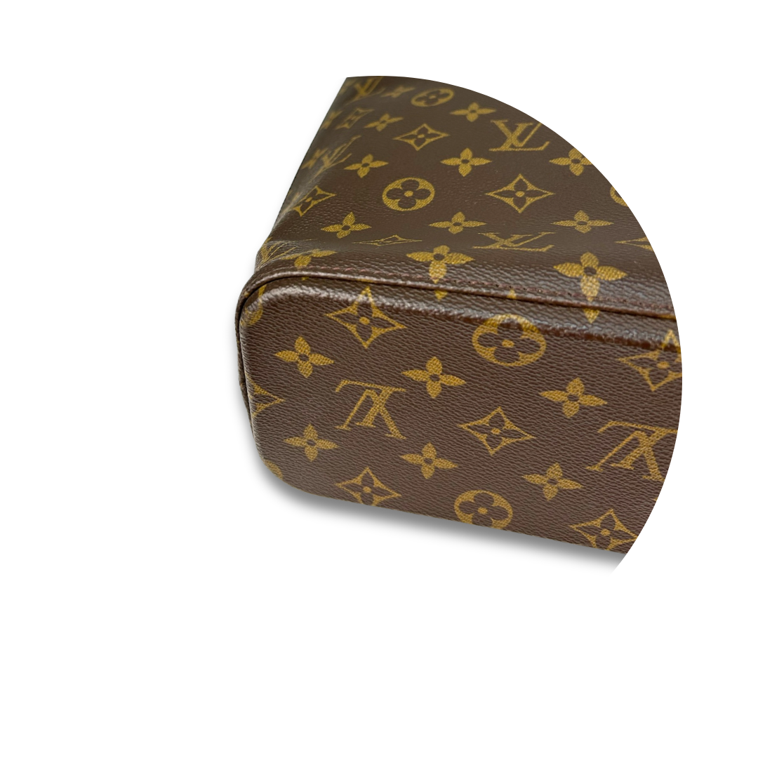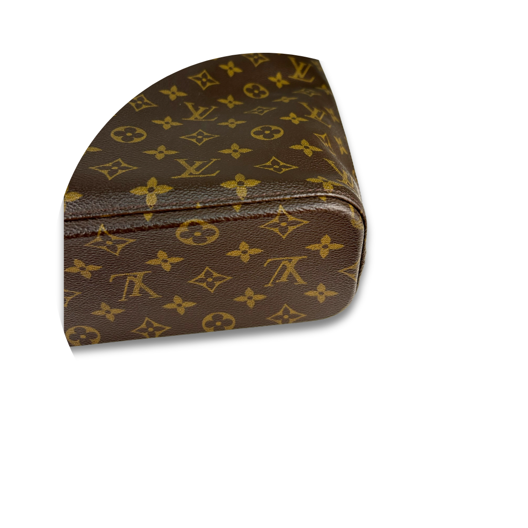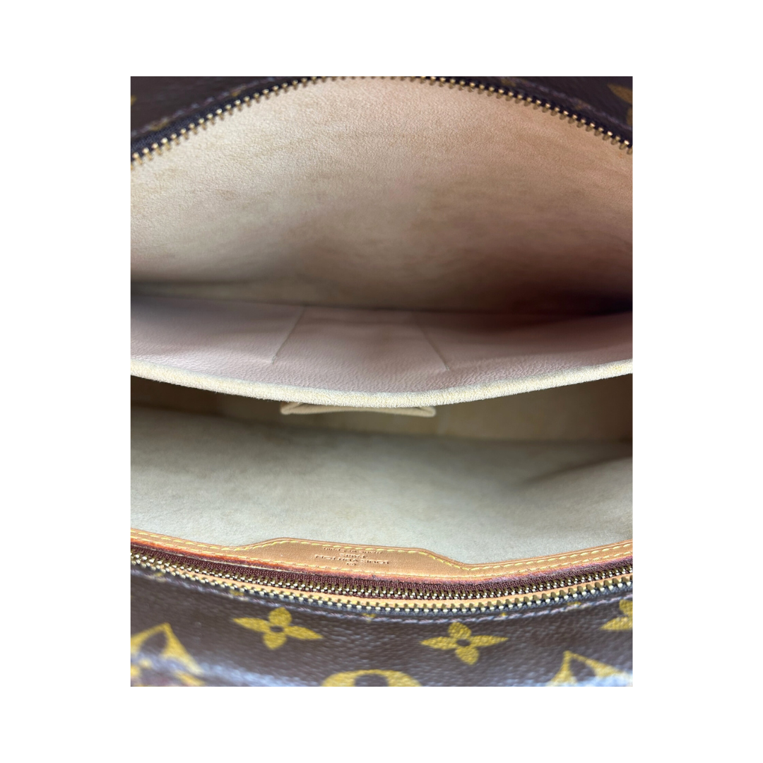 Classic LV Monogram coated canvas exterior with vachetta leather trim, beige microfiber interior, and brass hardware. Features long shoulder straps, zipper closure, and several interior pockets. Includes certificate of authenticity.