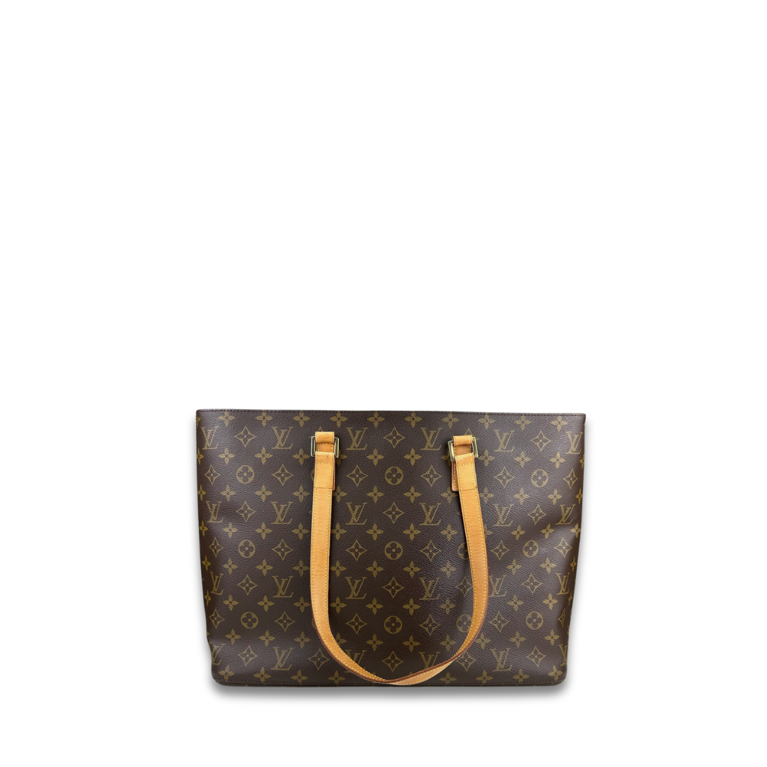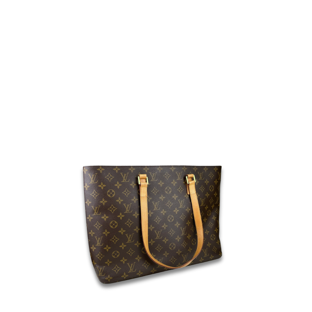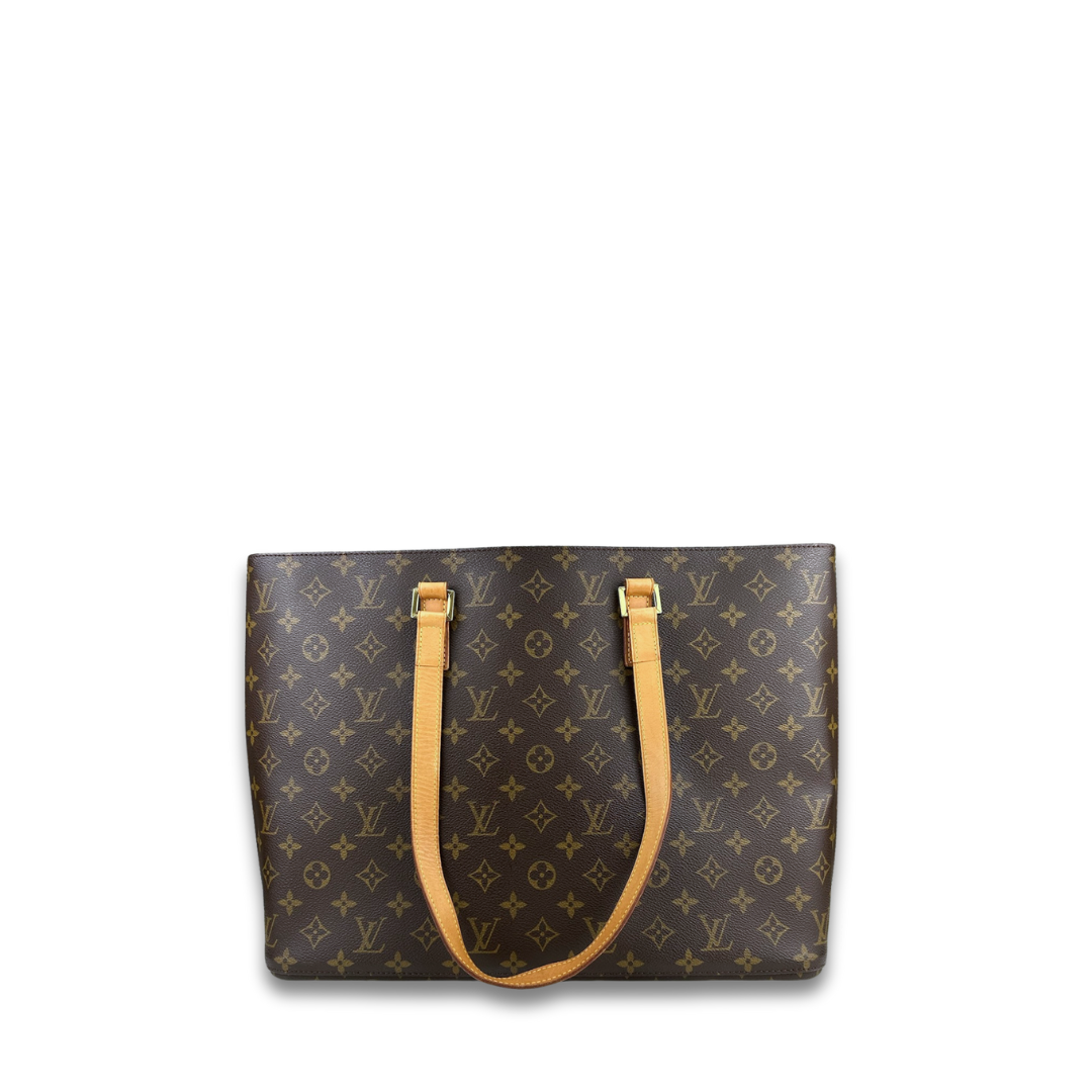 Classic LV Monogram coated canvas exterior with vachetta leather trim, beige microfiber interior, and brass hardware. Features long shoulder straps, zipper closure, and several interior pockets. Includes certificate of authenticity.