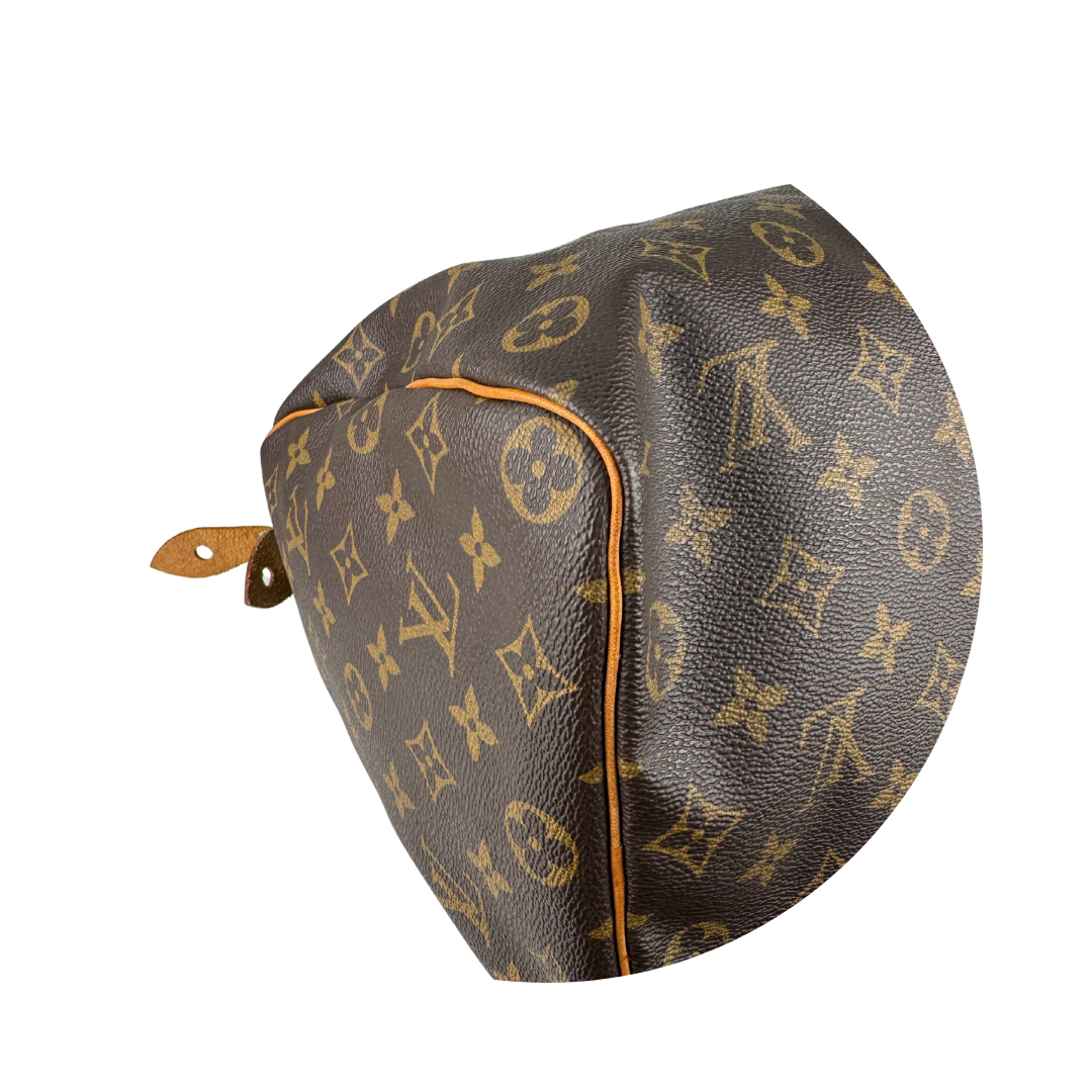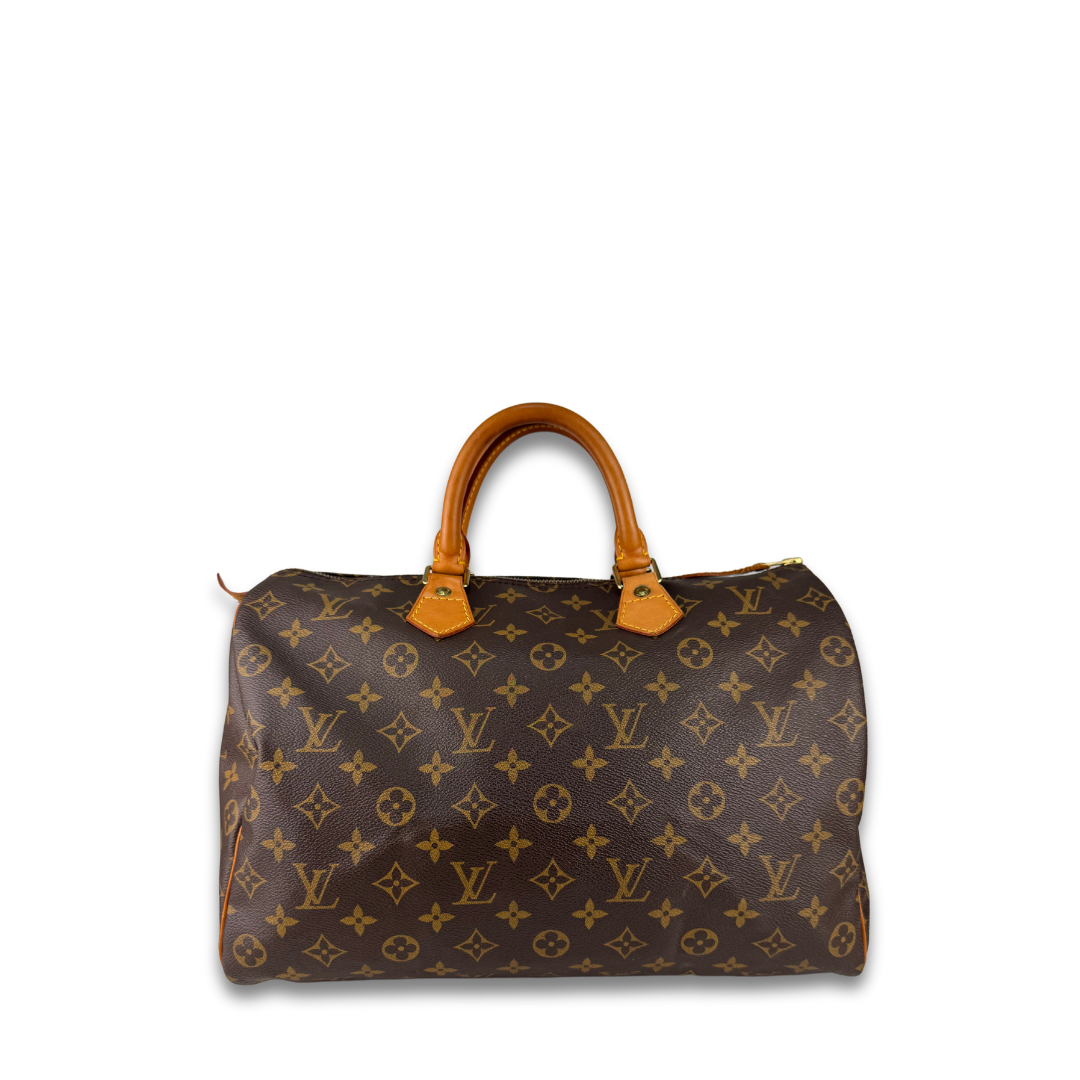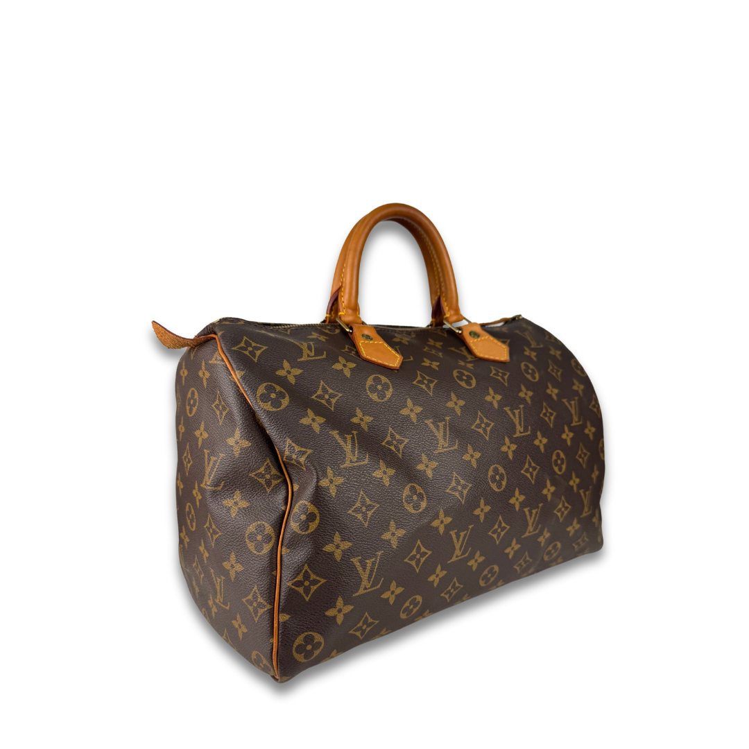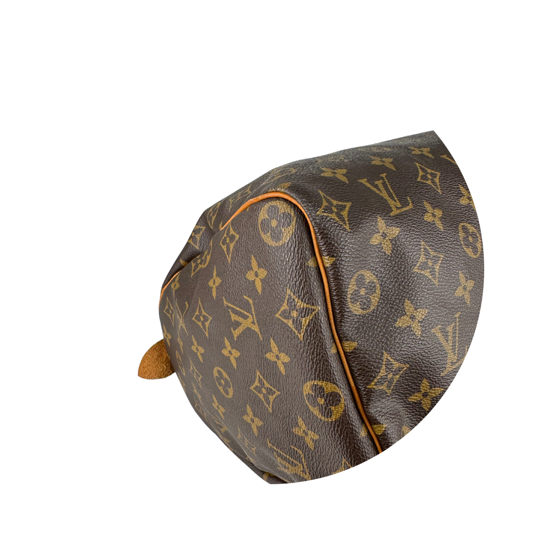 Classic LV Monogram coated canvas exterior with vachetta leather trim, gold-tone hardware, and brown canvas interior. Features zipper closure, and interior flap pocket. Includes certificate of authenticity.