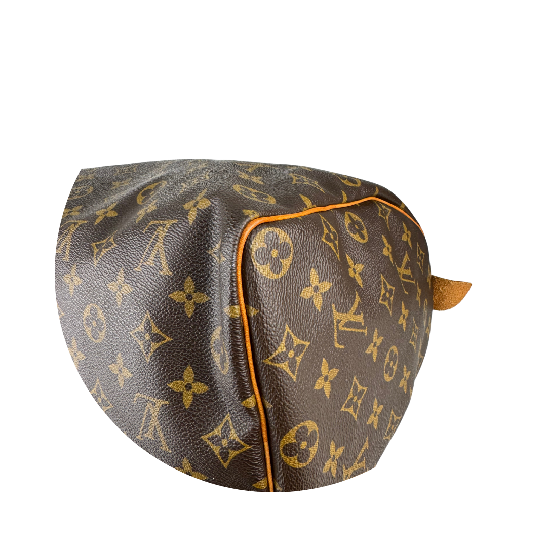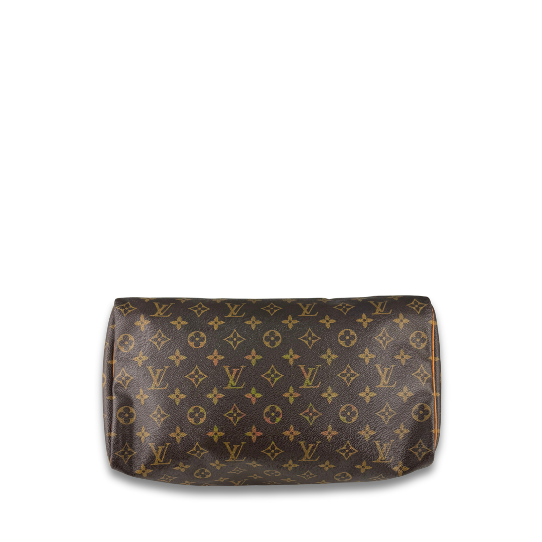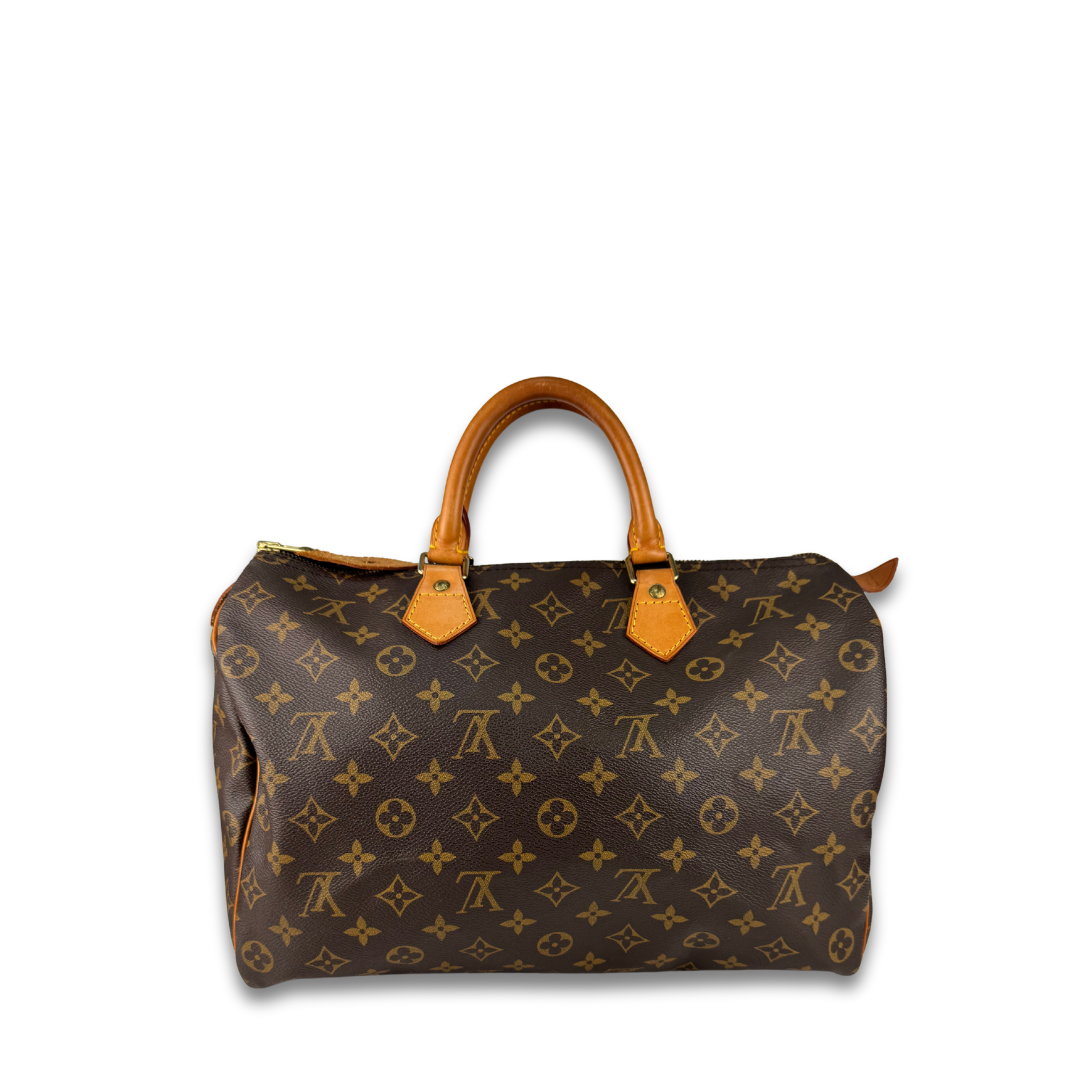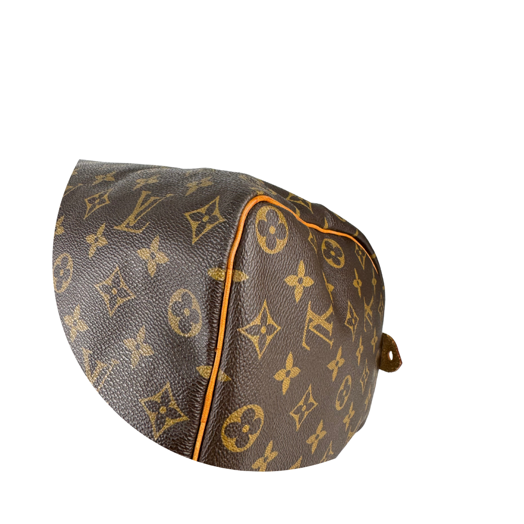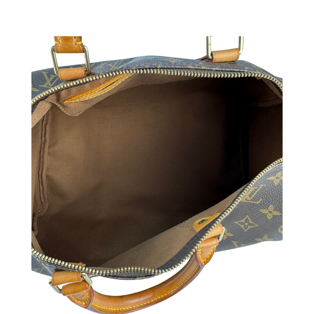 Classic LV Monogram coated canvas exterior with vachetta leather trim, gold-tone hardware, and brown canvas interior. Features zipper closure, and interior flap pocket. Includes certificate of authenticity.