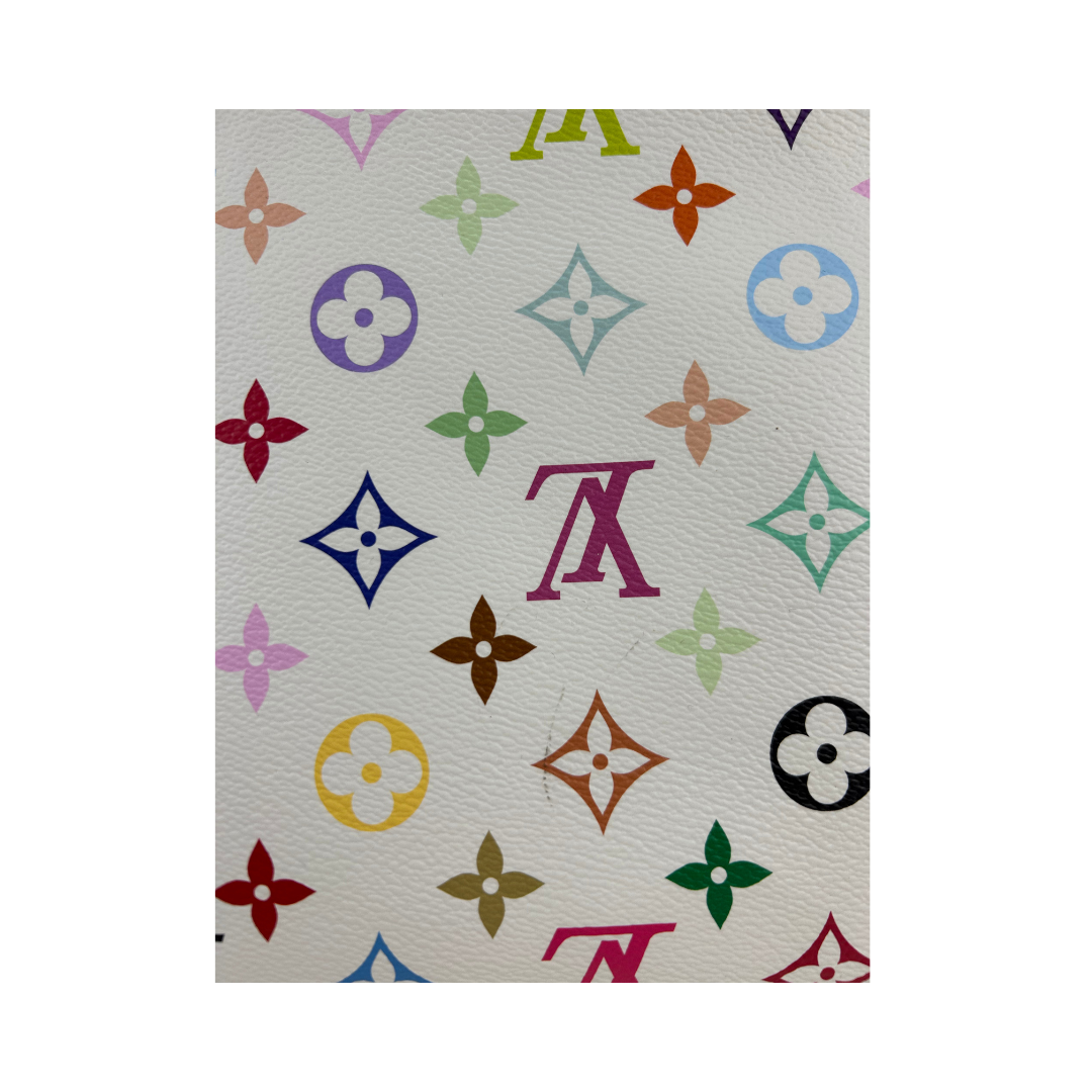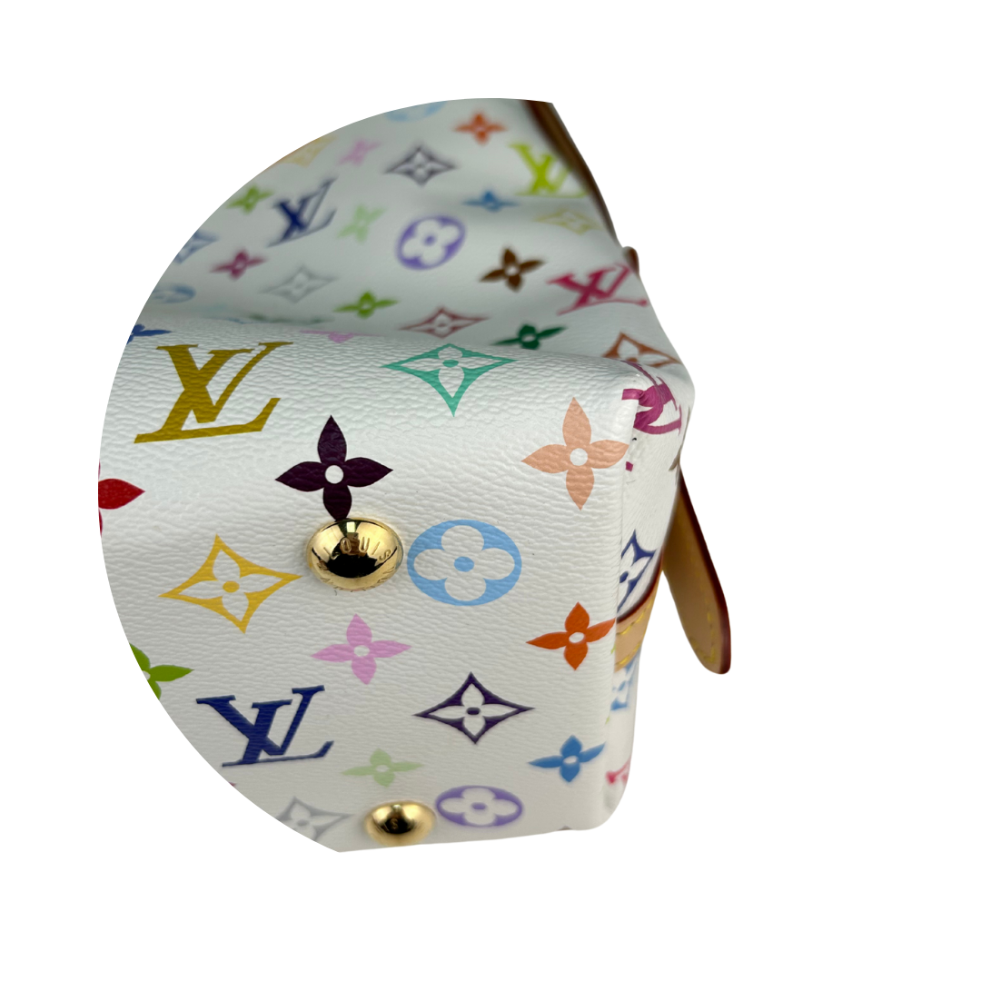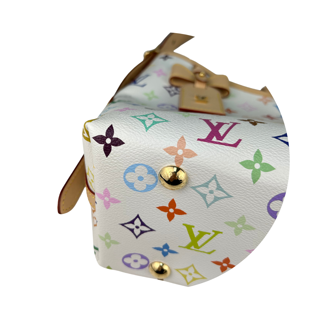 Limited edition Takashi Murakami white multicolor LV Monogram coated canvas exterior with vachetta leather trim, beige microfiber interior, and gold-tone hardware. Features leather shoulder strap, tie closure, bow and luggage tag charm, and several interior pockets. Includes original dust bag and certificate of authenticity.