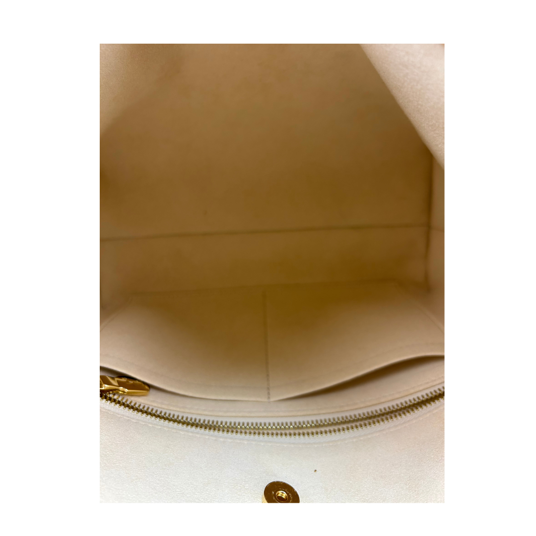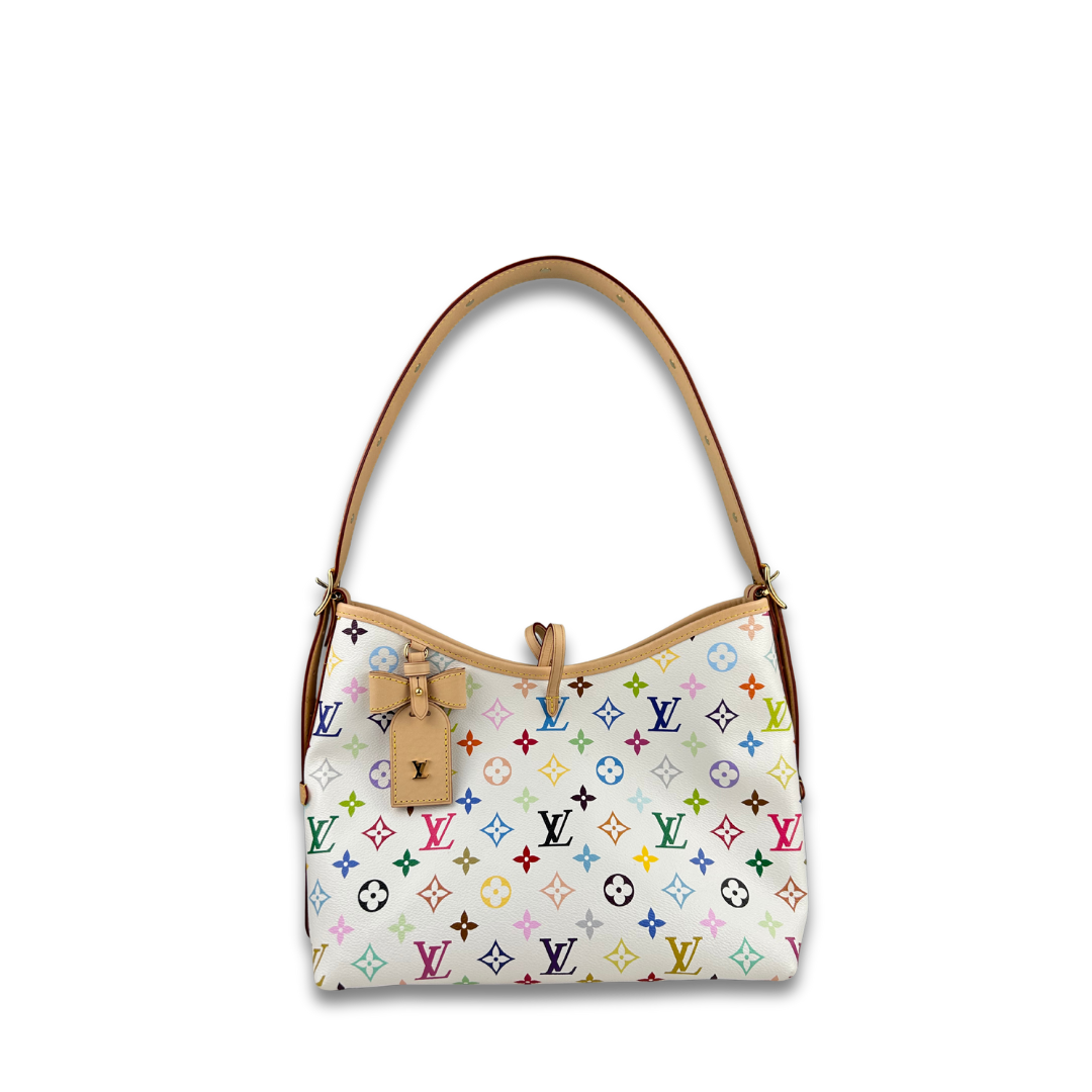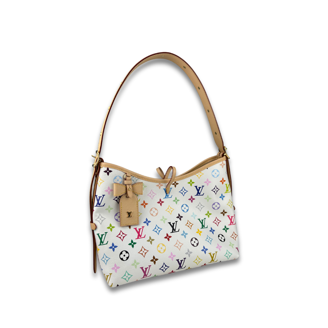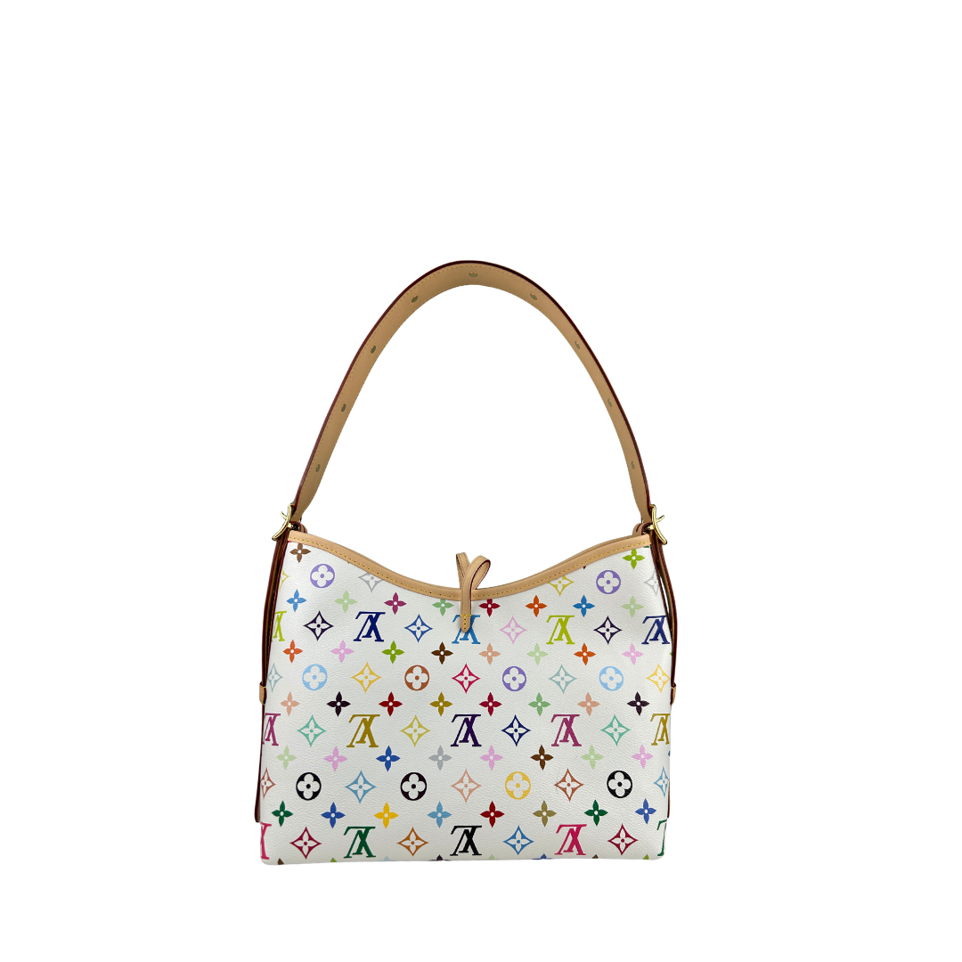 Limited edition Takashi Murakami white multicolor LV Monogram coated canvas exterior with vachetta leather trim, beige microfiber interior, and gold-tone hardware. Features leather shoulder strap, tie closure, bow and luggage tag charm, and several interior pockets. Includes original dust bag and certificate of authenticity.