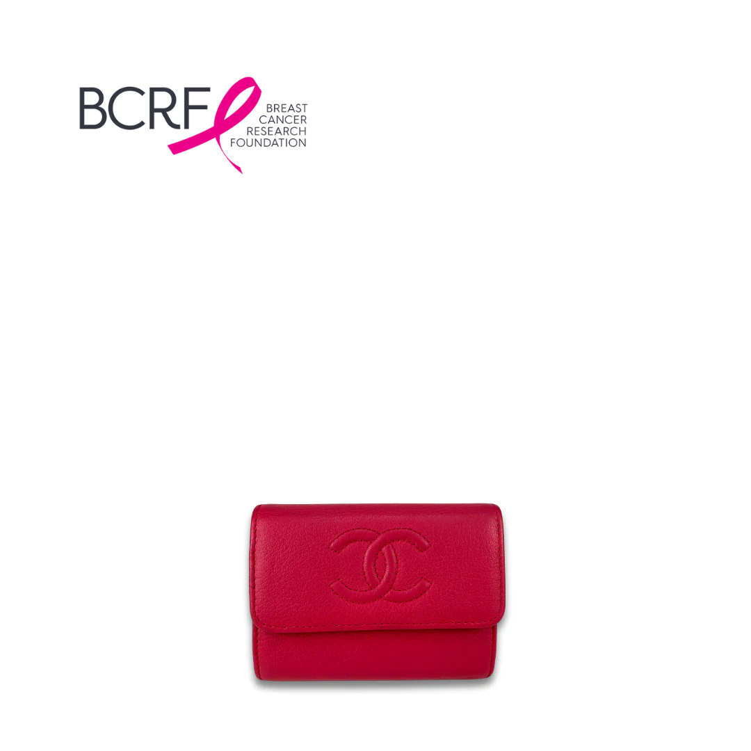 Pink calfskin exterior with tonal grosgrain interior and gold-tone hardware. Features snap closure, divided interior, and card slot. Includes certificate of authenticity.