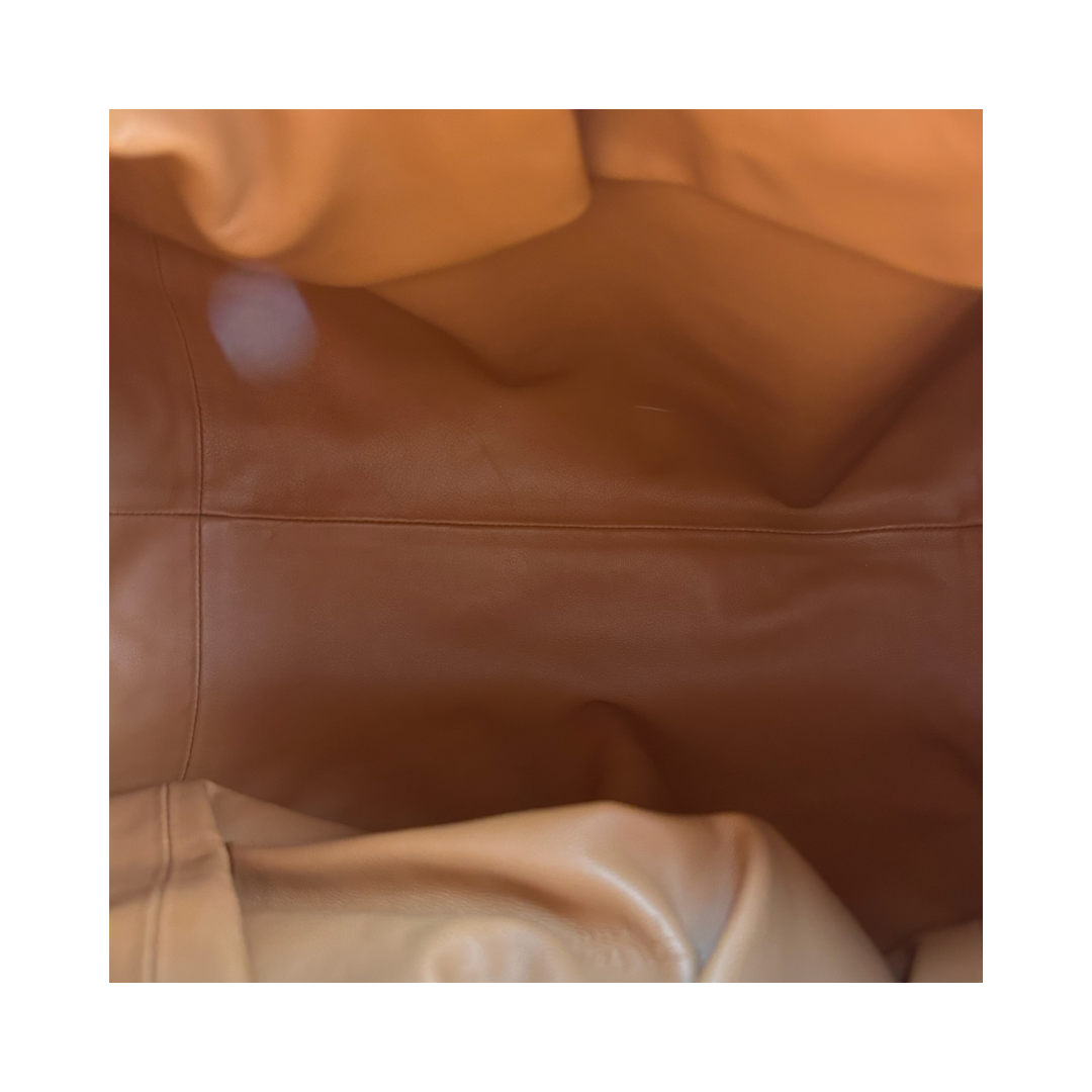 Burnt orange calfskin leather exterior and tonal leather interior. Features ruched leather top with a magnetic closure and a looping top handle . Includes certificate of authenticity.