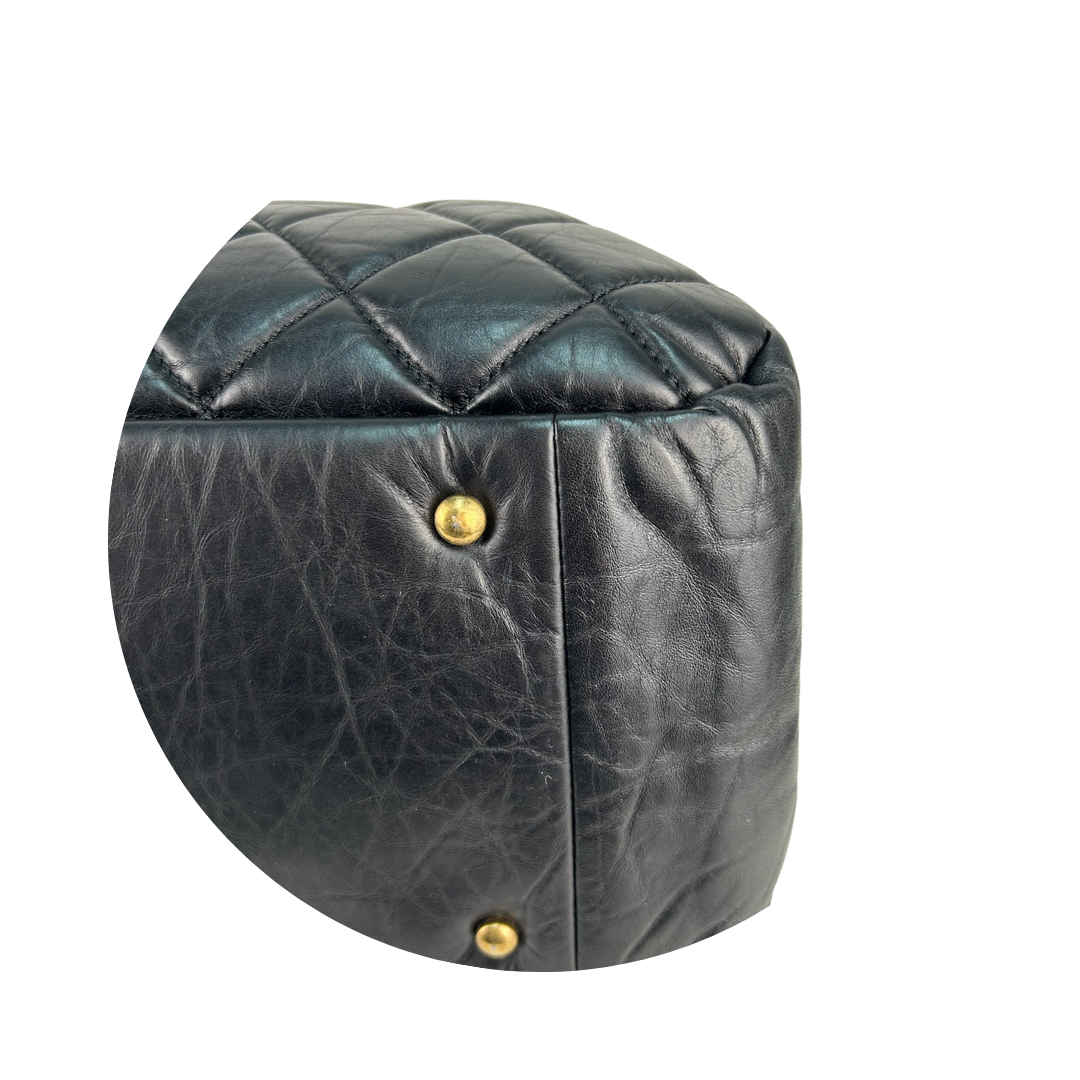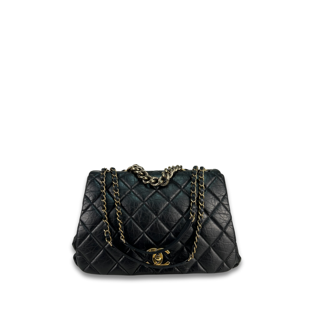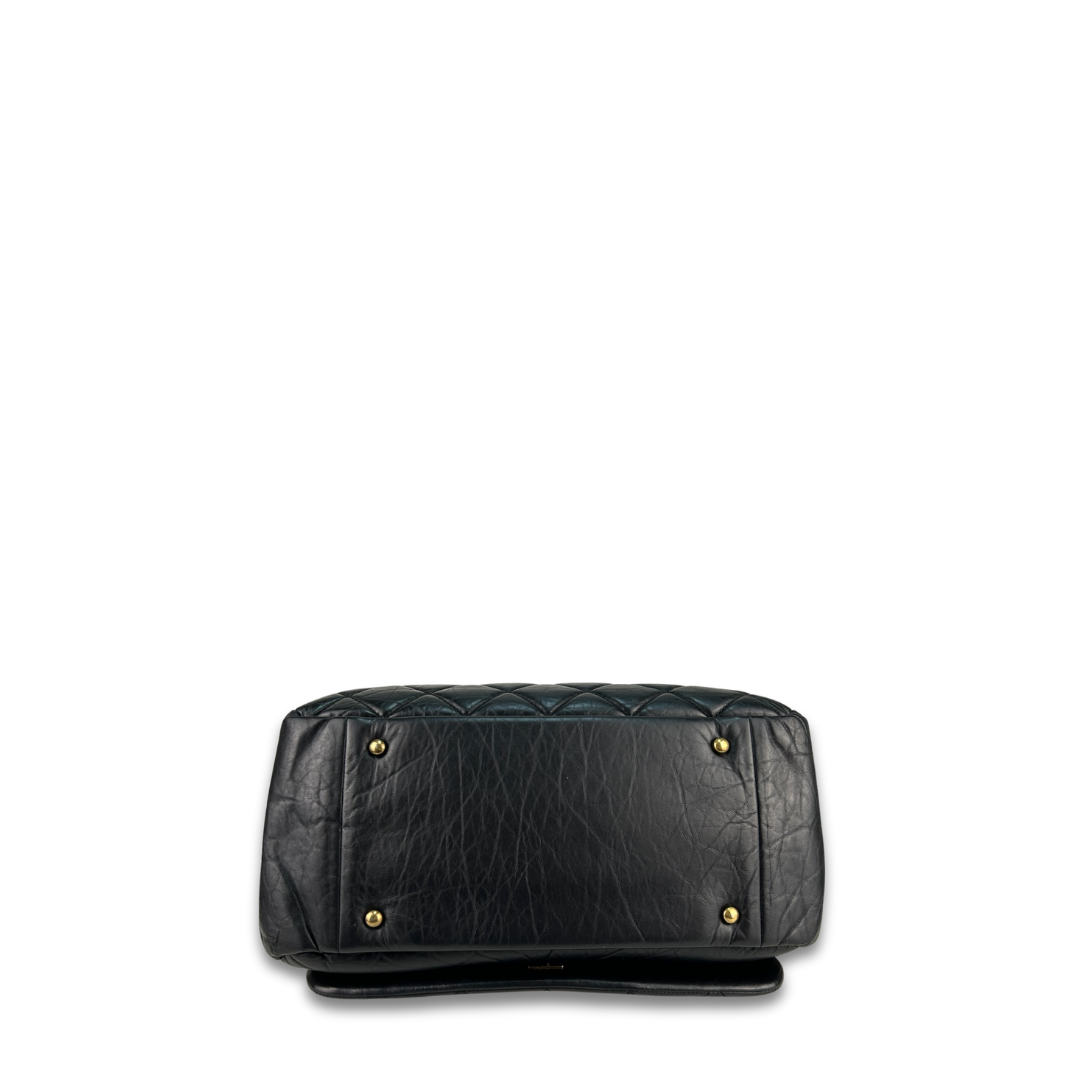 Black quilted aged calfskin exterior, burgundy grosgrain interior, and aged gold-tone hardware. Features interlocking CC turnlock closure, interior pockets, leather-woven chain strap with leather shoulder guards that can be worn singled or doubled, and a textured aged gold-tone chain top handle. Includes certificate of authenticity.