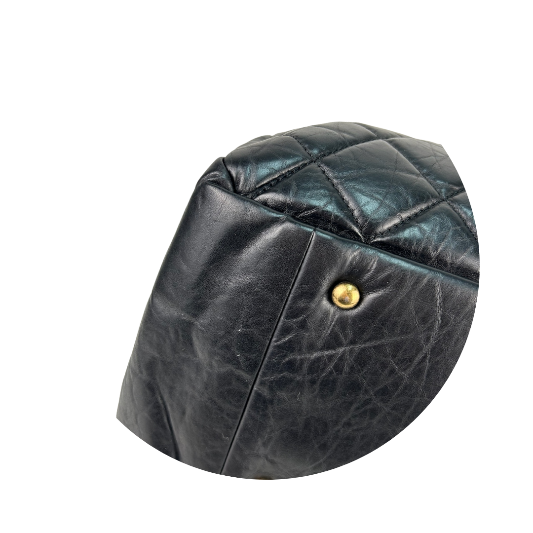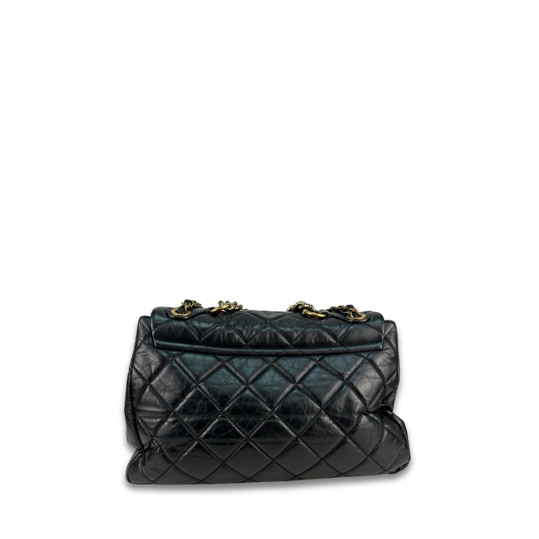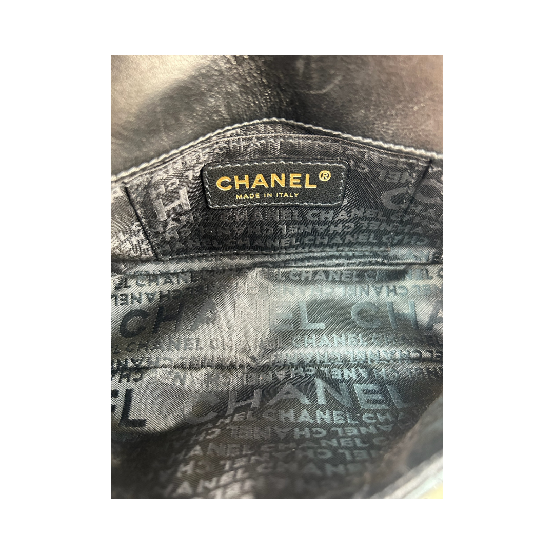 Black quilted aged calfskin exterior, burgundy grosgrain interior, and aged gold-tone hardware. Features interlocking CC turnlock closure, interior pockets, leather-woven chain strap with leather shoulder guards that can be worn singled or doubled, and a textured aged gold-tone chain top handle. Includes certificate of authenticity.