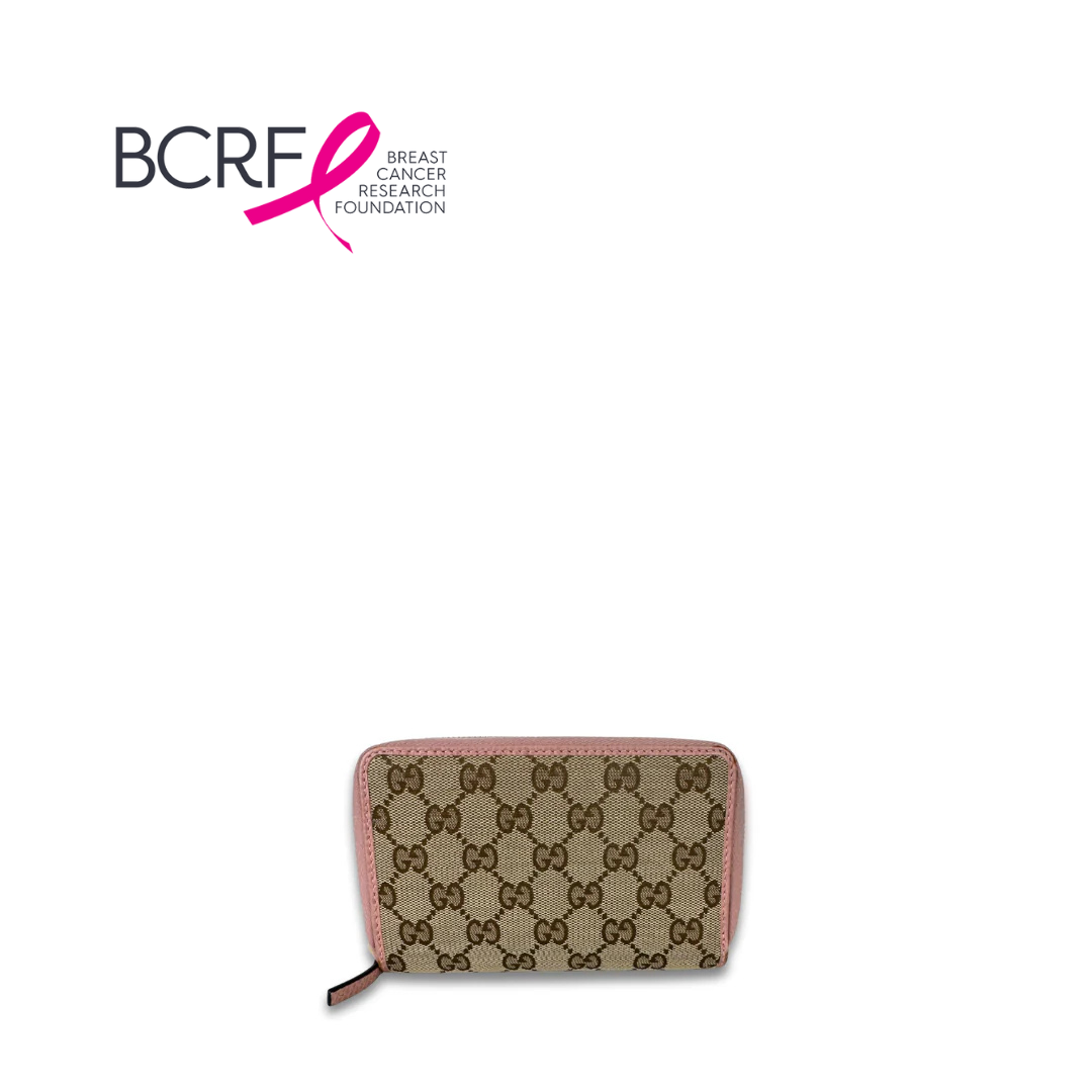 Beige and brown GG supreme canvas exterior with light pink leather trim, tonal leather interior and gold-tone hardware. Features wrap-around zipper closure, interior card slots, and zipper pocket. Includes certificate of authenticity.