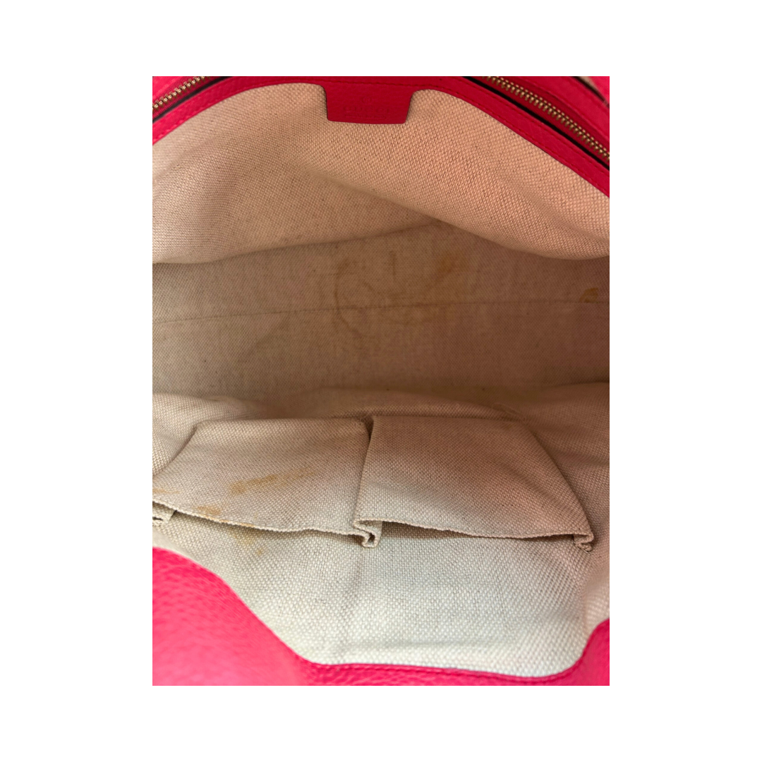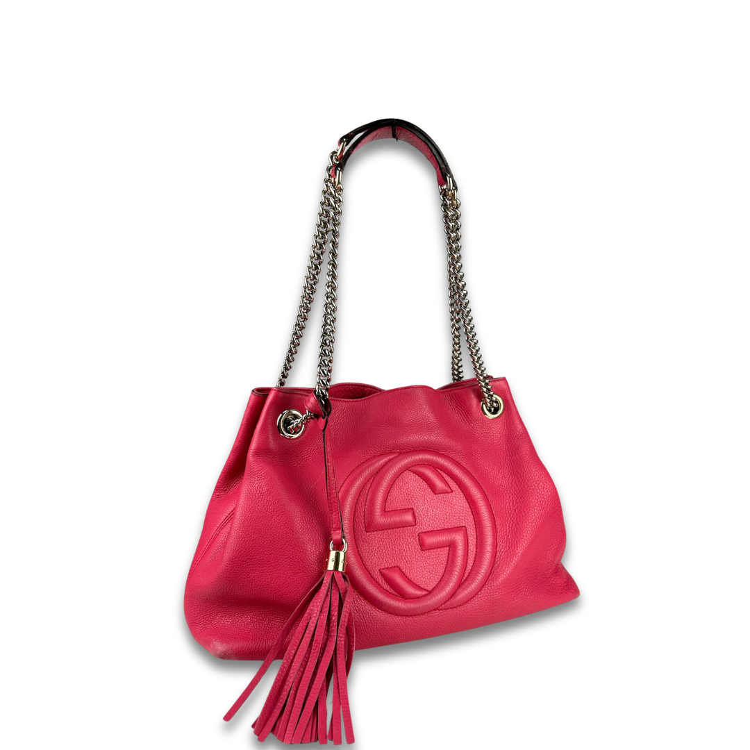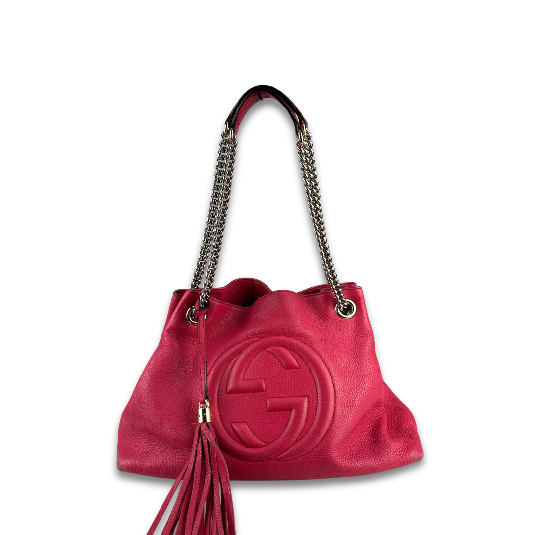 Pink textured leather exterior with beige woven interior and polished gold-tone hardware. Features clasp closure at top, three interior pockets, single convertible chain link shoulder strap with removable tassel accent and leather shoulder guard, and embossed GG logo at front. Please note, corner wear as pictured. Includes certificate of authenticity.
