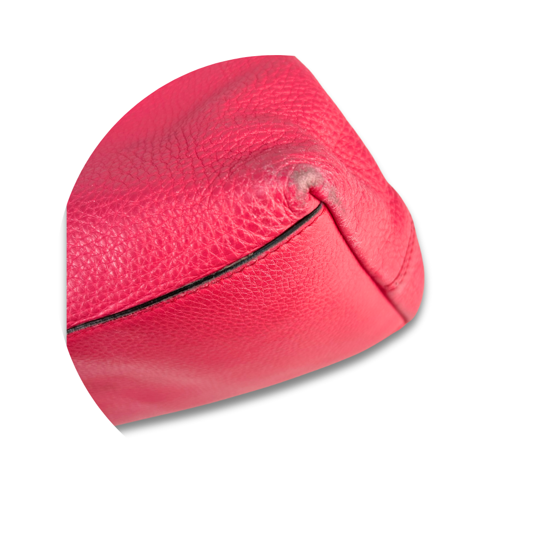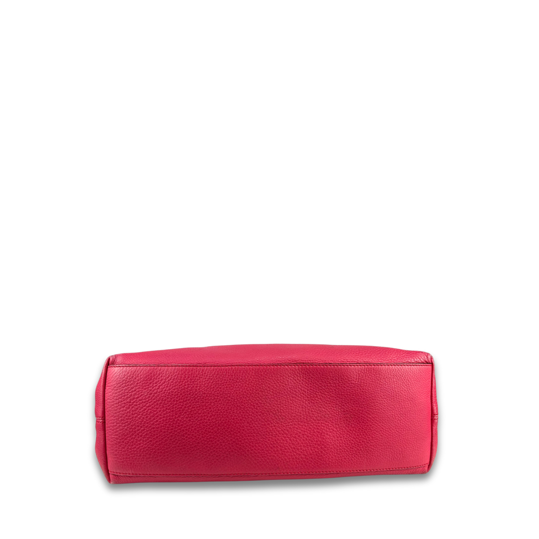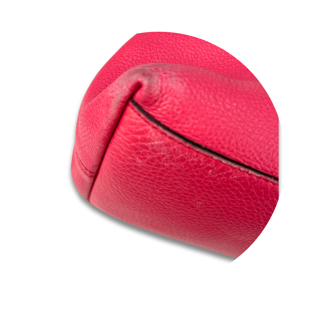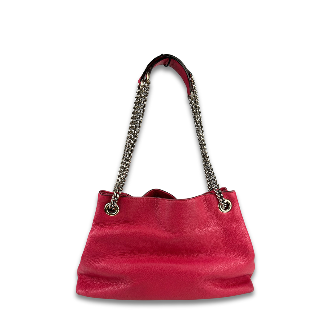Pink textured leather exterior with beige woven interior and polished gold-tone hardware. Features clasp closure at top, three interior pockets, single convertible chain link shoulder strap with removable tassel accent and leather shoulder guard, and embossed GG logo at front. Please note, corner wear as pictured. Includes certificate of authenticity.