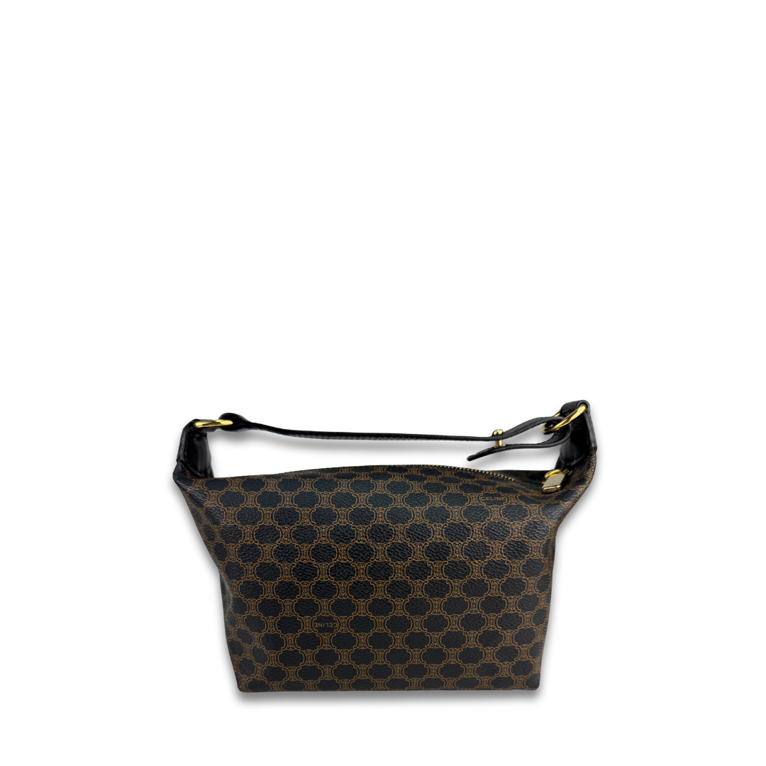 Macadam coated canvas exterior, black canvas interior, and gold-tone hardware. Features black leather snap handle, zipper closure, and interior patch pocket. Includes certificate of authenticity.