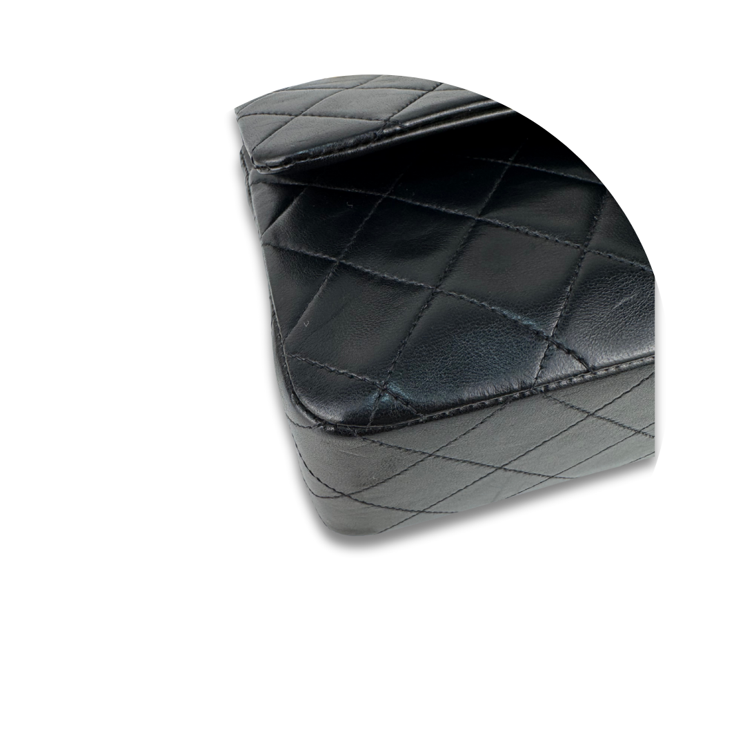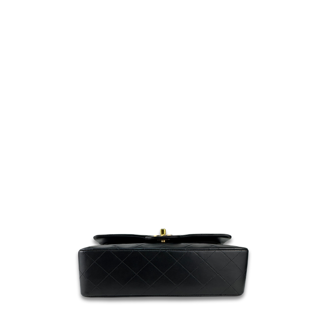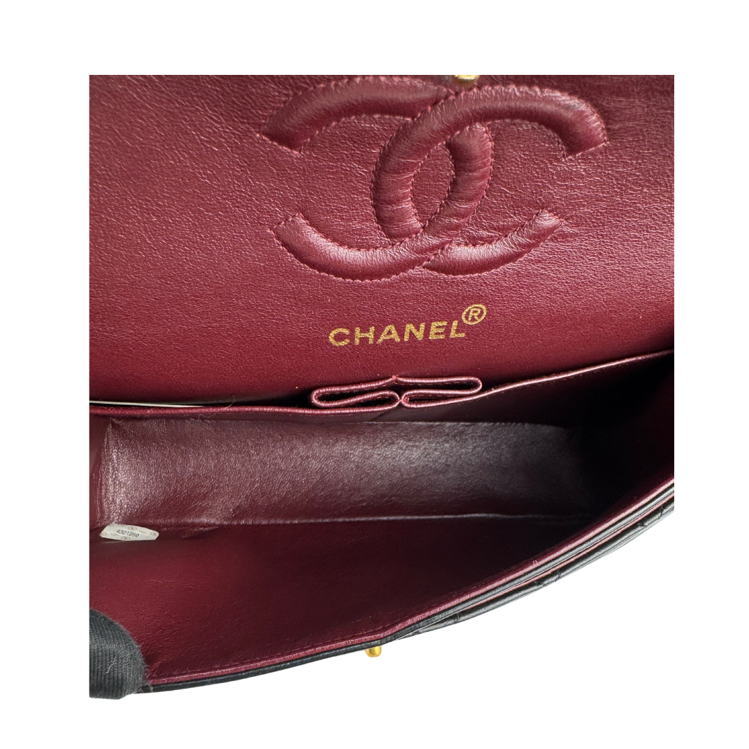Black lambskin exterior and burgundy calfskin interior with gold-tone hardware. Features exterior patch pocket at back, zipper pocket at inner flap, two interior patch pockets, and interlocking CC turn-lock closure. Includes certificate of authenticity, original dust bag, and card of authenticity.