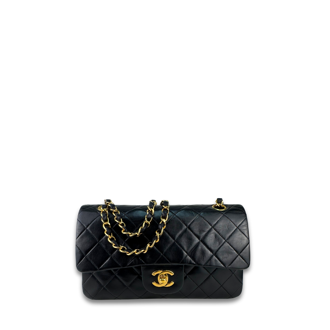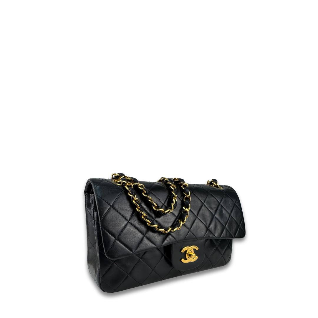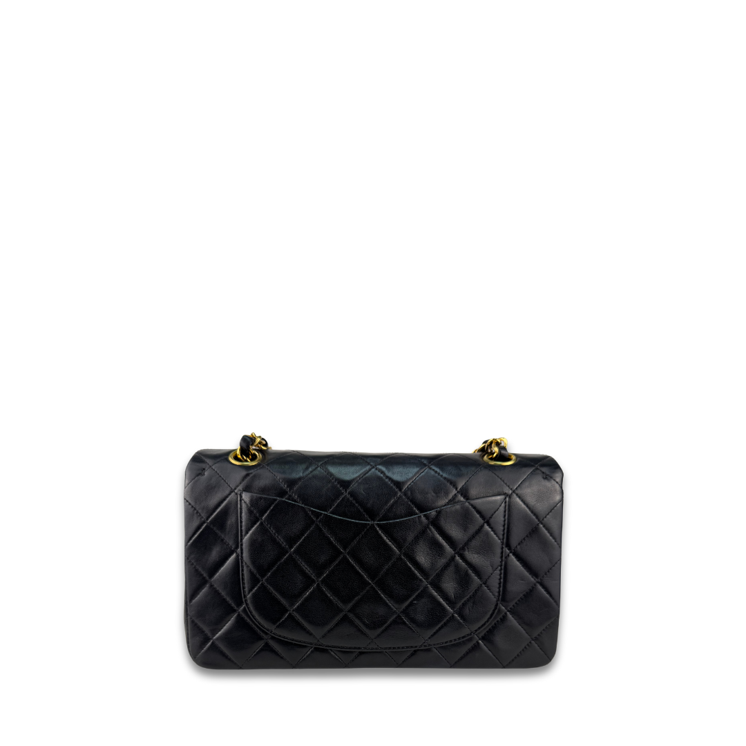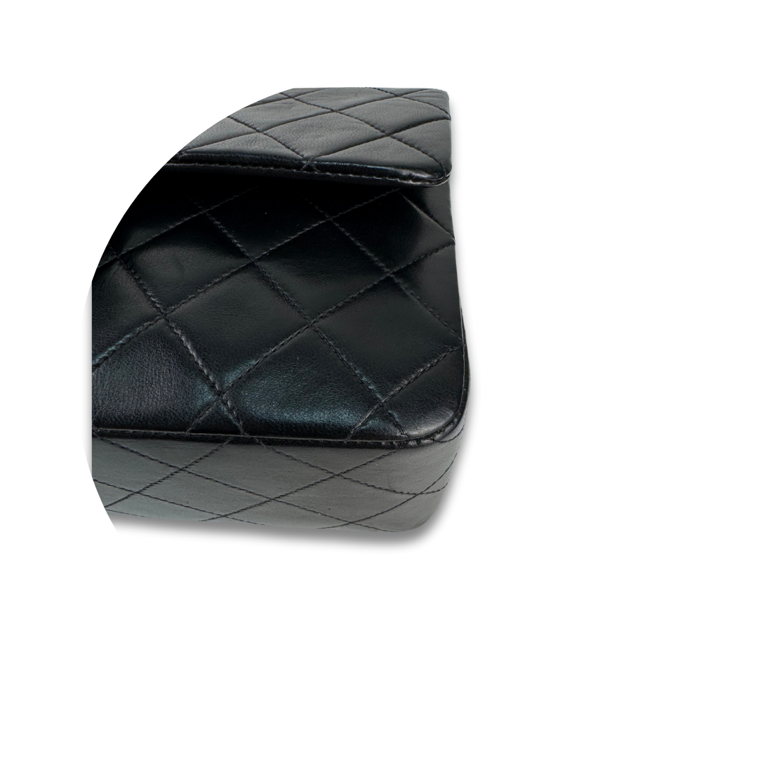 Black lambskin exterior and burgundy calfskin interior with gold-tone hardware. Features exterior patch pocket at back, zipper pocket at inner flap, two interior patch pockets, and interlocking CC turn-lock closure. Includes certificate of authenticity, original dust bag, and card of authenticity.