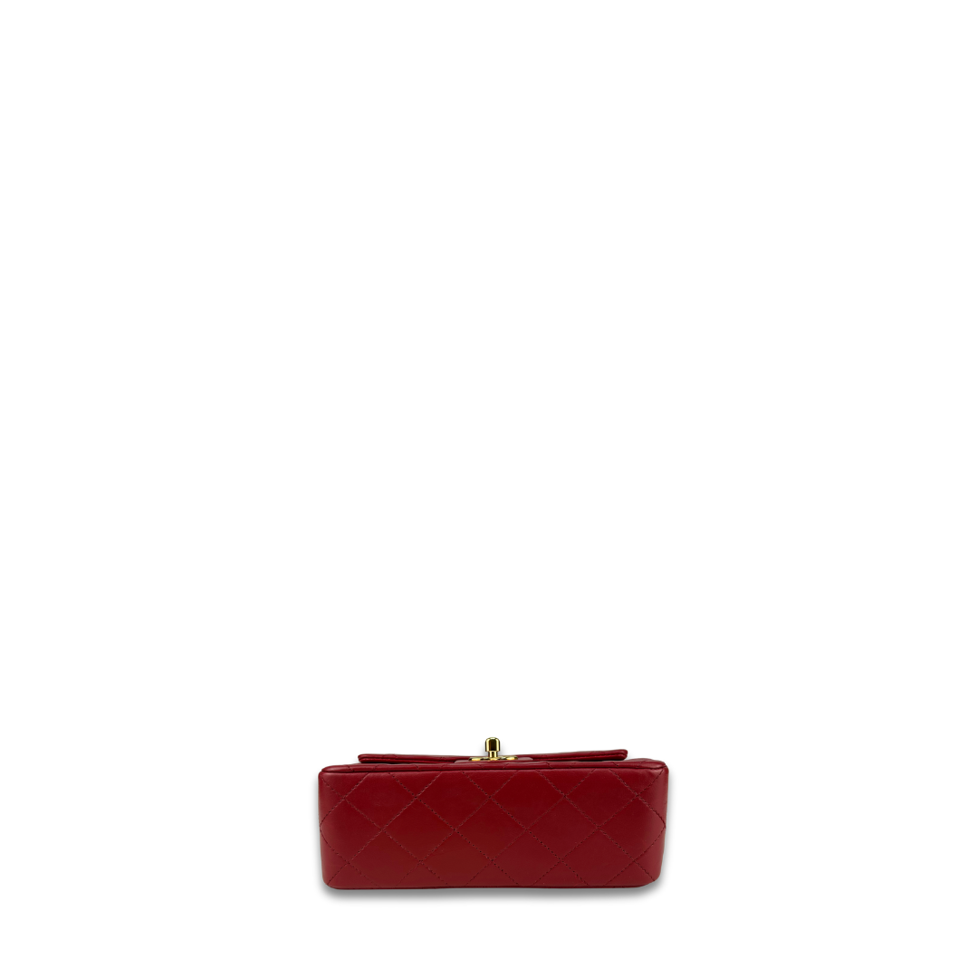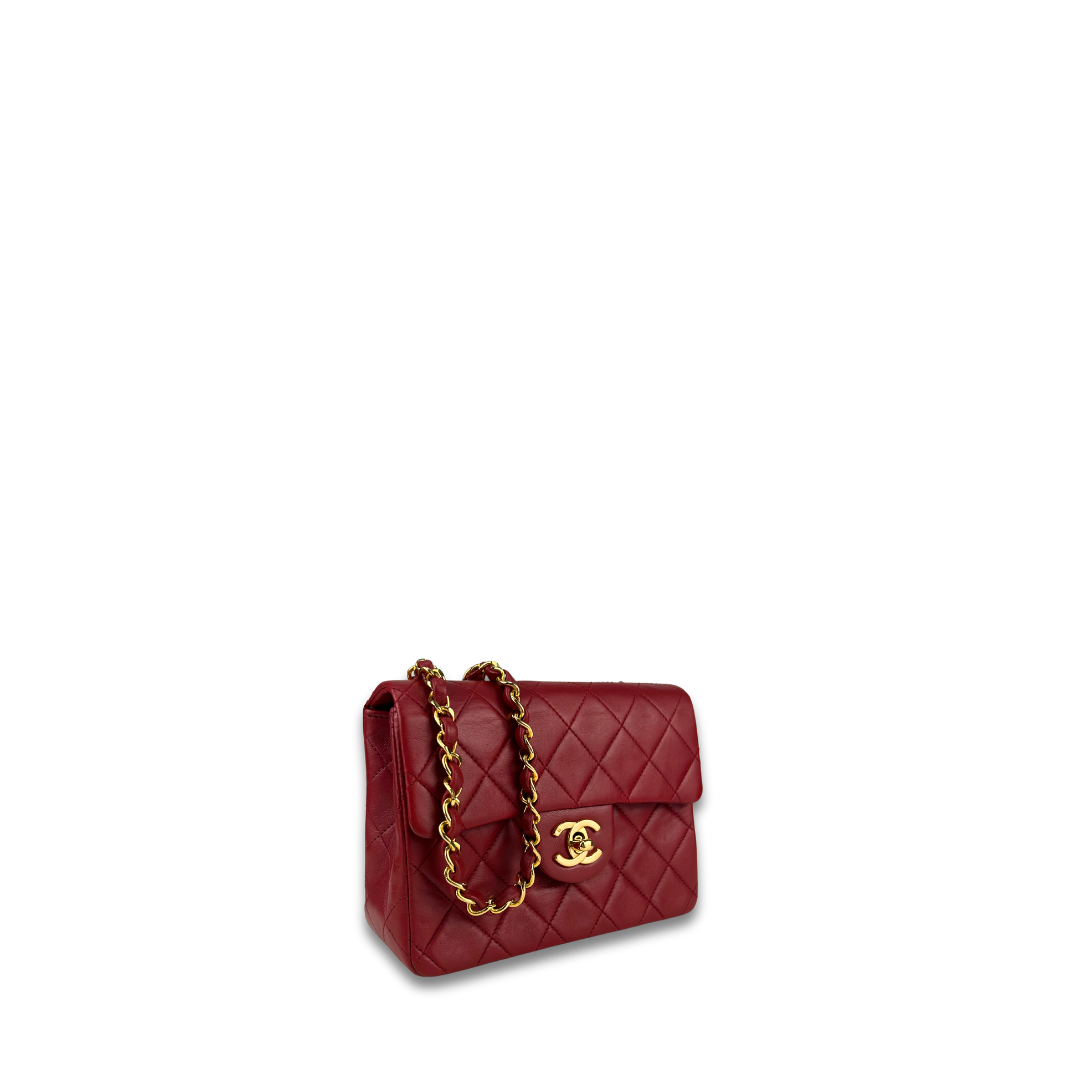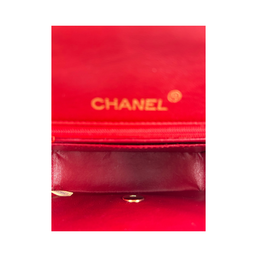 Red quilted lambskin exterior with burgundy calfskin interior and gold hardware. Features interlocking CC turnlock closure, leather woven chain strap, rear exterior patch pocket, interior zipper pocket, and interior patch pocket. Includes a certificate of authenticity, original dust bag, and card of authenticity.