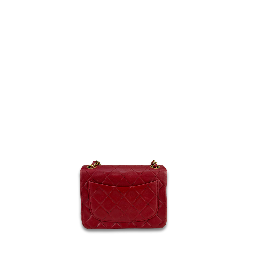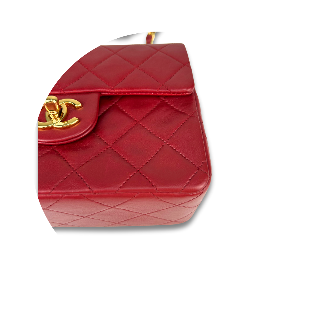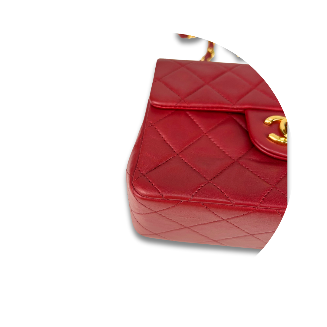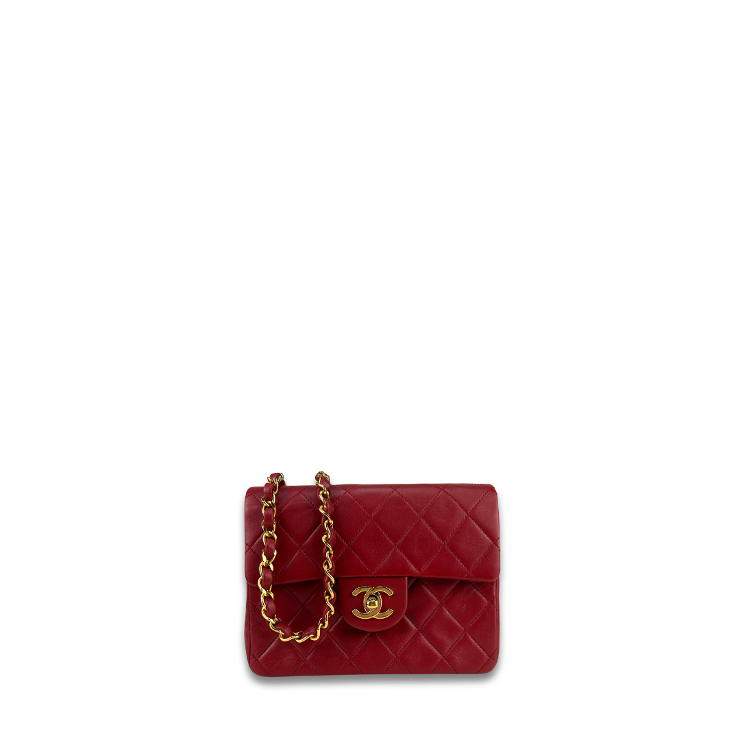 Red quilted lambskin exterior with burgundy calfskin interior and gold hardware. Features interlocking CC turnlock closure, leather woven chain strap, rear exterior patch pocket, interior zipper pocket, and interior patch pocket. Includes a certificate of authenticity, original dust bag, and card of authenticity.