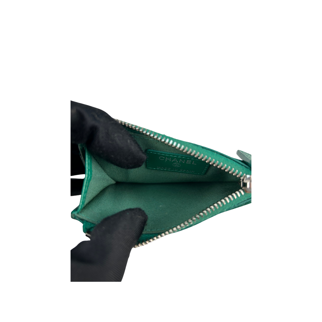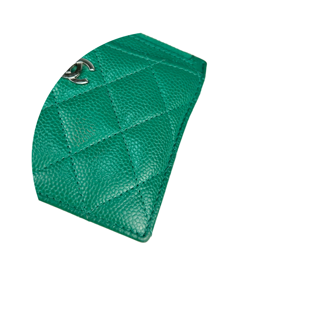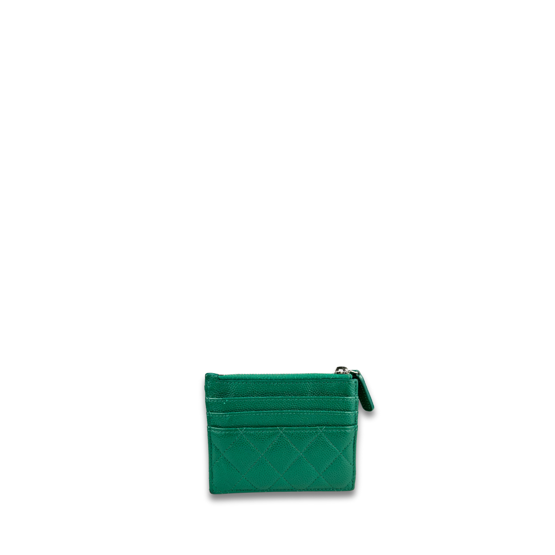 Green pebbled Caviar leather exterior with tonal leather interior and silver-tone hardware. Features four exterior card slots and zipper compartment. Please note corner wear. Includes certificate of authenticity, dust bag, and box.