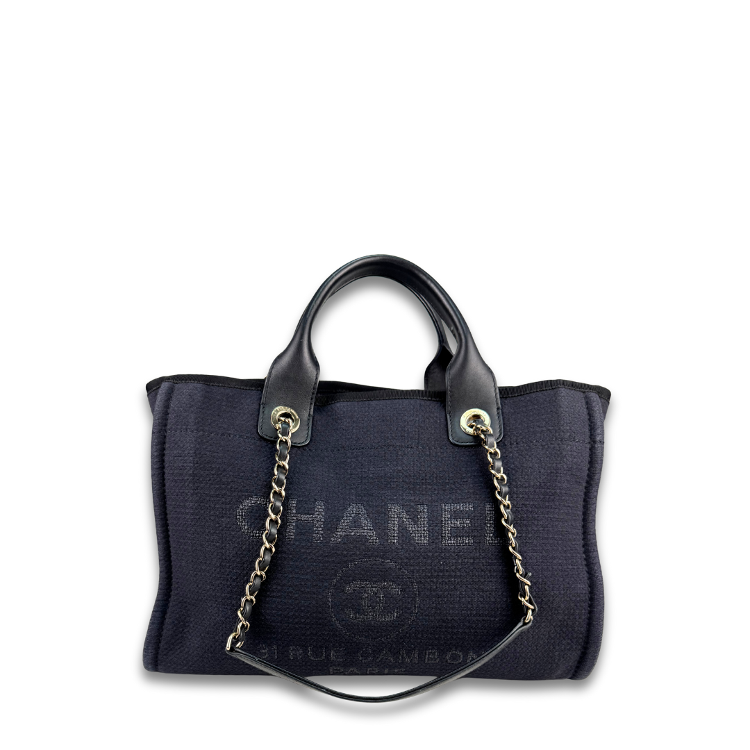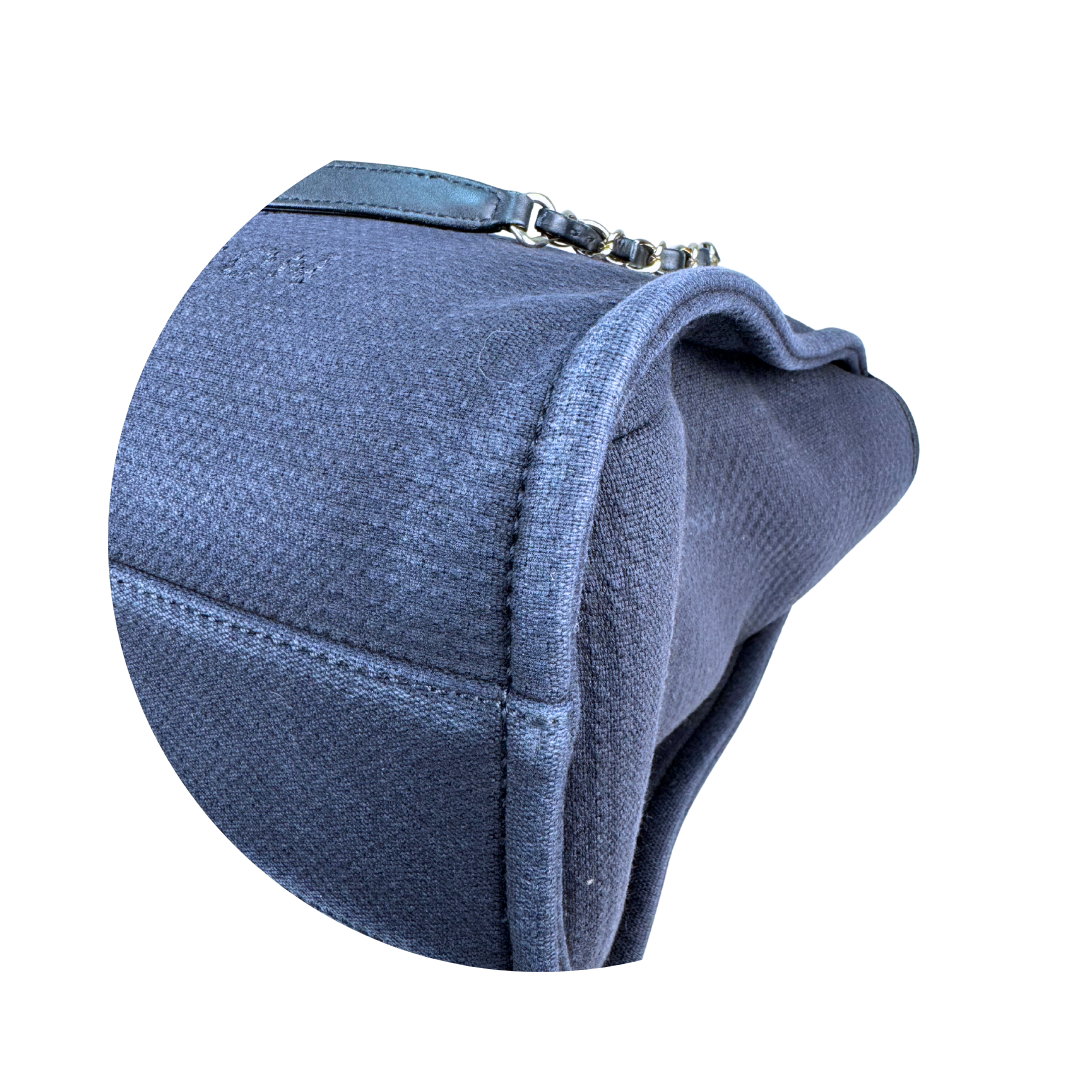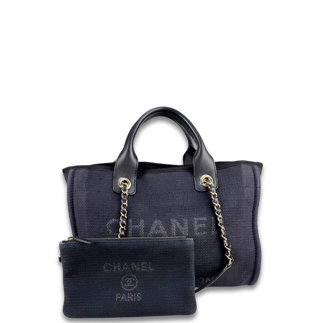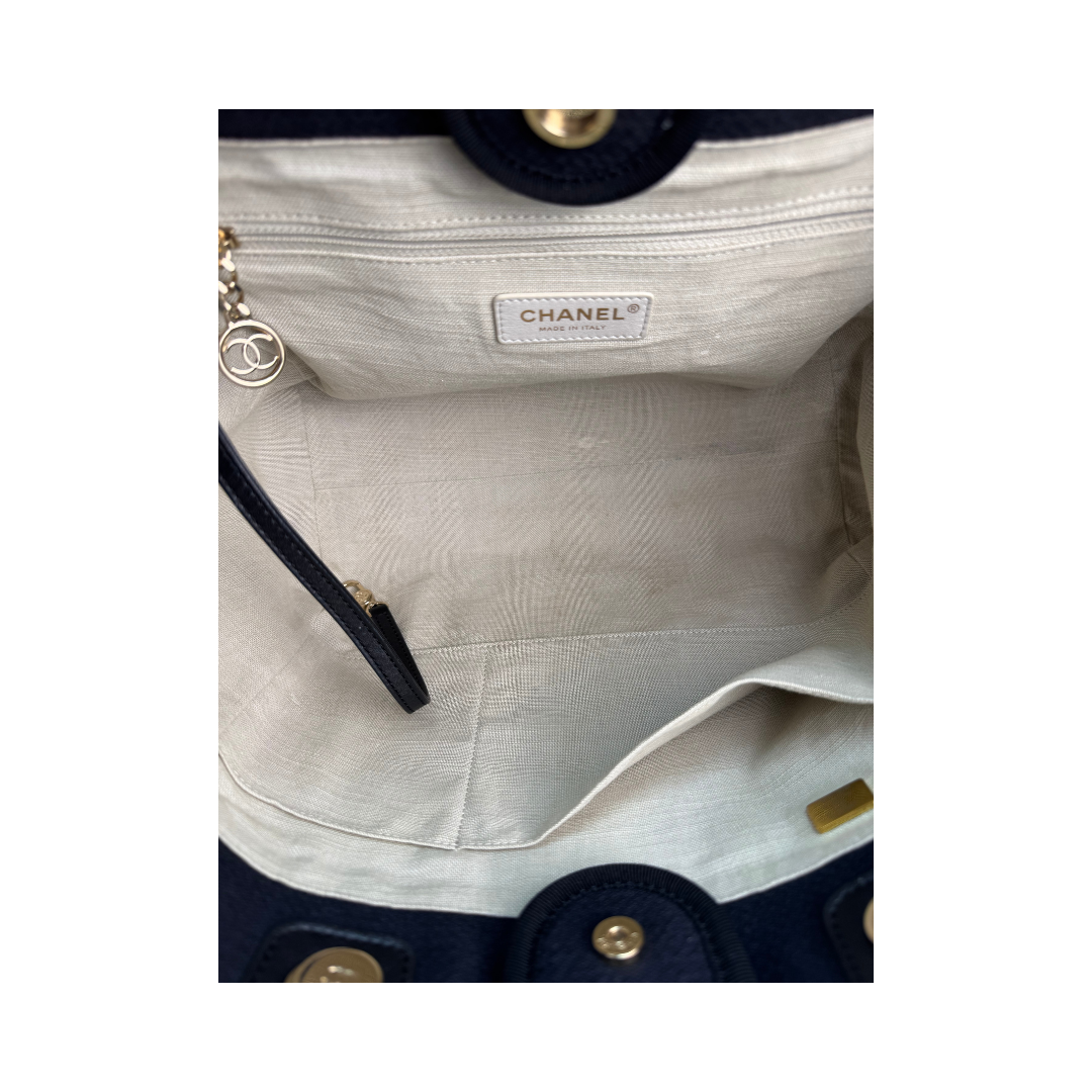 Navy blue mixed fibers exterior, beige fabric interior and Chanel Champagne gold-tone hardware. Features Chanel Rue Cambon Paris logo, rolled leather top handles, snap closure, chain link shoulder straps, interior zipper pocket, two patch pockets, and detachable matching wristlet. Includes certificate of authenticity and original dust bag.