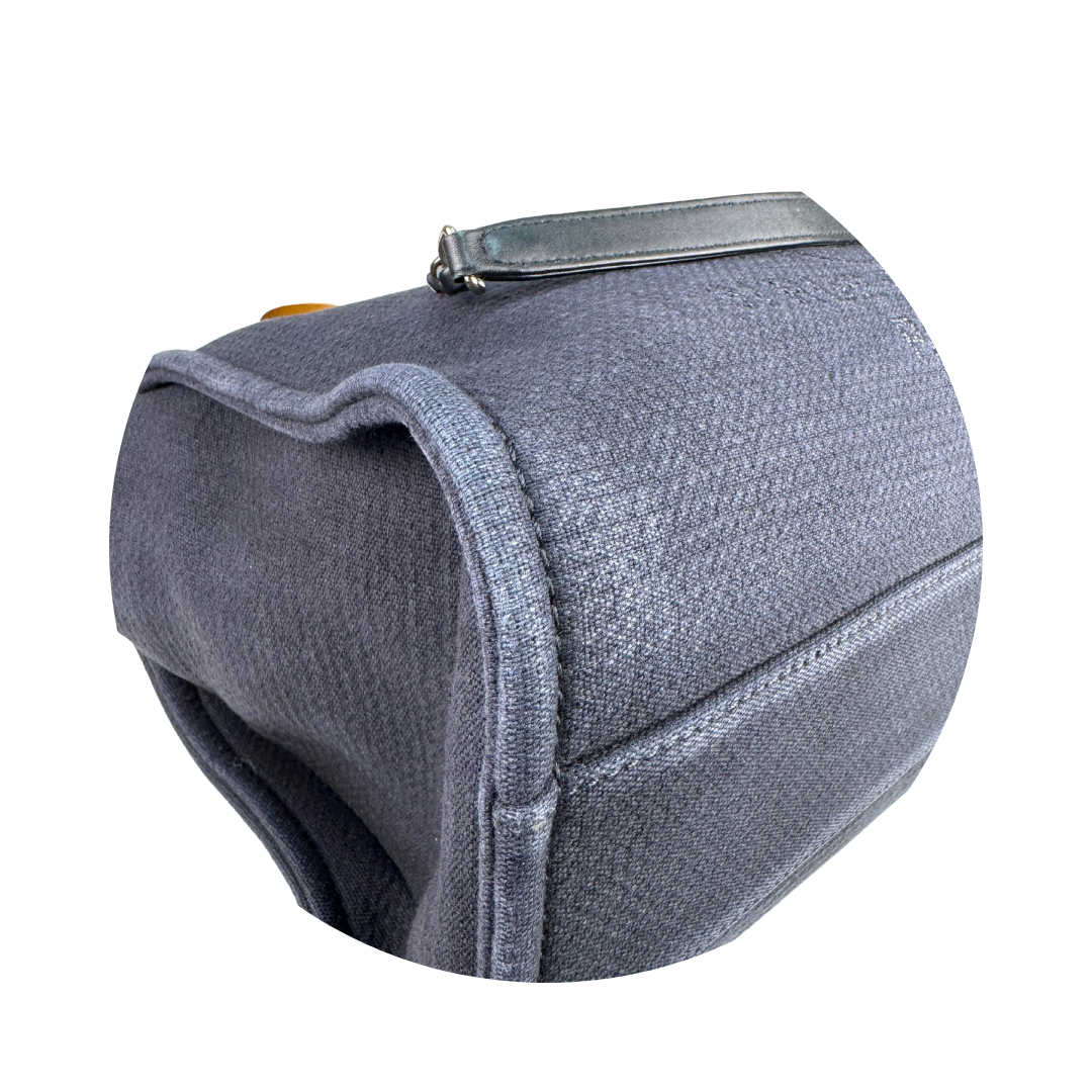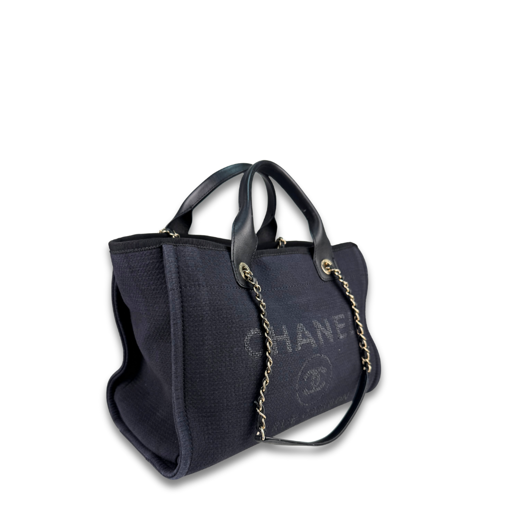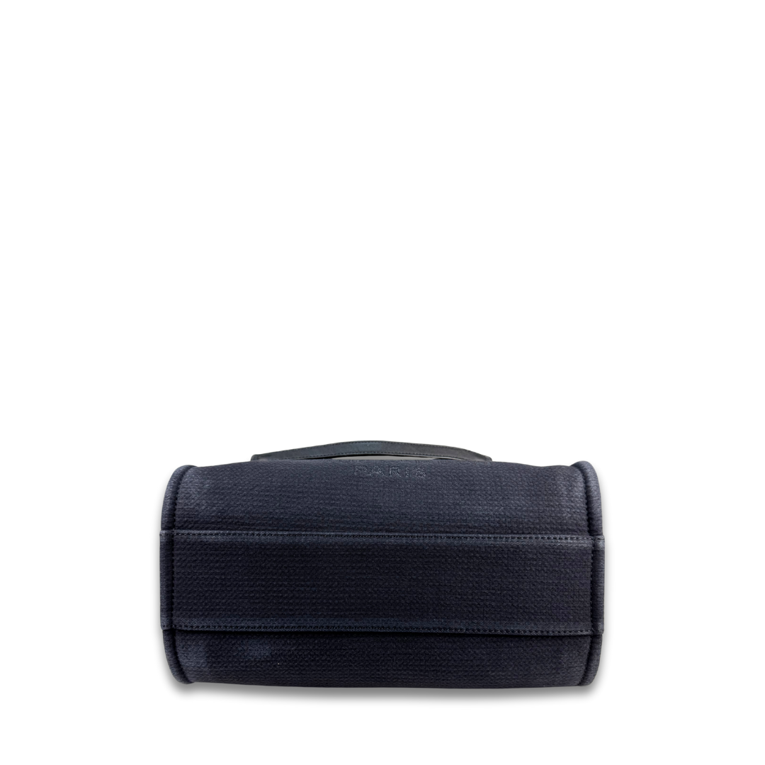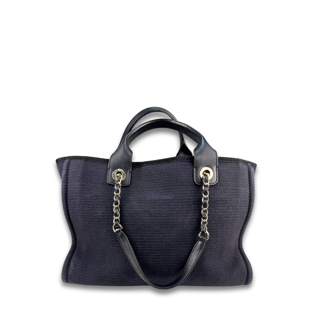 Navy blue mixed fibers exterior, beige fabric interior and Chanel Champagne gold-tone hardware. Features Chanel Rue Cambon Paris logo, rolled leather top handles, snap closure, chain link shoulder straps, interior zipper pocket, two patch pockets, and detachable matching wristlet. Includes certificate of authenticity and original dust bag.