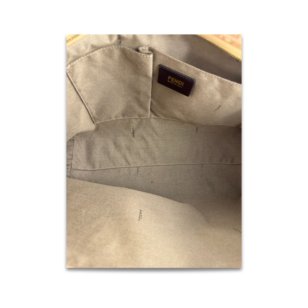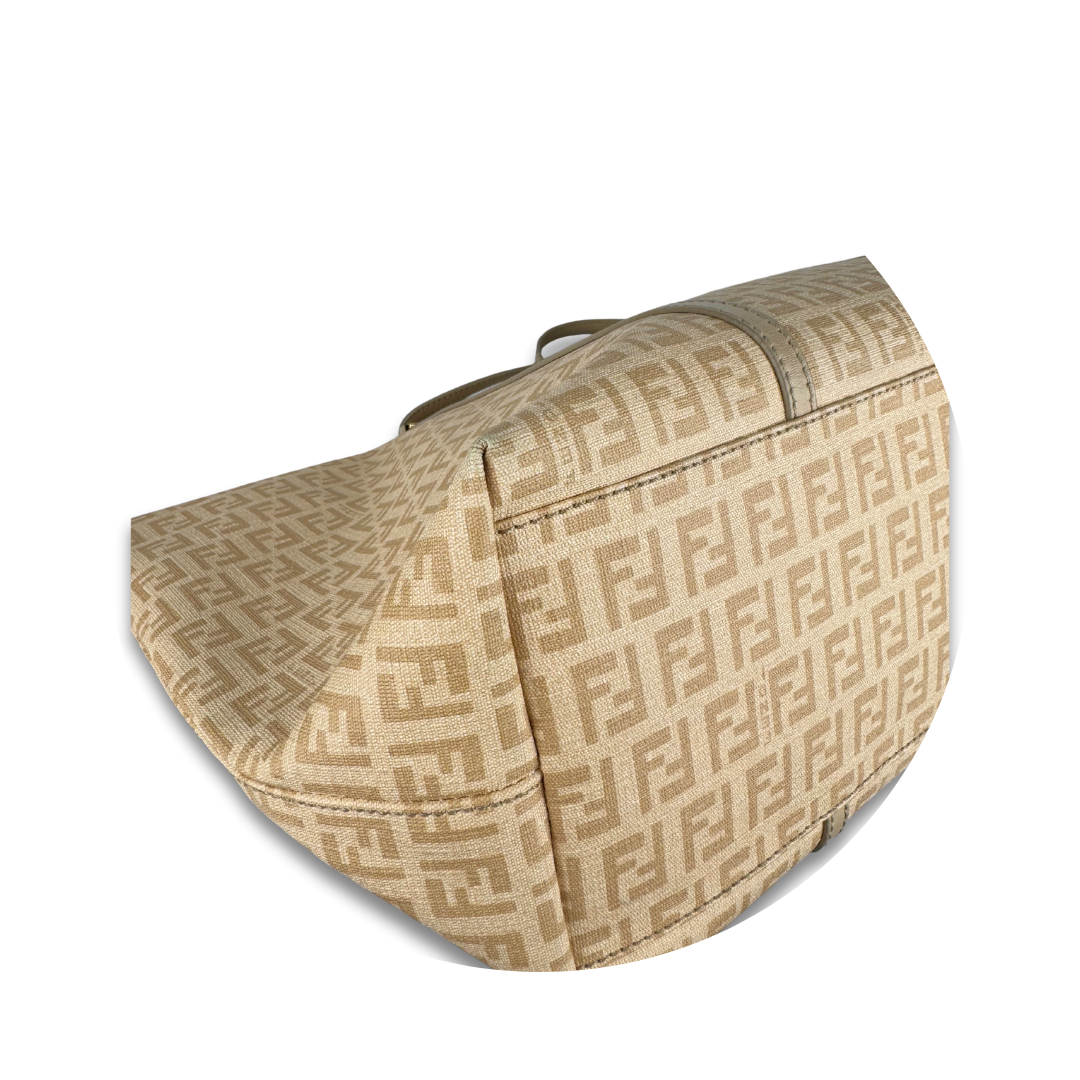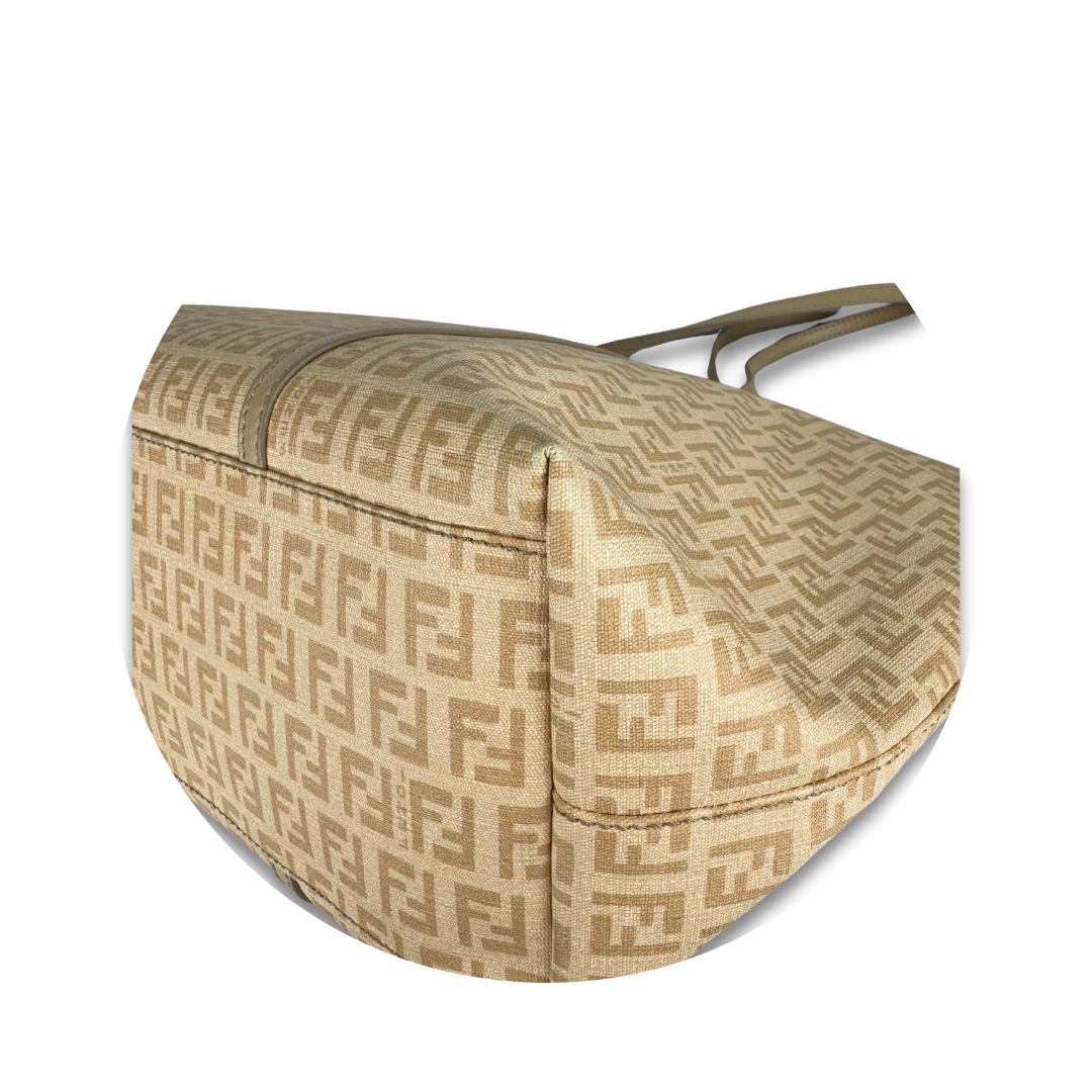 Beige and tan zucchino coated canvas exterior with tonal leather trim, canvas interior, and gold-tone hardware. Features leather shoulder straps, zipper closure and interior pockets. Includes certificate of authenticity.