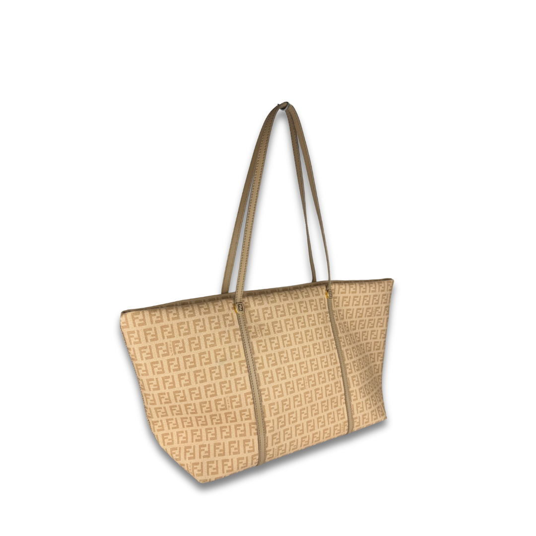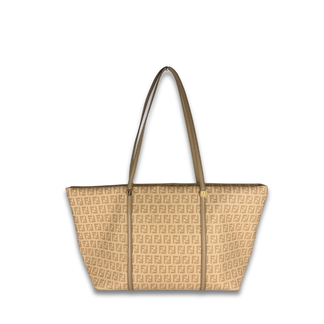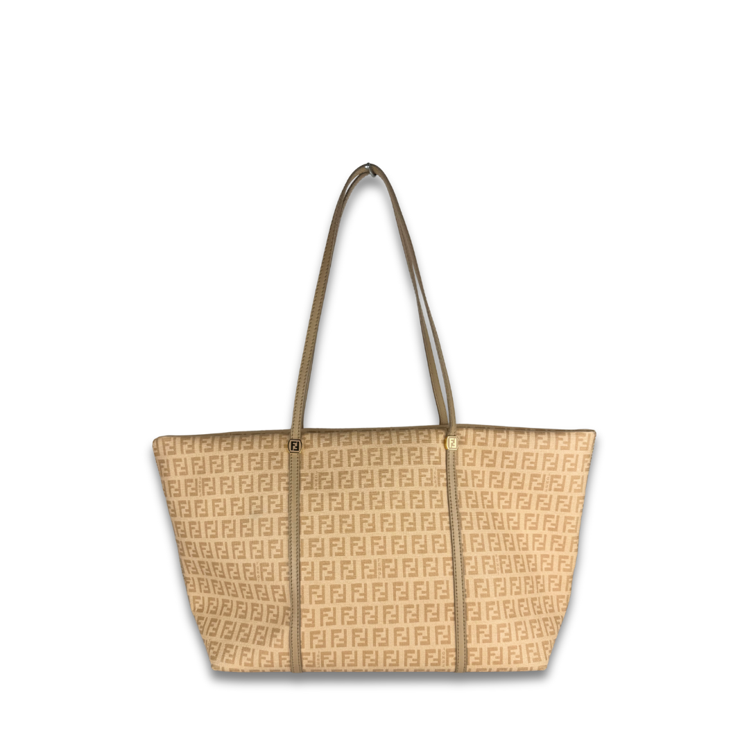 Beige and tan zucchino coated canvas exterior with tonal leather trim, canvas interior, and gold-tone hardware. Features leather shoulder straps, zipper closure and interior pockets. Includes certificate of authenticity.