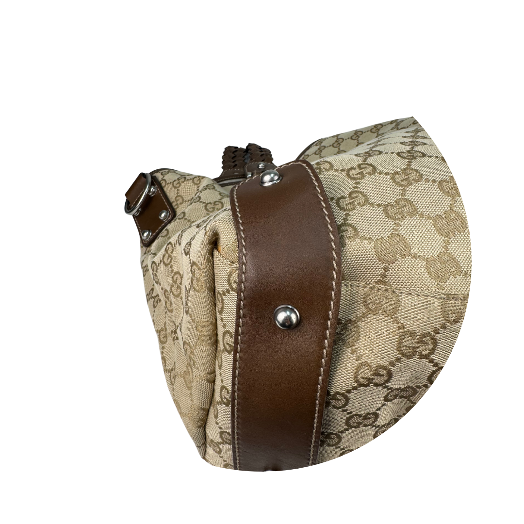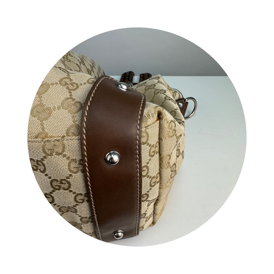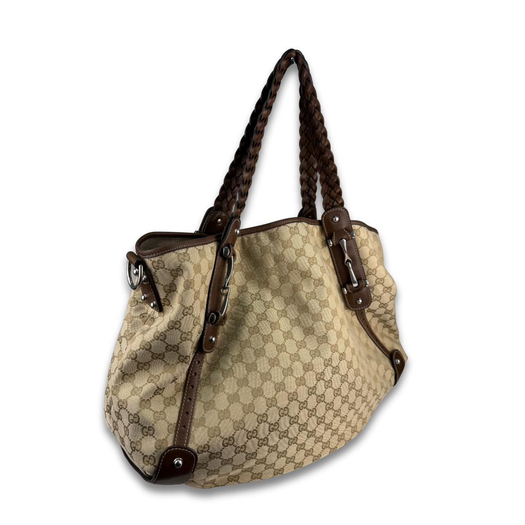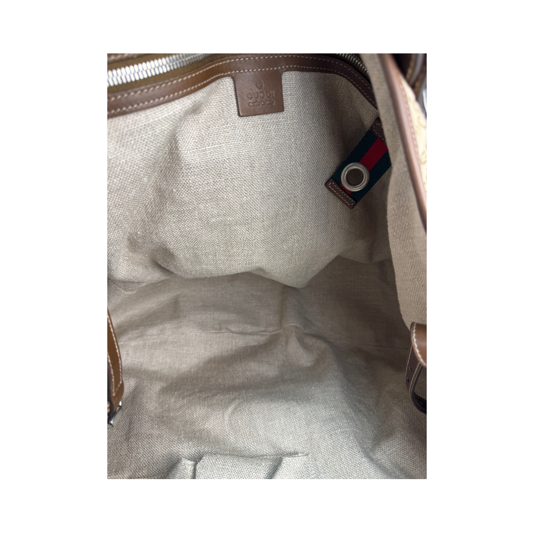 Brown and beige Gucci GG supreme canvas exterior with brown leather trim, beige fabric interior and silver-tone hardware. Features dual leather woven straps, detachable leather strap, open top, interior zipper pocket, and Gucci horsebit details and studs. Includes a certificate of authenticity.