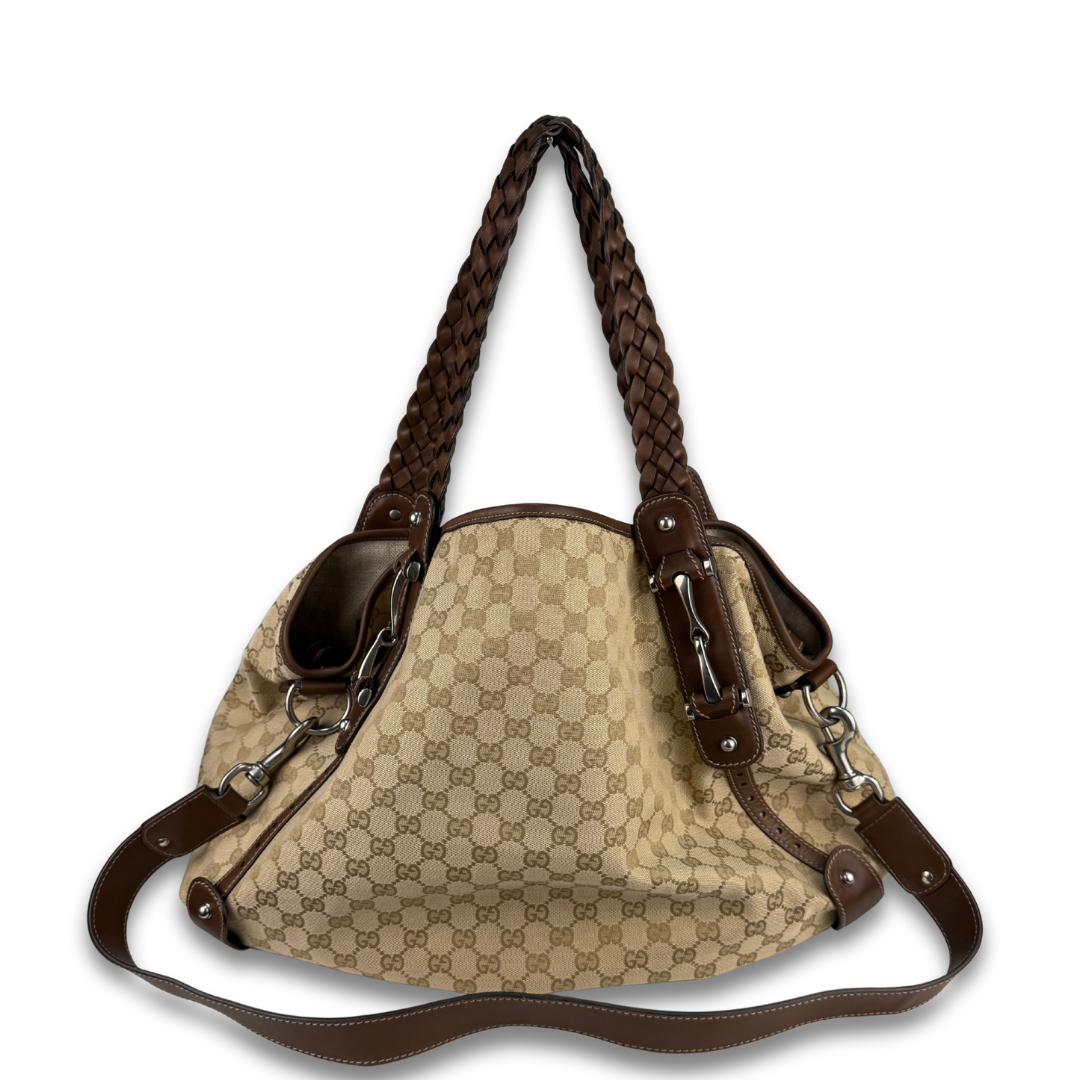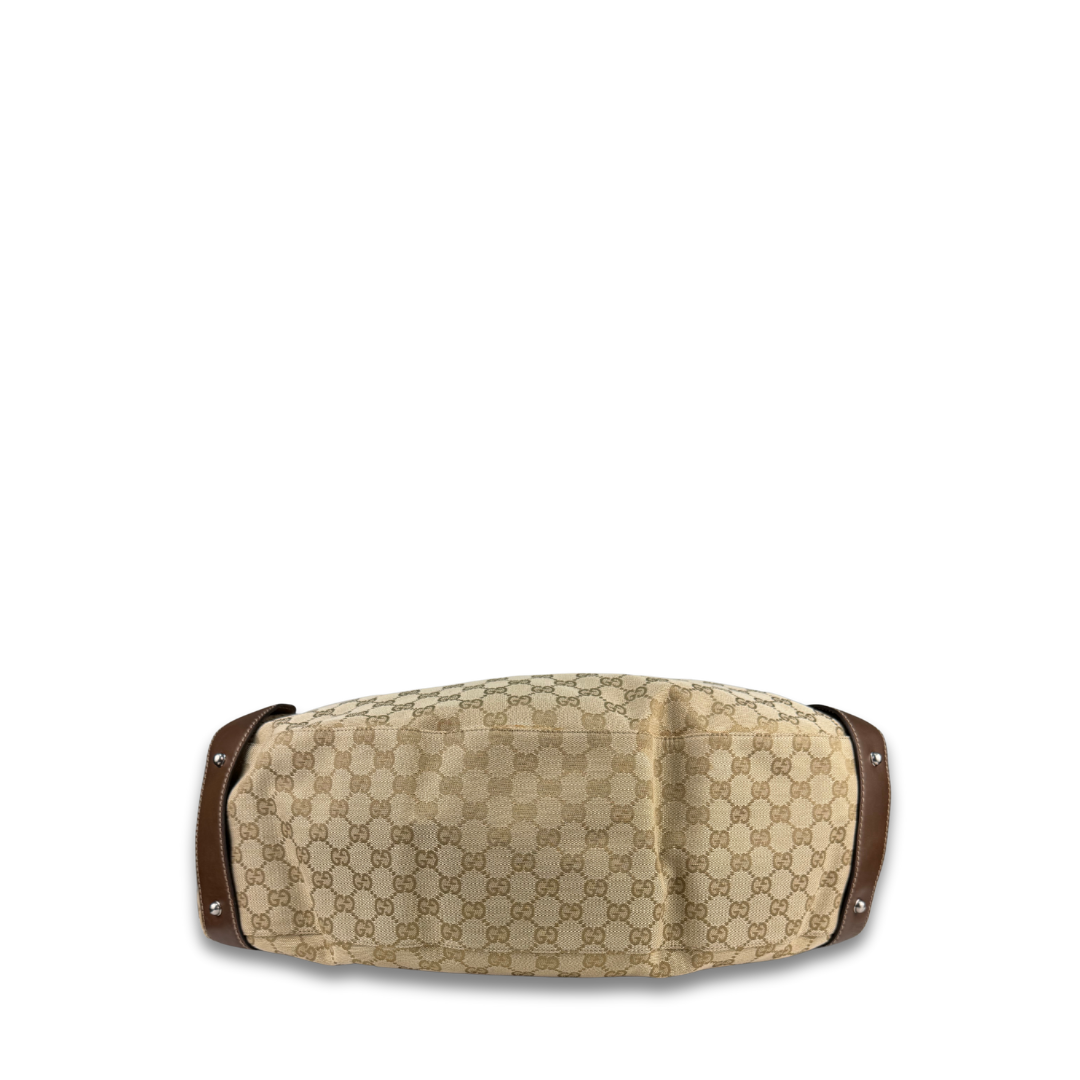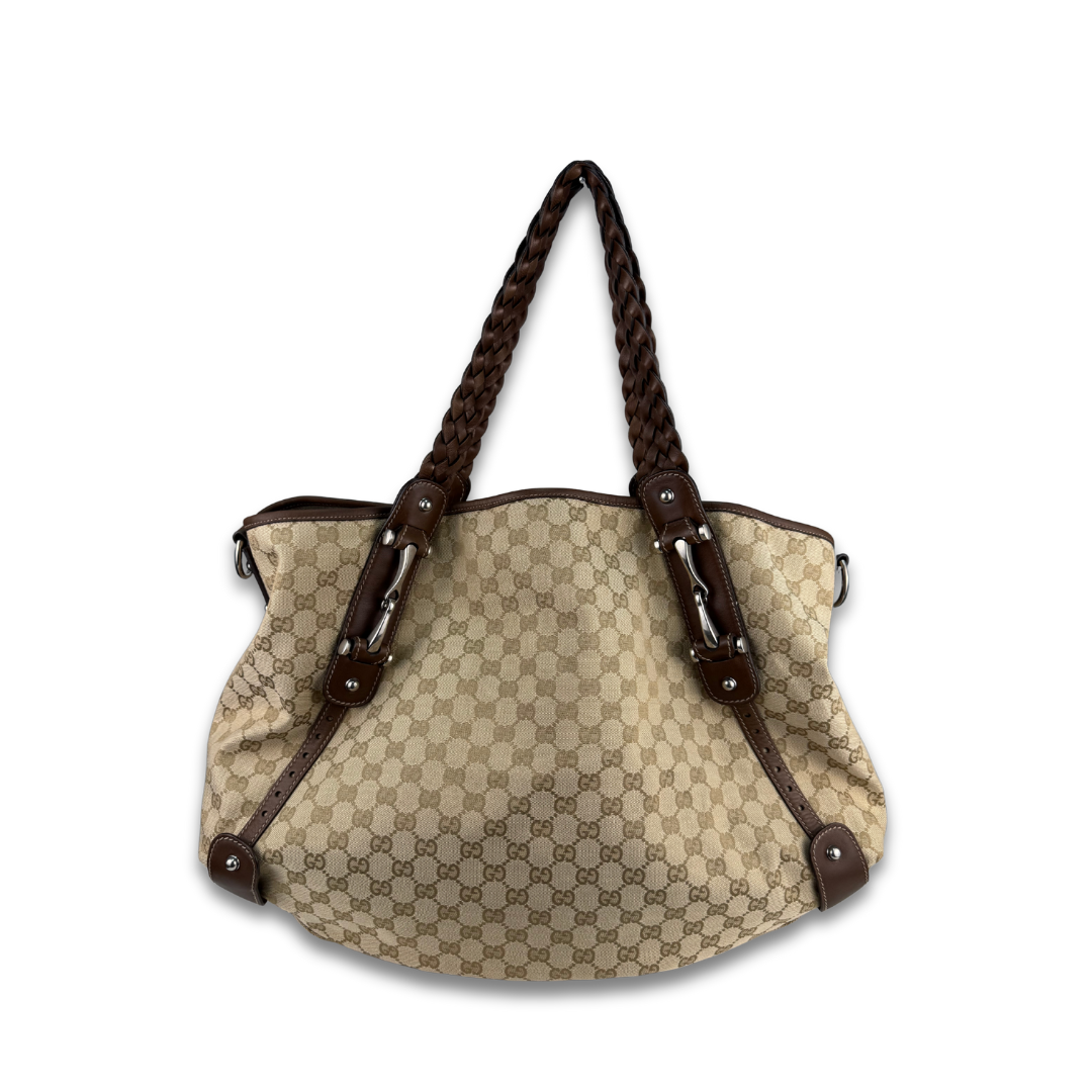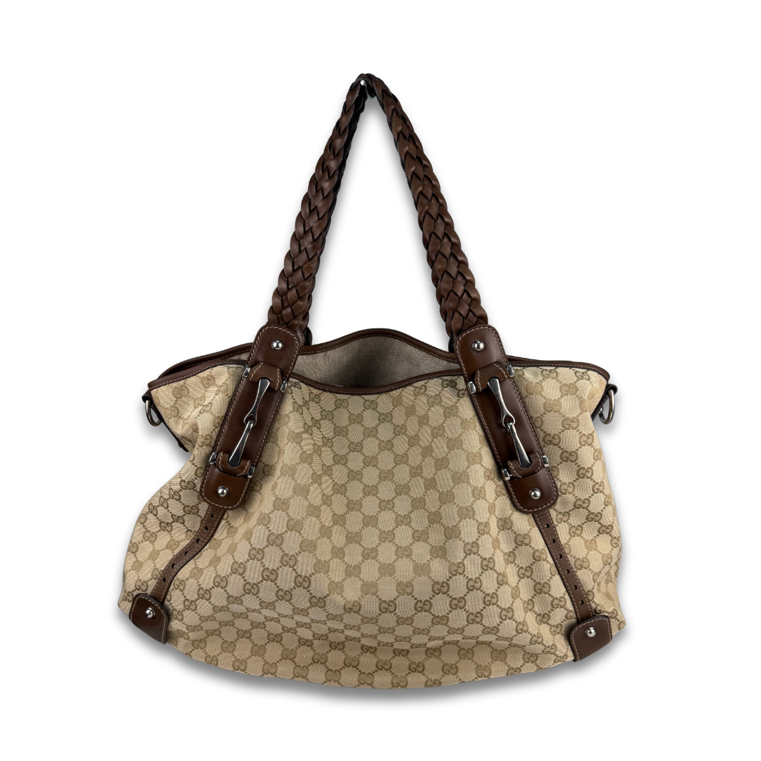 Brown and beige Gucci GG supreme canvas exterior with brown leather trim, beige fabric interior and silver-tone hardware. Features dual leather woven straps, detachable leather strap, open top, interior zipper pocket, and Gucci horsebit details and studs. Includes a certificate of authenticity.