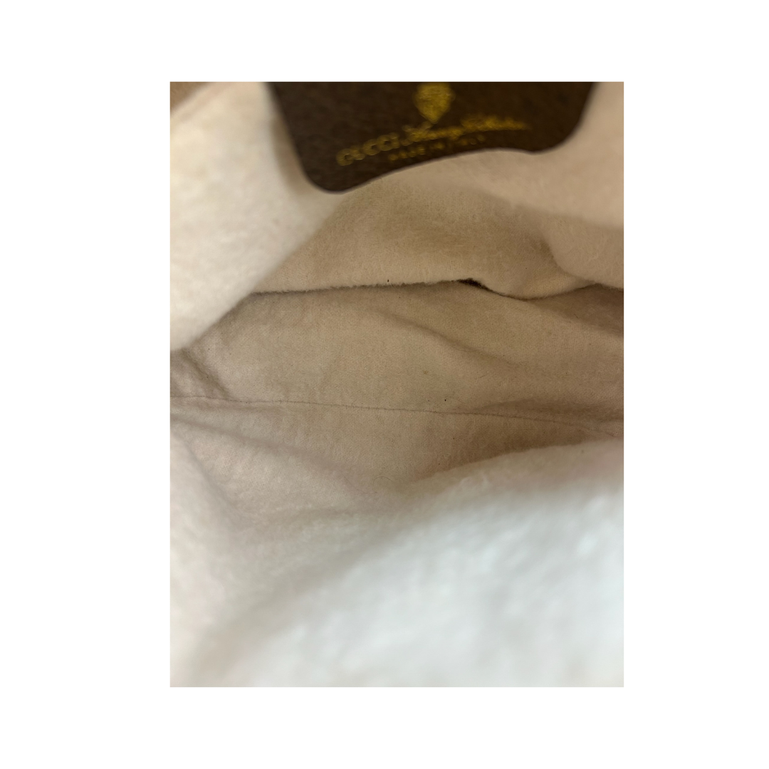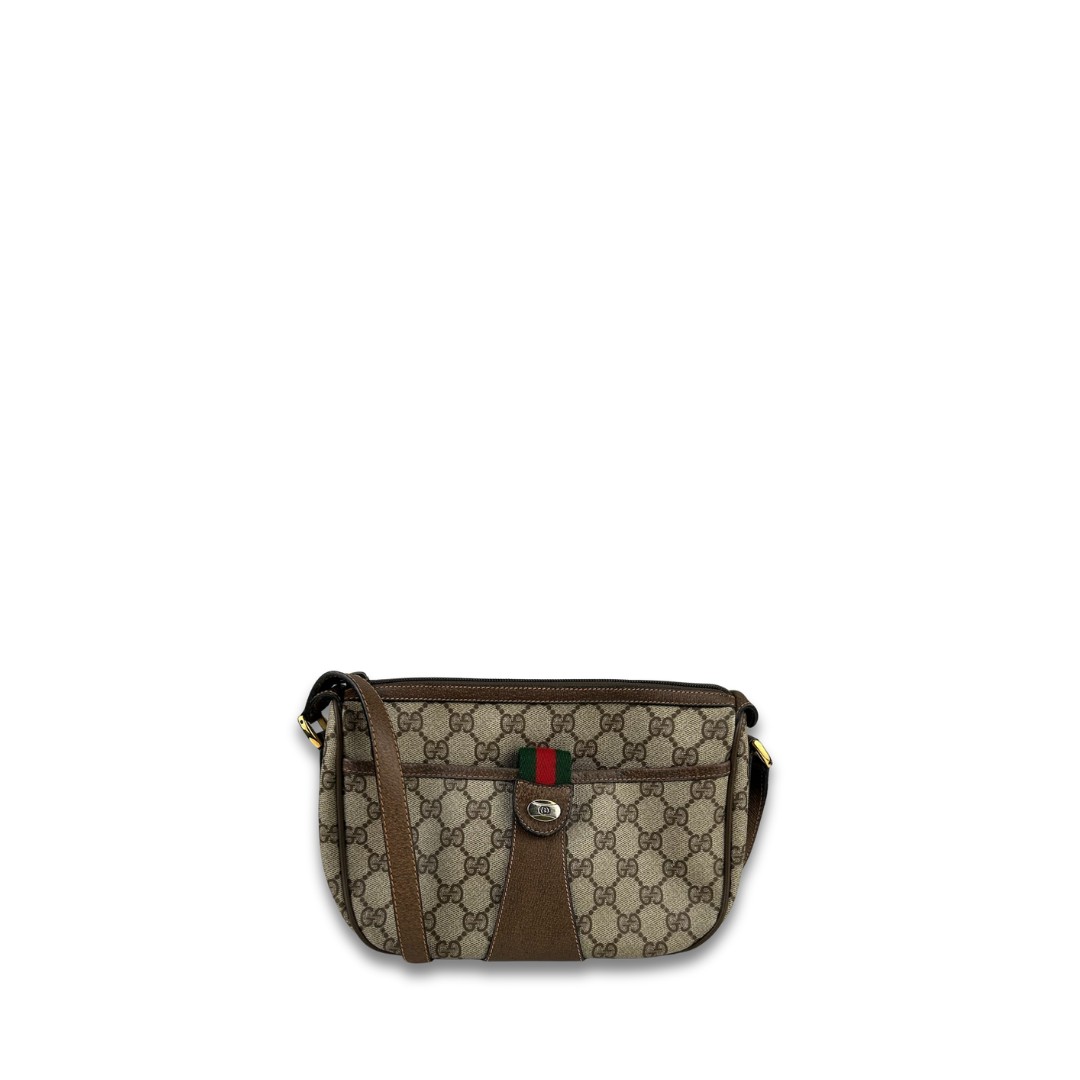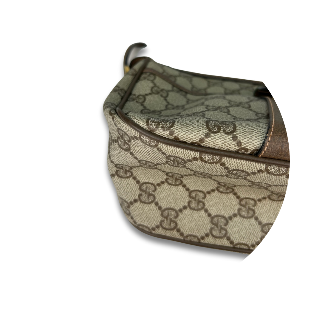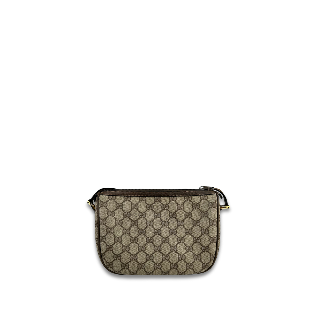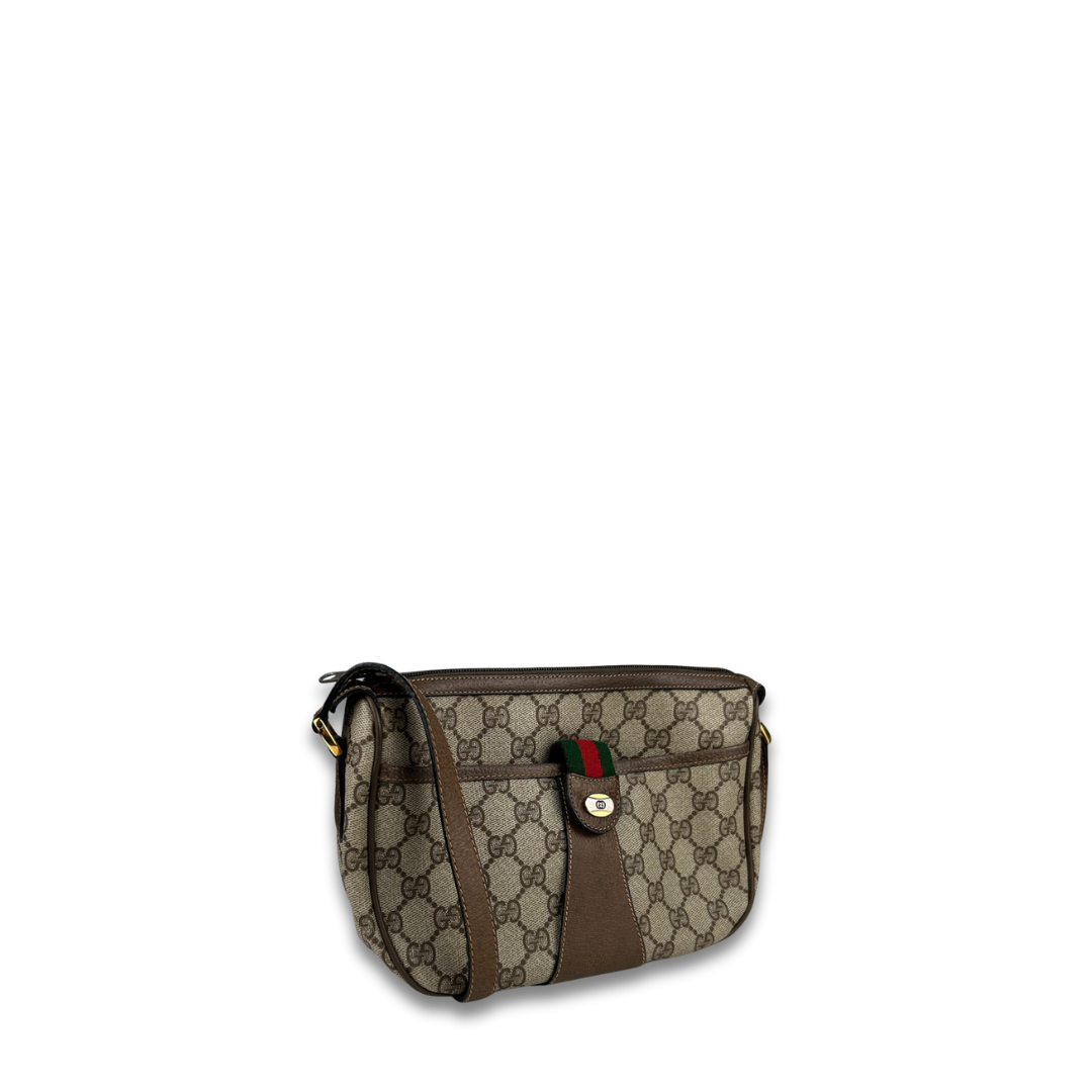 Brown and Beige Gucci GG Supreme coated canvas exterior with brown leather trim, beige microfiber interior, and gold-tone hardware. Features front exterior pocket, signature Gucci green and red web detail, zipper closure, adjustable leather shoulder strap, and interior zipper pocket. Includes certificate of authenticity.
