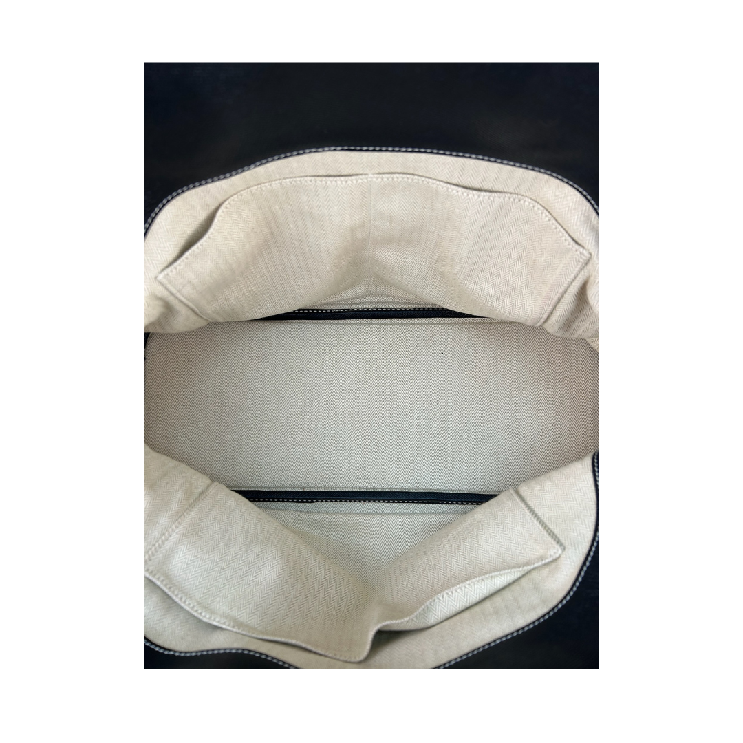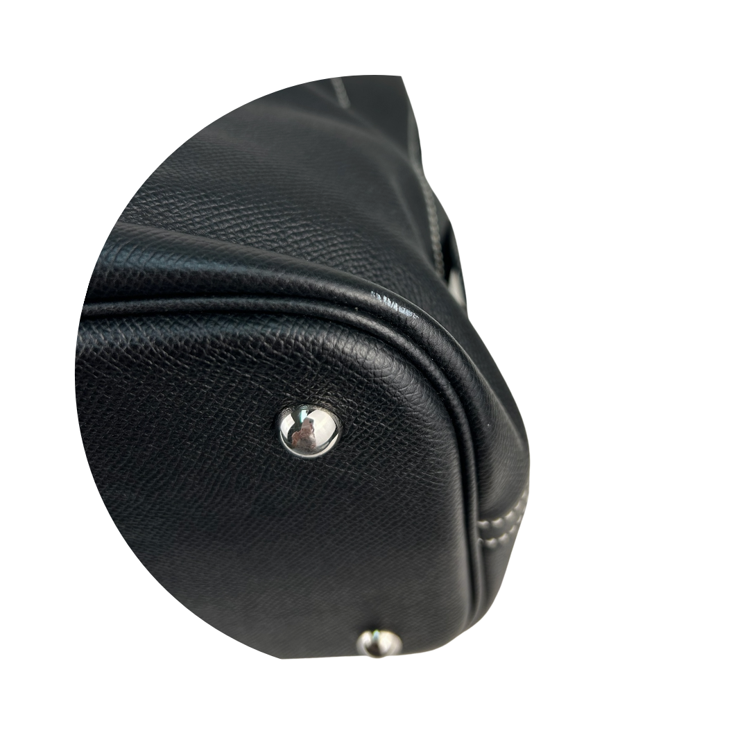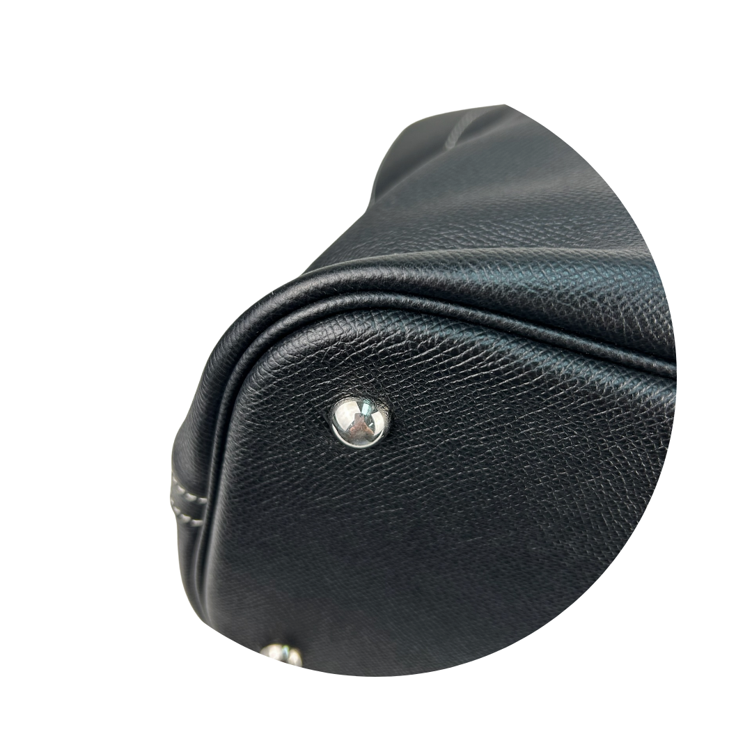 Black loose calfskin leather with white stitching, beige fabric, palladium hardware. Features dual leather top handles, zipper closure, key and lock, and interior pockets. Includes certificate of authenticity and original dust bag.