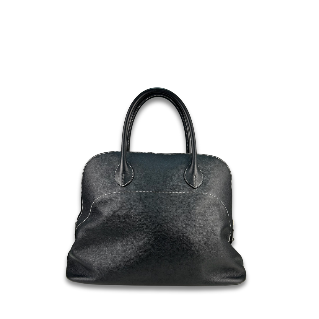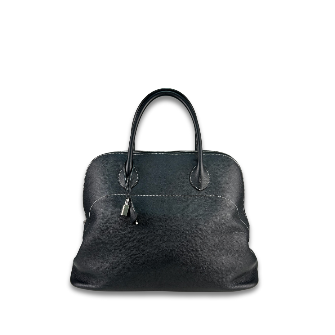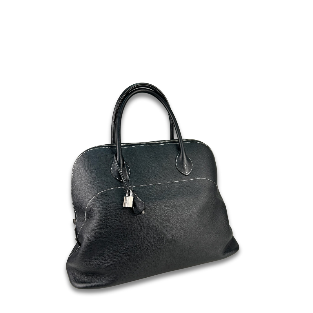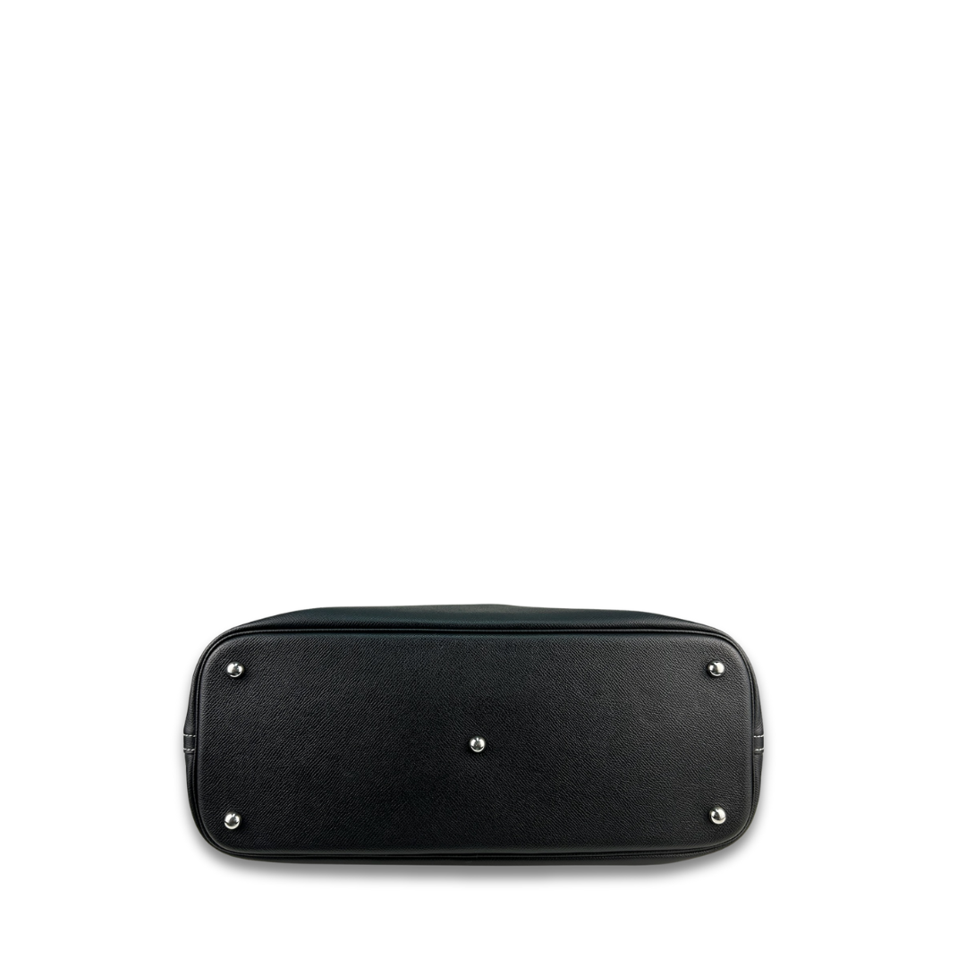 Black loose calfskin leather with white stitching, beige fabric, palladium hardware. Features dual leather top handles, zipper closure, key and lock, and interior pockets. Includes certificate of authenticity and original dust bag.