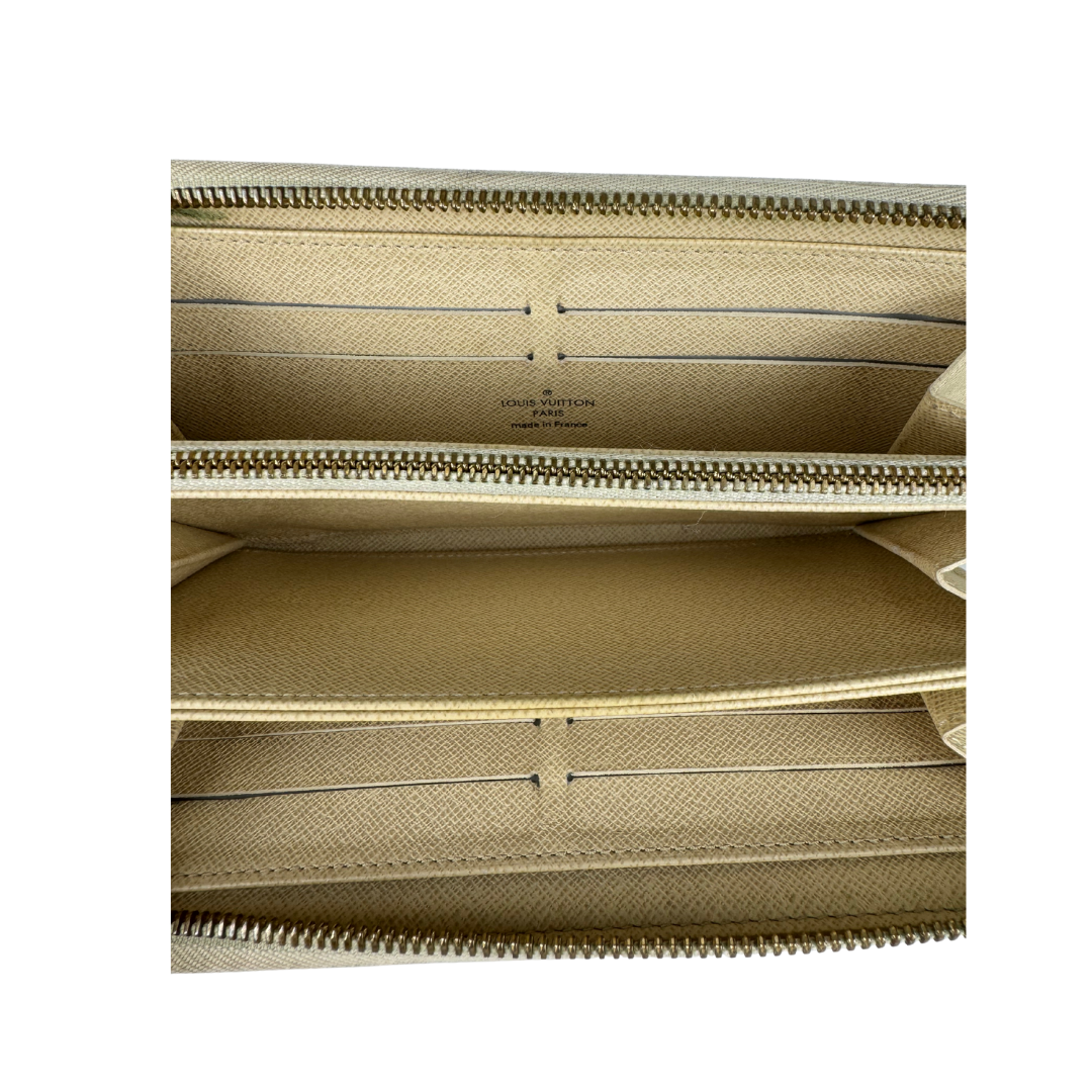 Classic LV Damier Azur coated canvas exterior with a cream crossgrain leather interior and polished gold-tone hardware. Features zip around closure, 12 card slots, 3 bill slots, 3 divided compartments, and a zipper change compartment. Please note, staining to canvas as pictured. Includes certificate of authenticity.