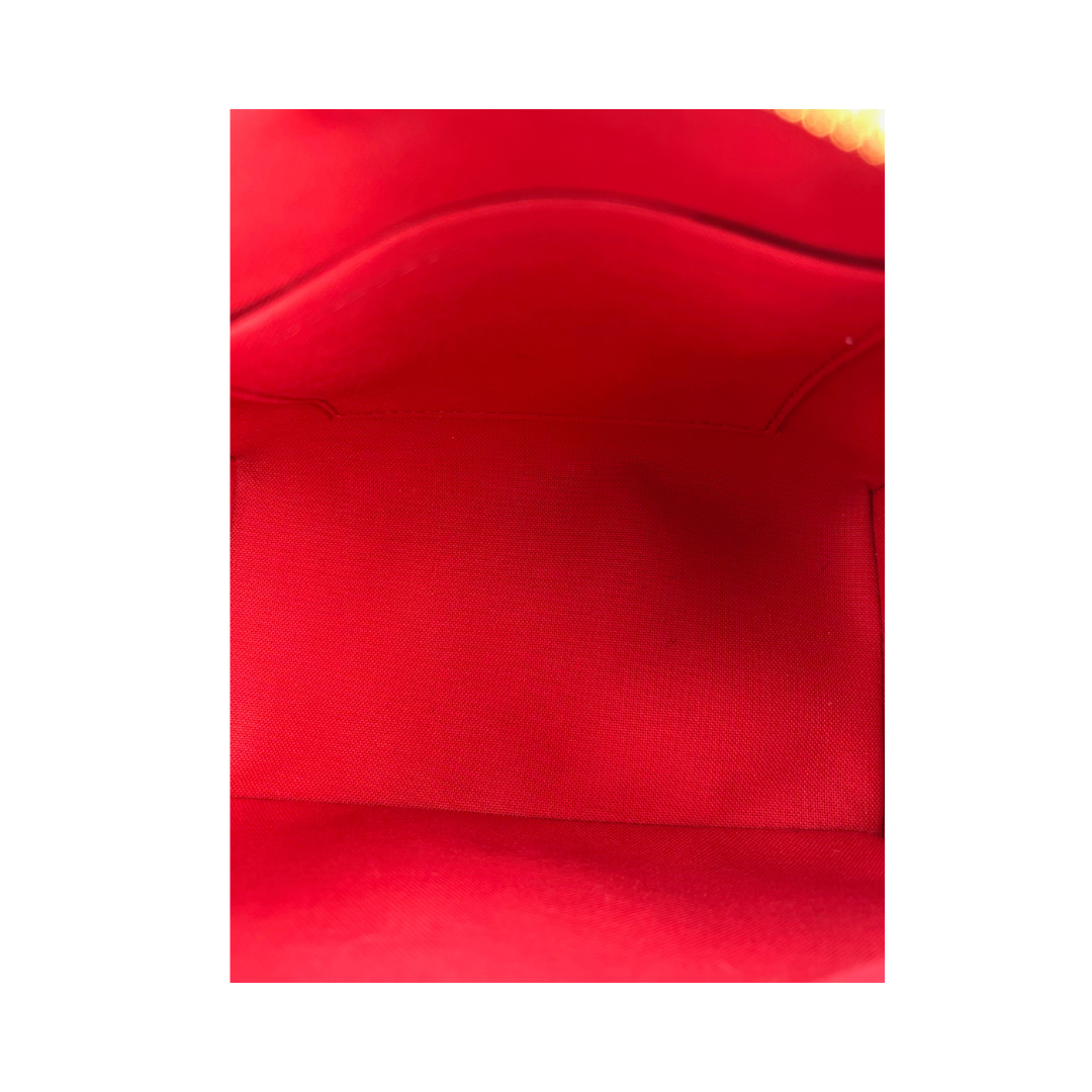 Classic LV Monogram coated canvas exterior with vachetta leather trim, red fabric interior, and gold-tone hardware. Features dual rolled top handles, zipper closure, interior pocket, and detachable and adjustable textile logo strap. Includes certificate of authenticity and original dust bag.