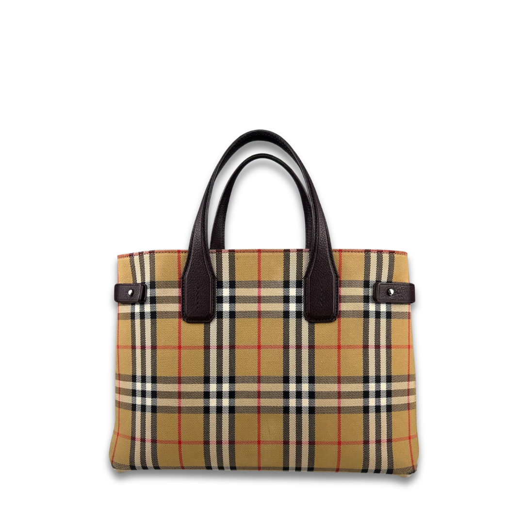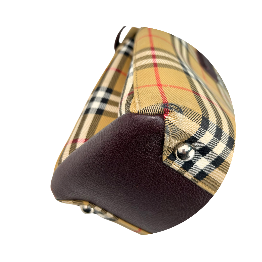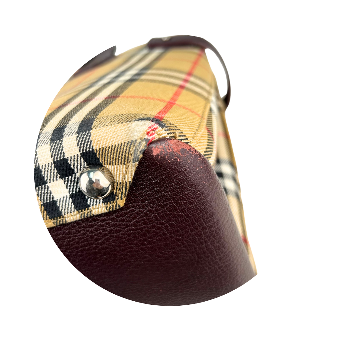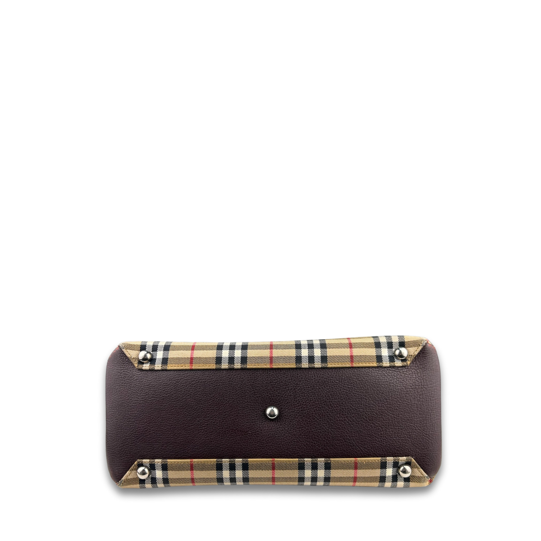 Burberry Check canvas exterior with dark burgundy leather trim, black canvas interior, and silver-tone hardware. Features dual leather top handles, side belt cinches, open top with two interior compartments separated by a central zipper pocket, and interior flat pockets. Please note, corner wear as pictured. Includes certificate of authenticity.