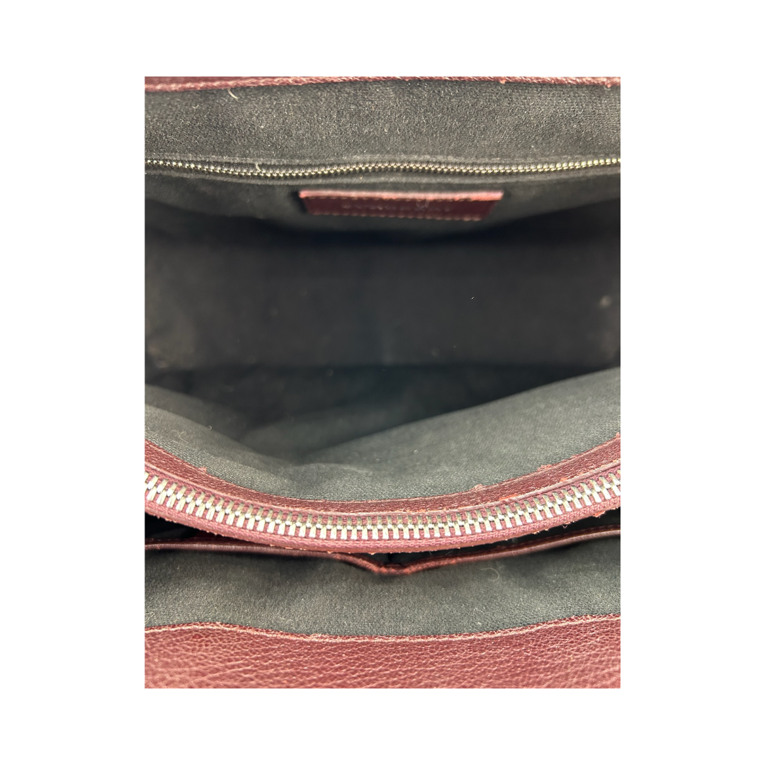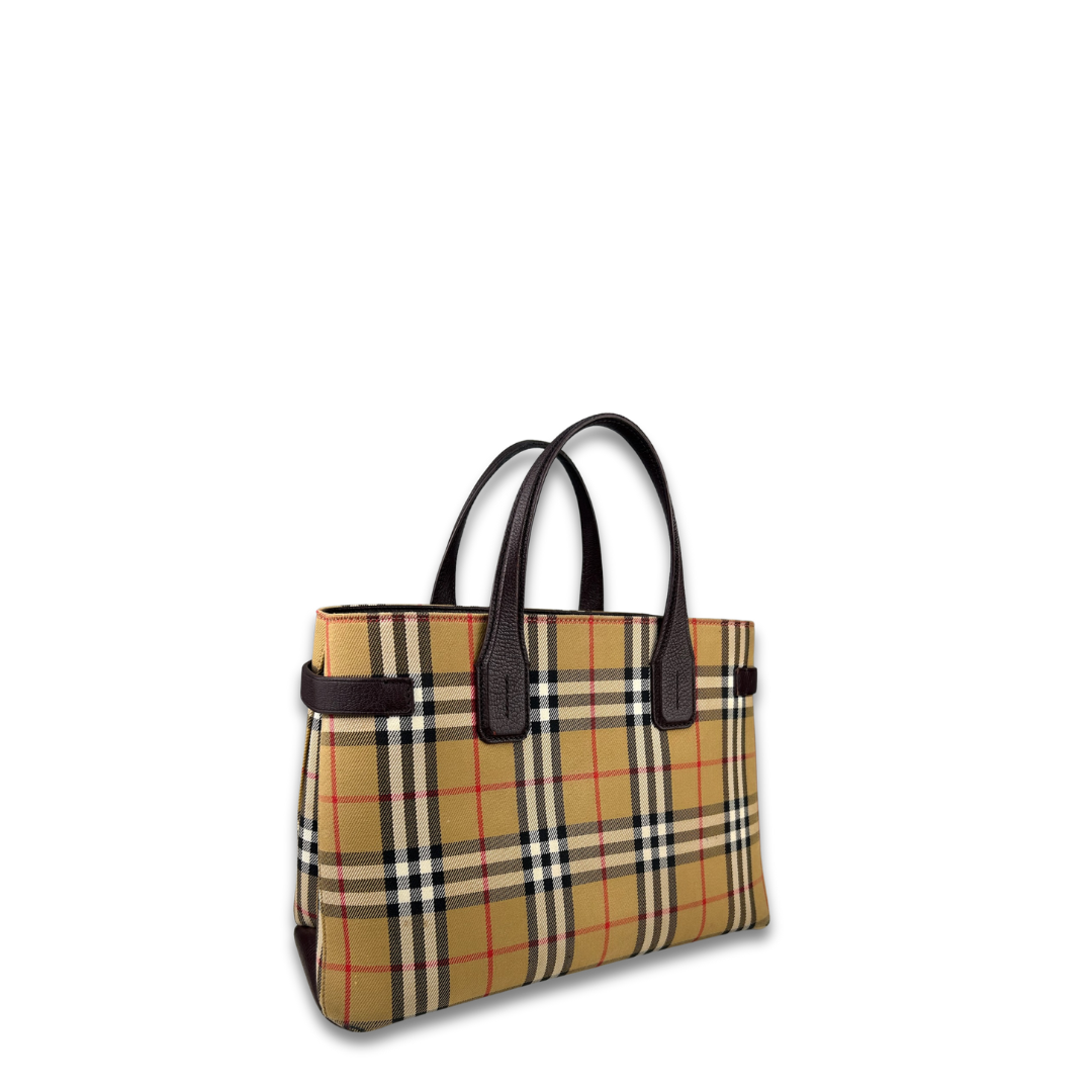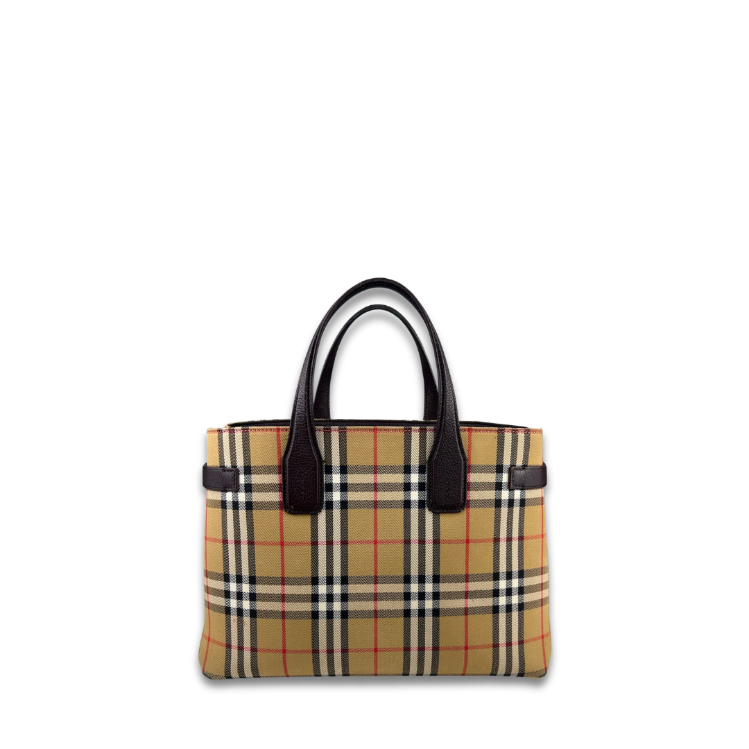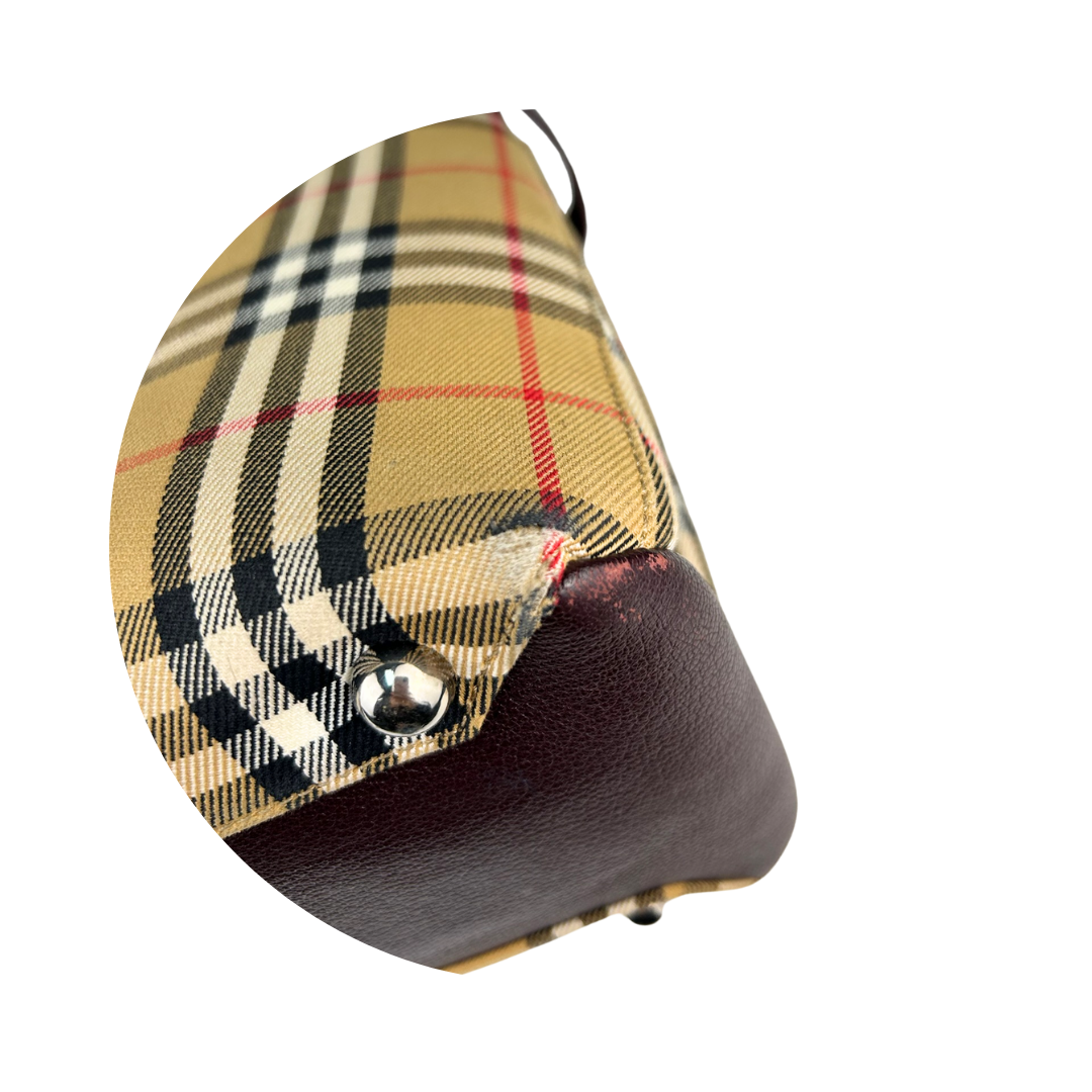 Burberry Check canvas exterior with dark burgundy leather trim, black canvas interior, and silver-tone hardware. Features dual leather top handles, side belt cinches, open top with two interior compartments separated by a central zipper pocket, and interior flat pockets. Please note, corner wear as pictured. Includes certificate of authenticity.
