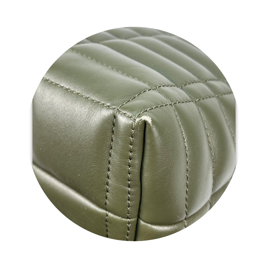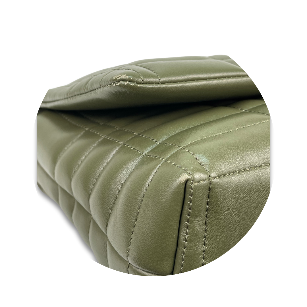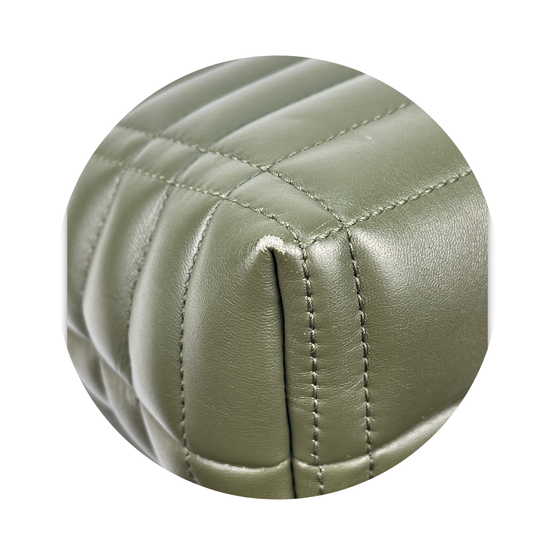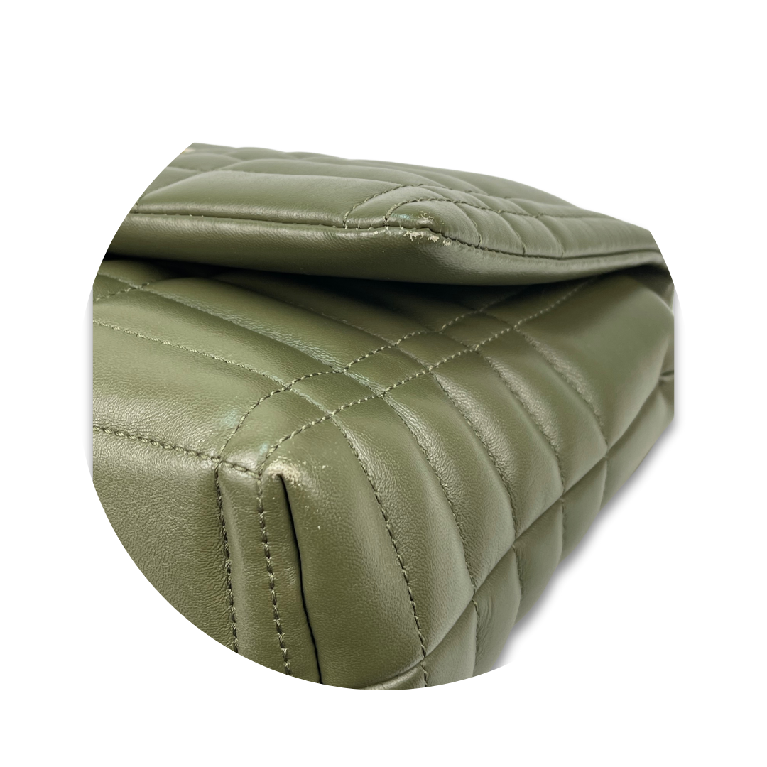 Dark Fern Green leather exterior with tonal nylon interior and gold-tone hardware. Features leather top handle, gold-tone chain strap, magnetic snap closure, interior pocket, and interior zipper pocket. Please note corner wear and faint scratching on hardware. Includes certificate of authenticity and original dust bag.